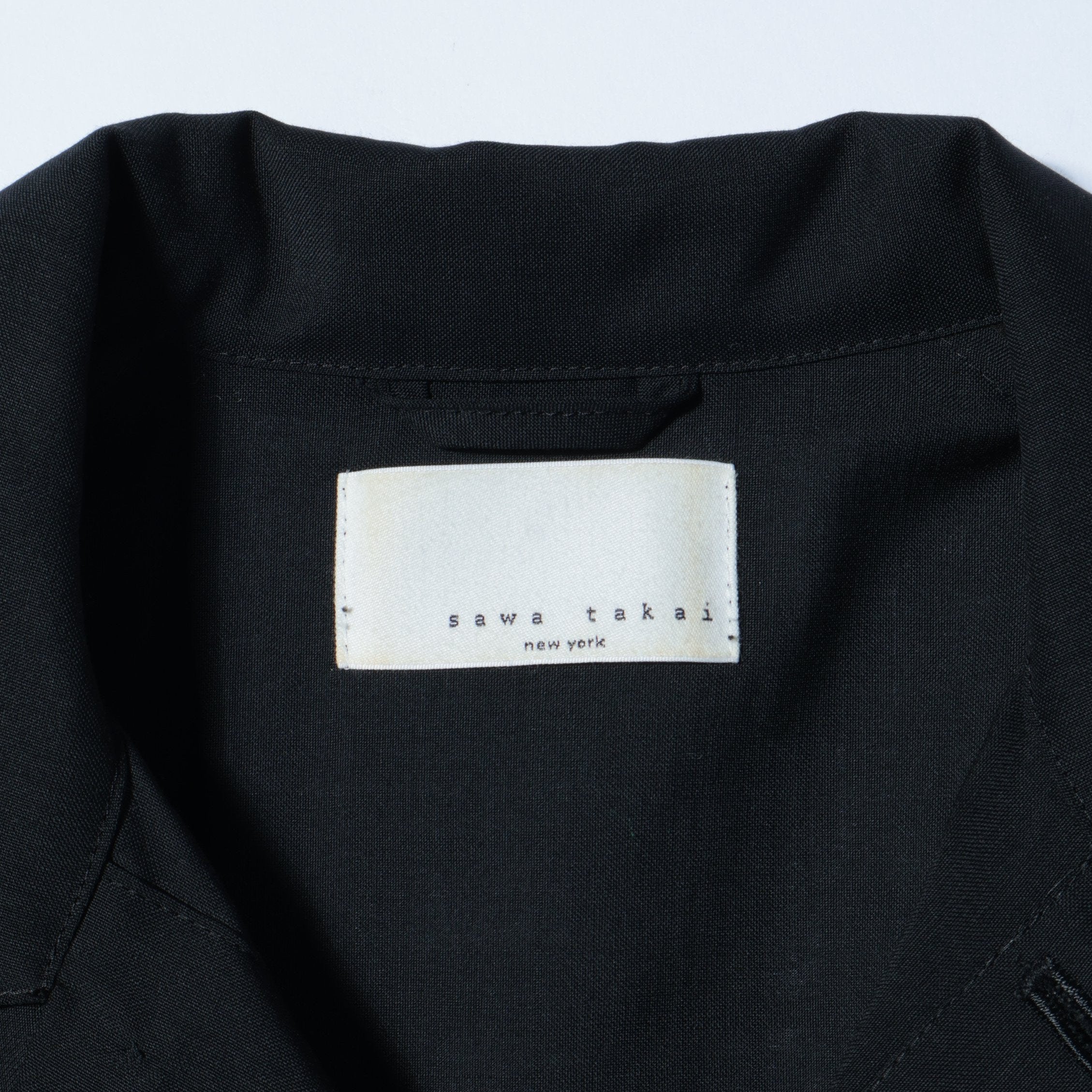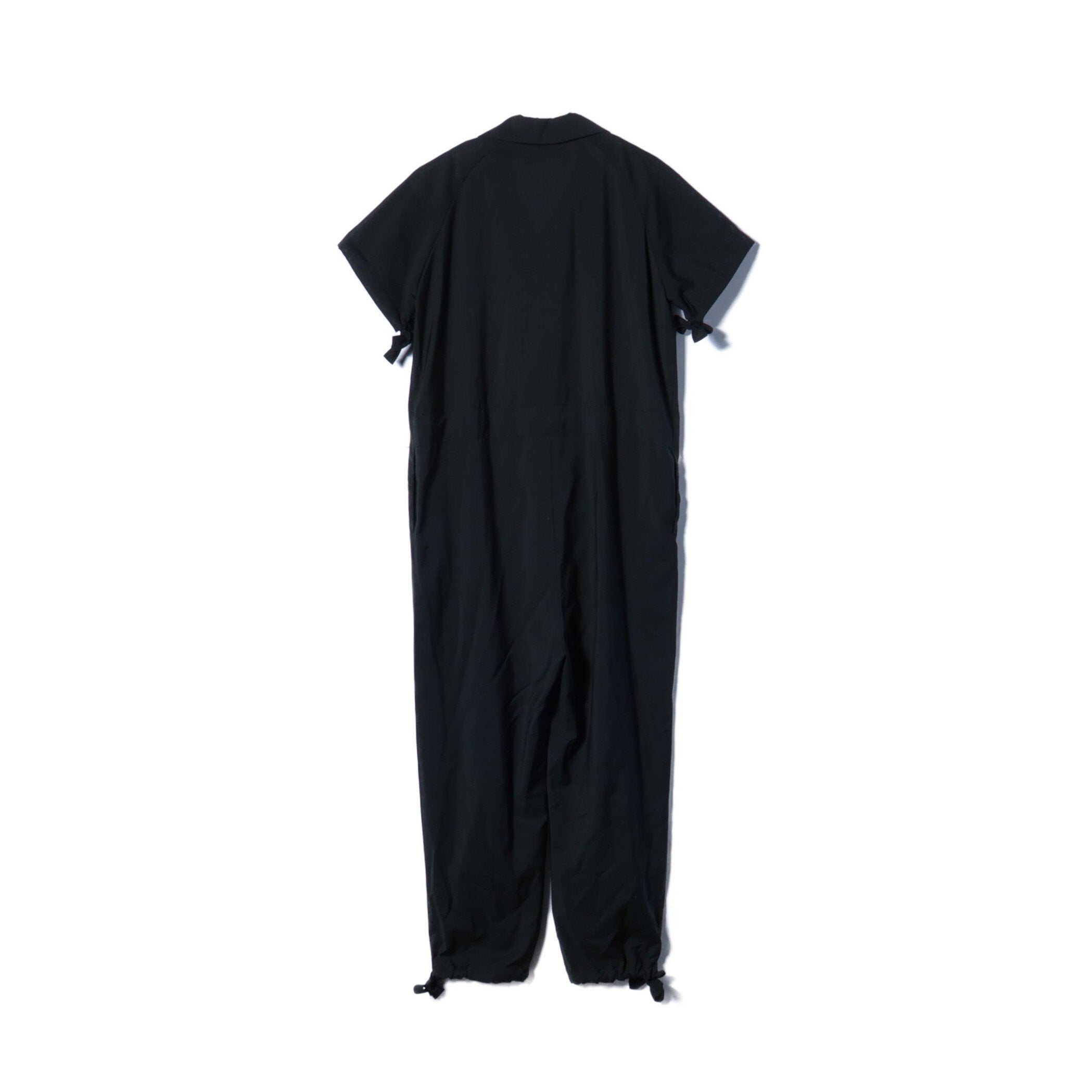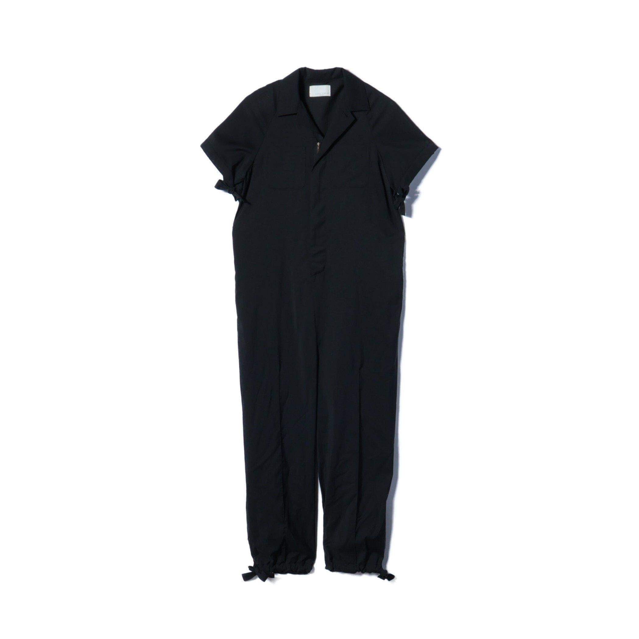 ウール素材のジャンプスーツ。シンプルなデザインだからこそ、シルエットの美しさが際立っています。裾の紐でシルエットのアレンジが可能です。