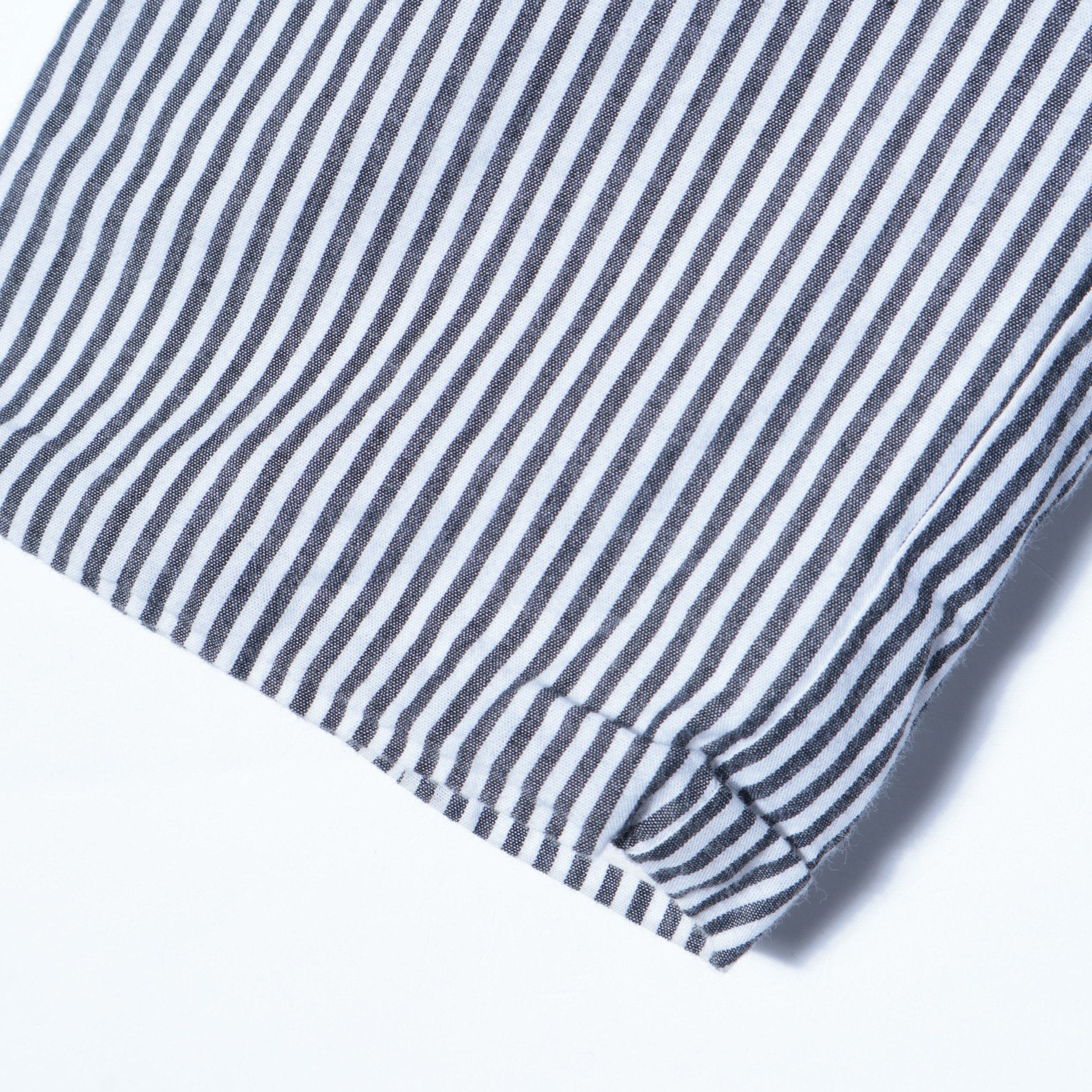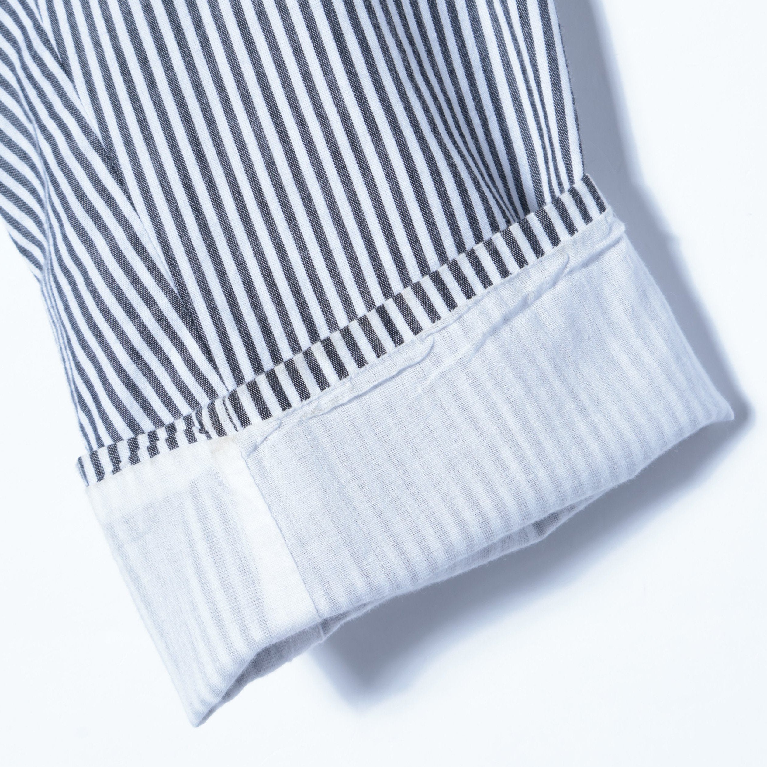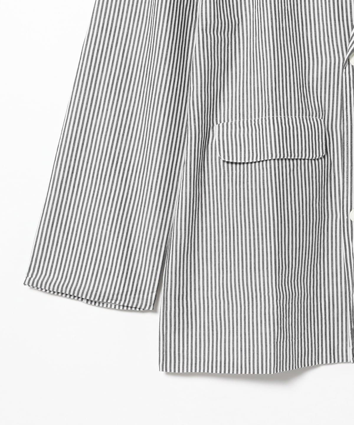 清涼感がありながらモダンな印象もあるストライプ生地を使用した、ダブルブレストのシャツジャケット。『KINGSTONE JACKET』というブランド定番のボックスシルエットを採用しており、広めにとられた身幅やアームホールにより抜け感を演習します。フェード感のあるデニムからスラックスまで、幅広くスタイリングを組みやすいジャケットです。