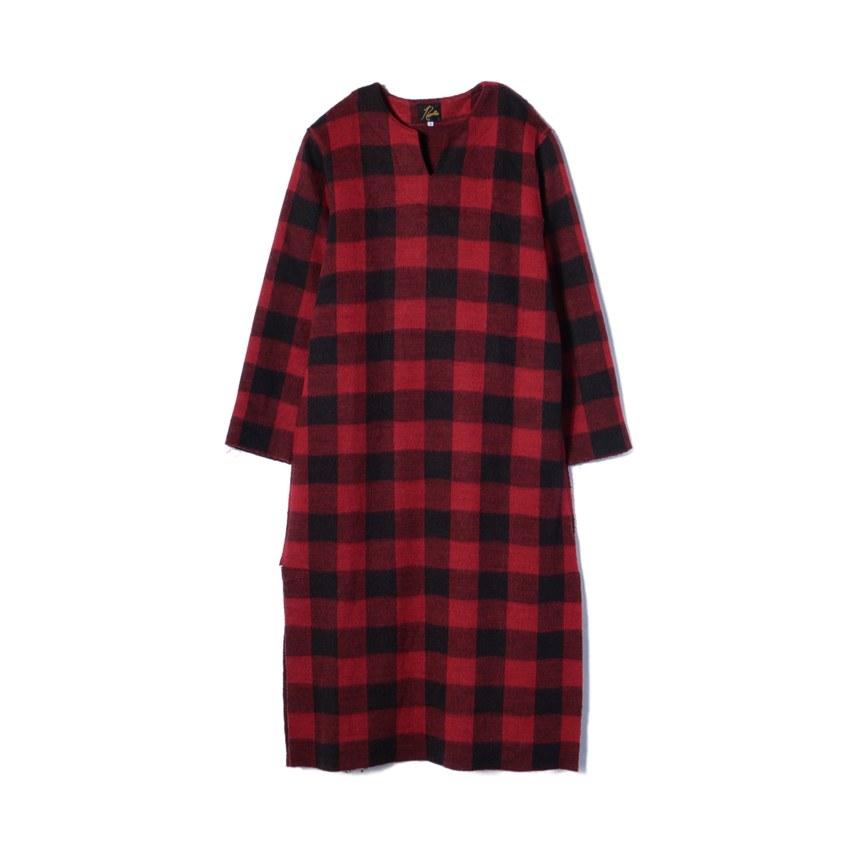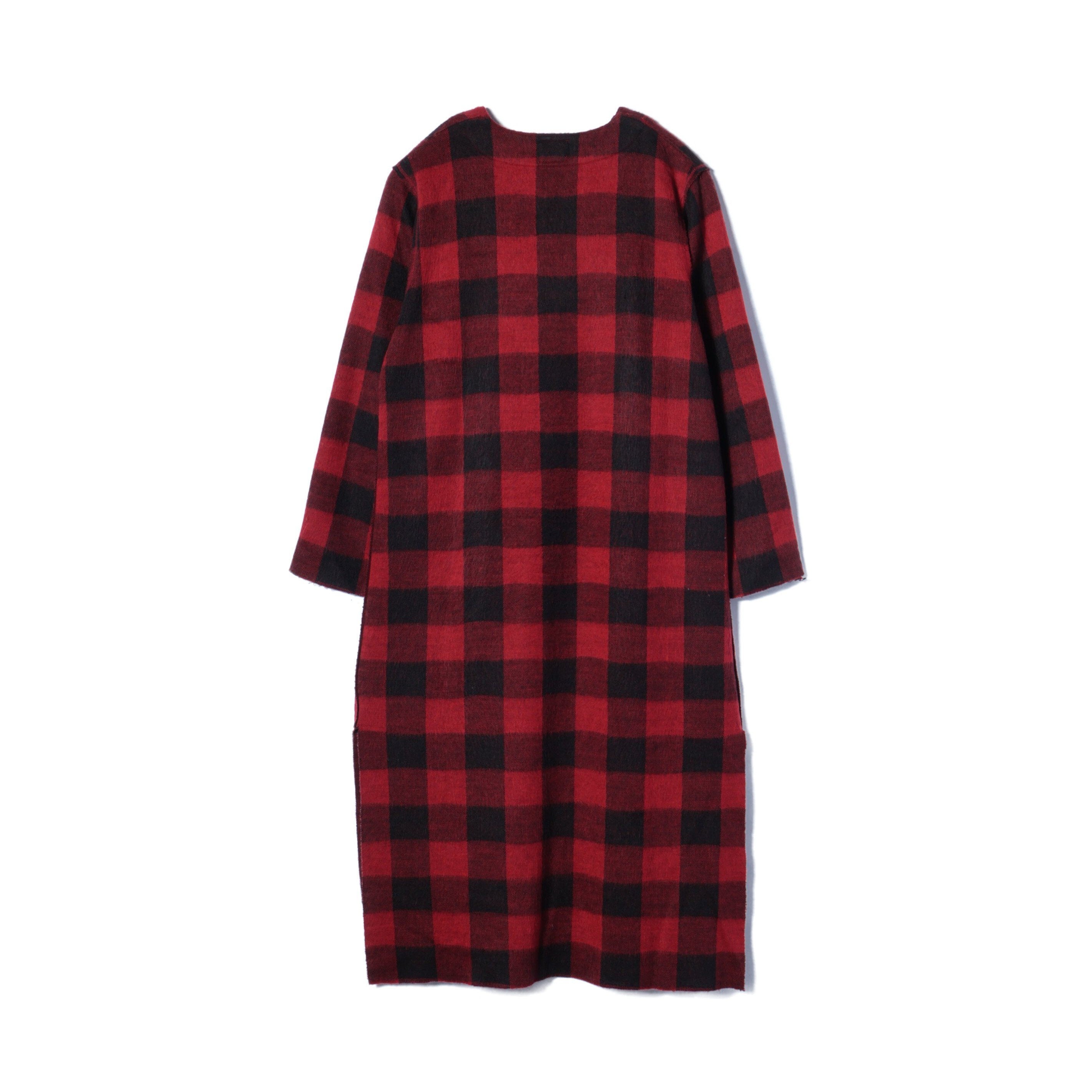 ブロックチェックのワンピース。アメカジの定番柄も、ワンピースに落とし込むと雰囲気がガラリと変わります。インナー使いにもおすすめです。