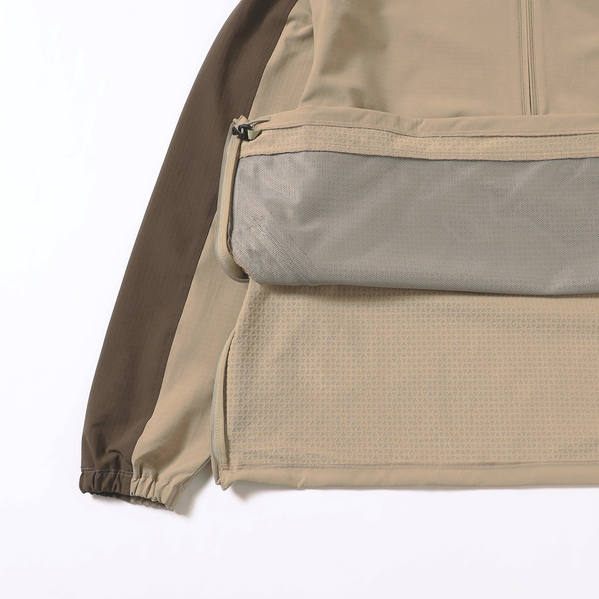 撥水、2WAYストレッチ、透湿性、防しわ性をあわせもつ機能素材STORMFLEECE(R)を採用。熱が内部にこもることを抑え、気温や湿度が高い環境でも着やすい仕上がりに。くわえて裏はジオメトリック柄で凹凸のある構造になっており、肌への接地面が少ないため快適な着用感を実現。適度なハリ感がワイドなシルエットを立体的にみせながらも、縦横の2方向へ伸縮する2WAYストレッチ性も備えているので動きやすいのもポイントです。