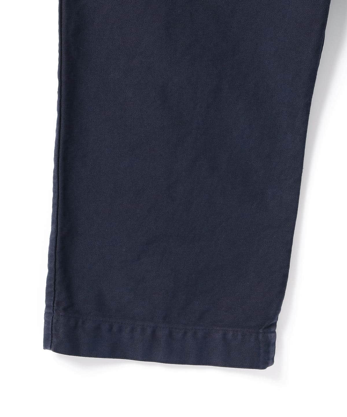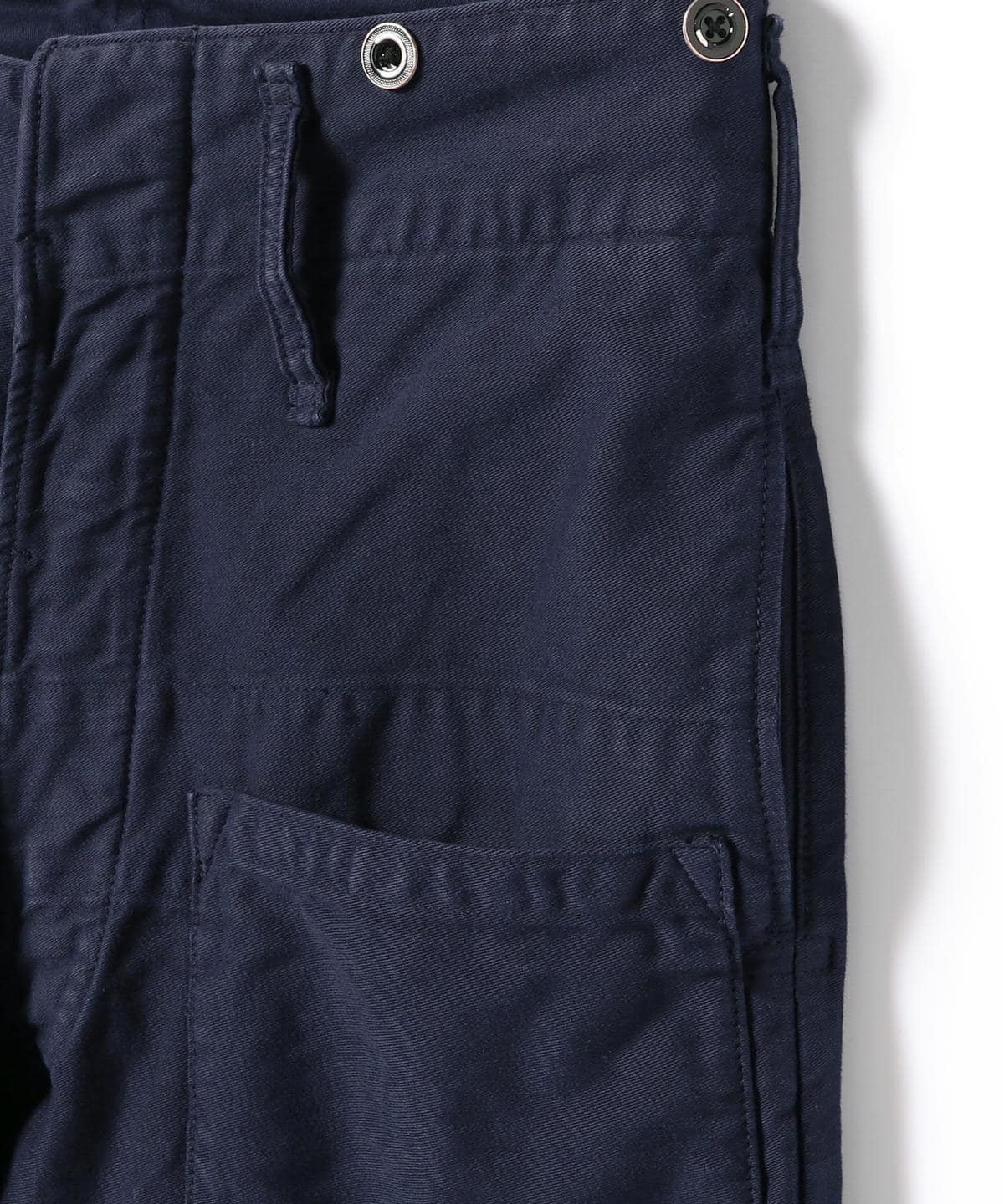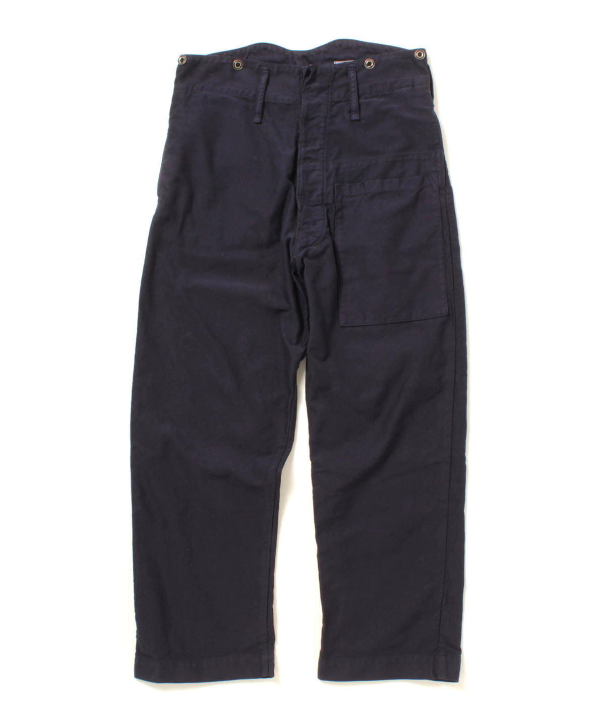 1940年代、イギリス海軍パンツをモデルに〈orSlow(オアスロウ)〉と共同製作した一本。深いインディゴネイビーが味のある表情を生み出します。デザインのアクセントにもなるサスペンダーボタンは残しつつ、ベースとなったモデルにはついていない右のバックポケットを増やして、より存在感を増すデザインとなりました。春夏シーズンなら、明るい色のトップスを合わせて、軽やかなコーディネートをお楽しみいただいてはいかがでしょう。