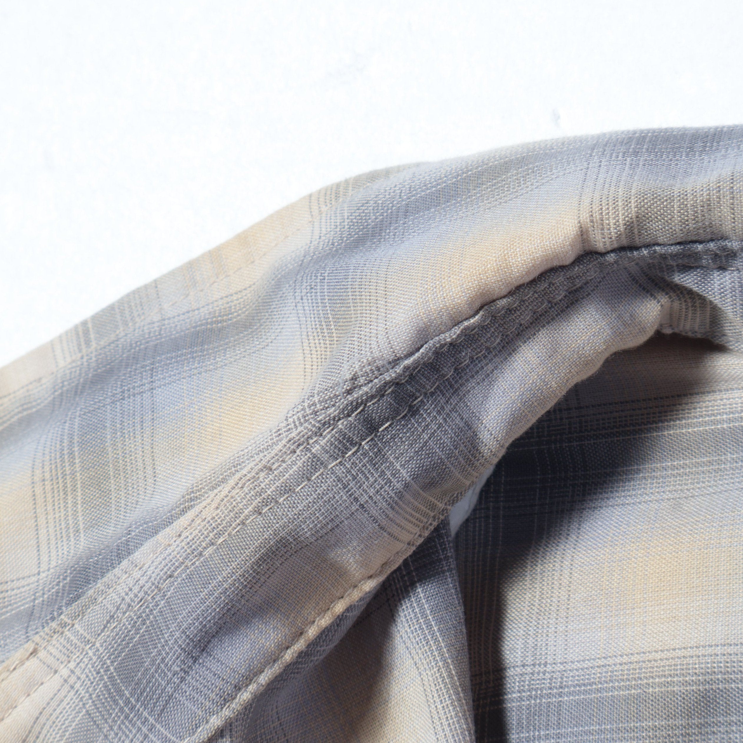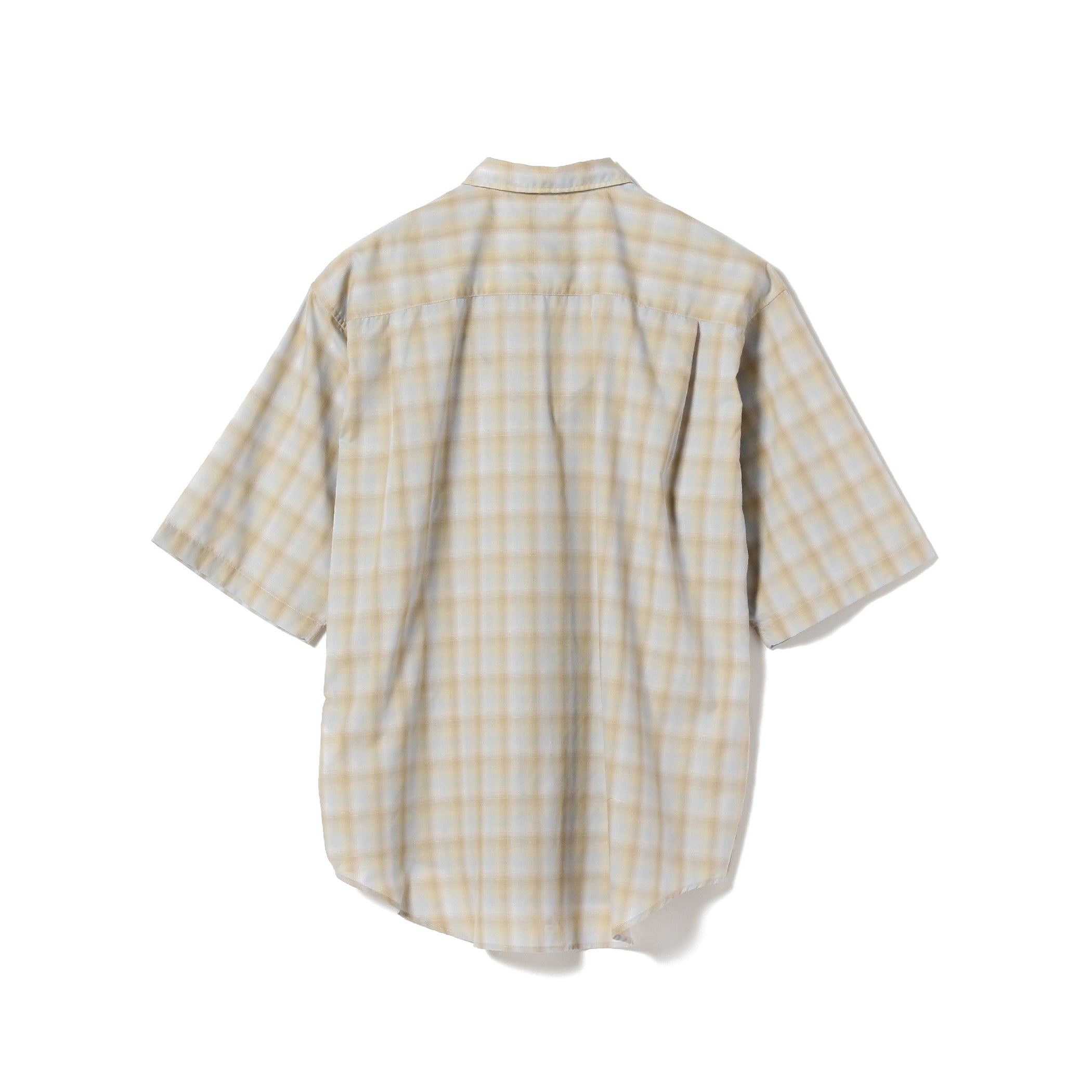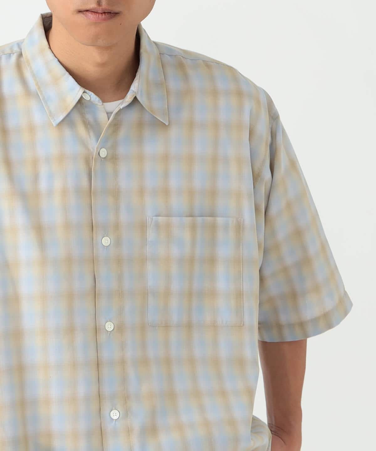 コットンポリエステルのオンブレチェック素材を使用した『EASY-FIT』のミニレギュラーシャツ。70年代頃のヴィンテージシャツに見られる、甘織りの透け感のあるコットンポリエステルチェックを現代解釈で再現した素材を使用。当時の素材イメージを残しつつ打ち込みを調整。透け感を程よく抑え、アップデートした1枚。ただビッグシルエットなだけでなく、首回りは極力ボディに沿う様に設定しメリハリのあるシルエットに仕上げました。