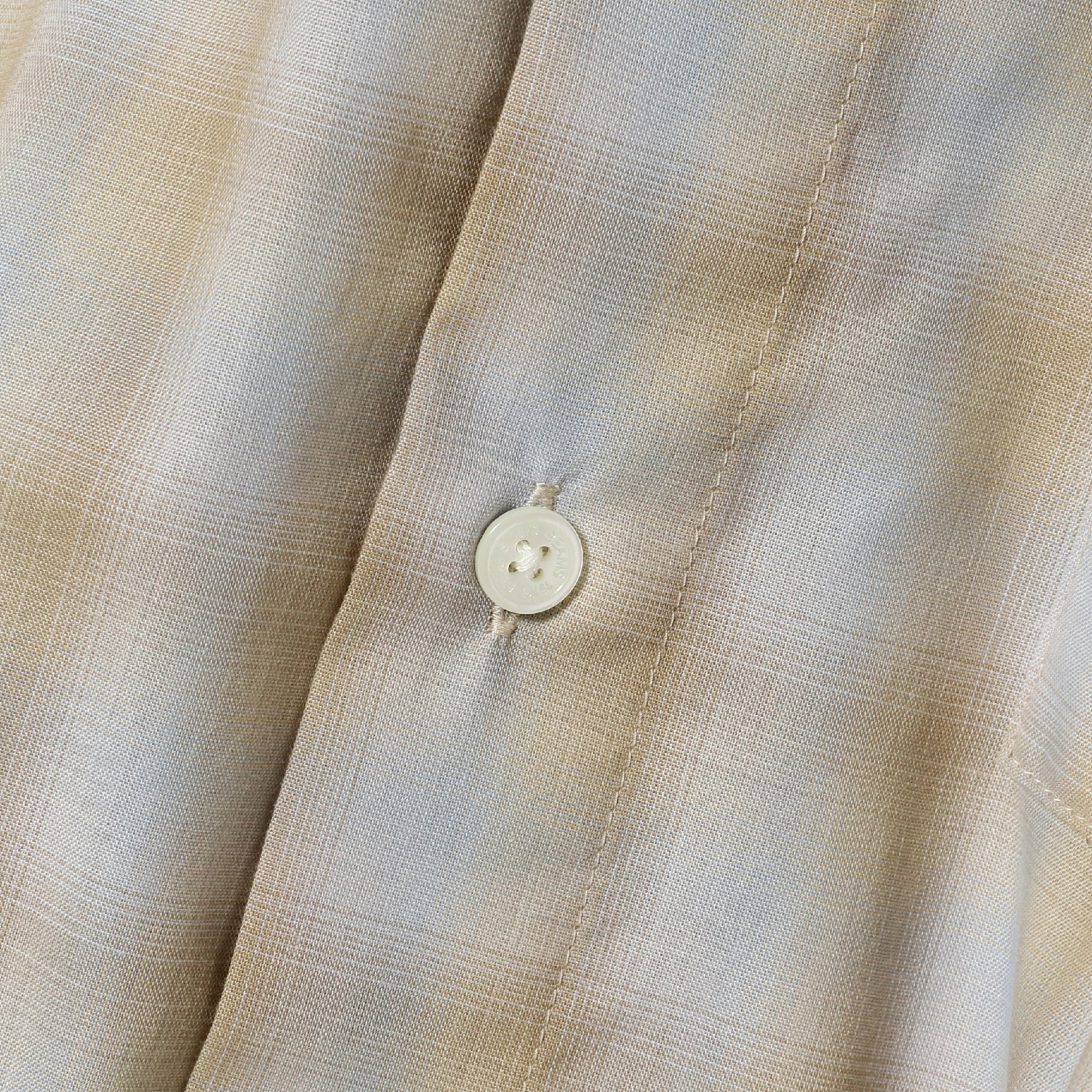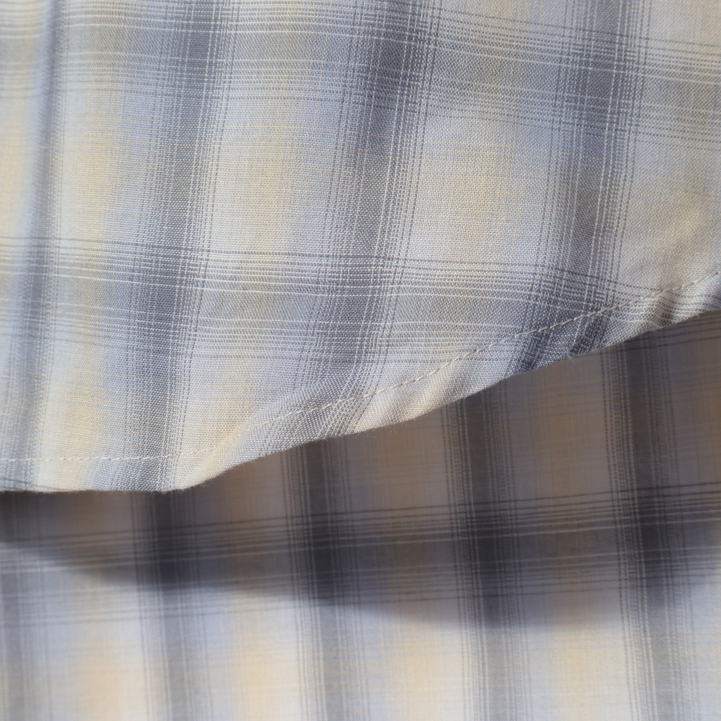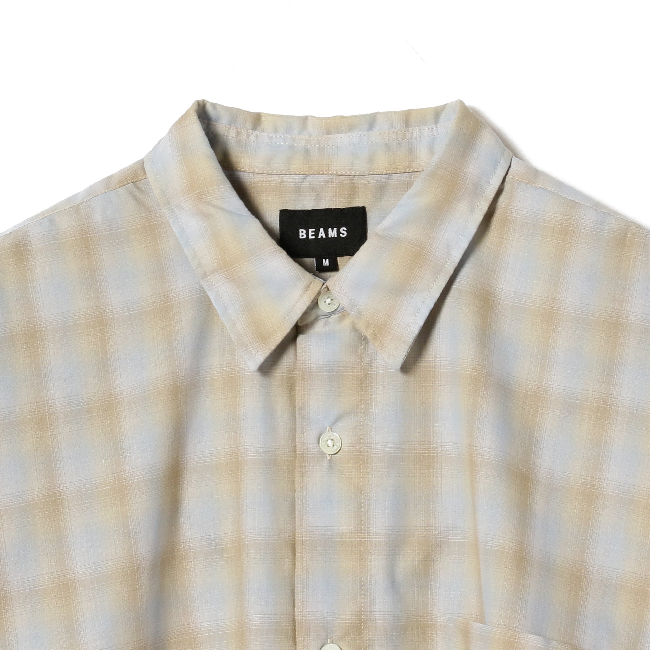 コットンポリエステルのオンブレチェック素材を使用した『EASY-FIT』のミニレギュラーシャツ。70年代頃のヴィンテージシャツに見られる、甘織りの透け感のあるコットンポリエステルチェックを現代解釈で再現した素材を使用。当時の素材イメージを残しつつ打ち込みを調整。透け感を程よく抑え、アップデートした1枚。ただビッグシルエットなだけでなく、首回りは極力ボディに沿う様に設定しメリハリのあるシルエットに仕上げました。