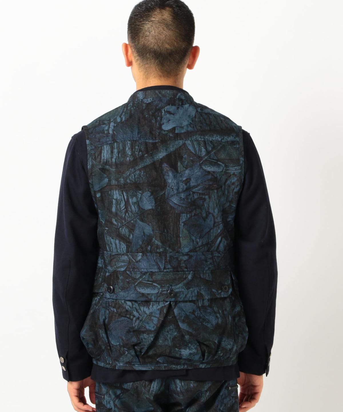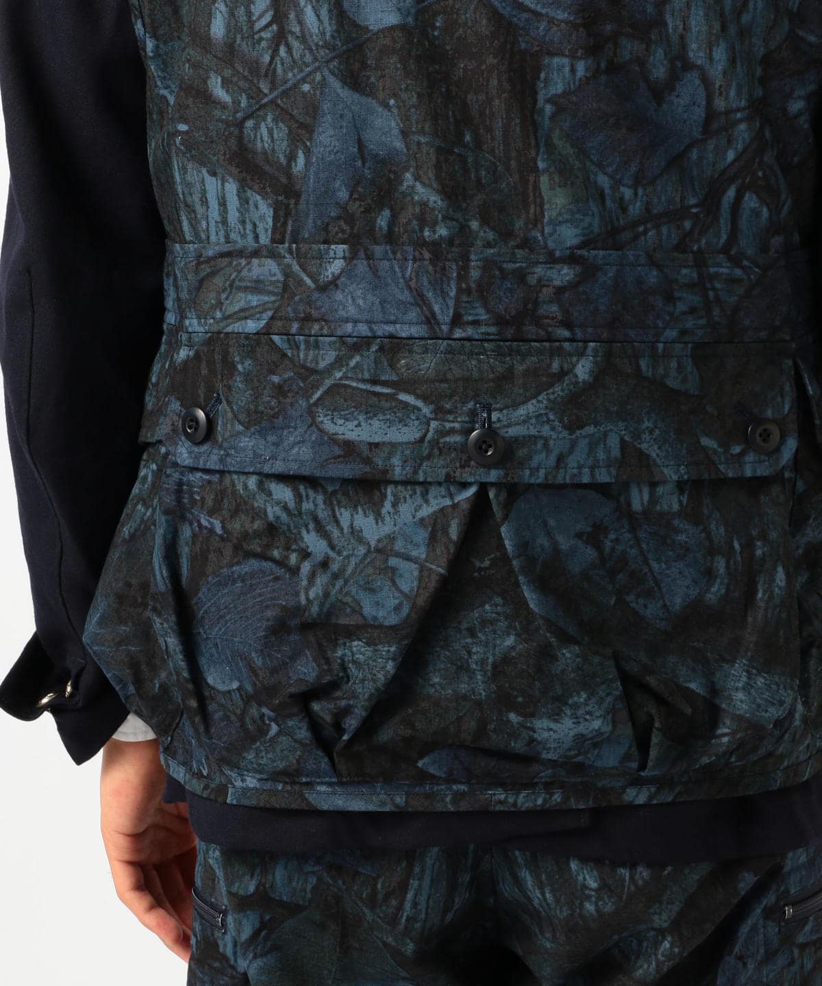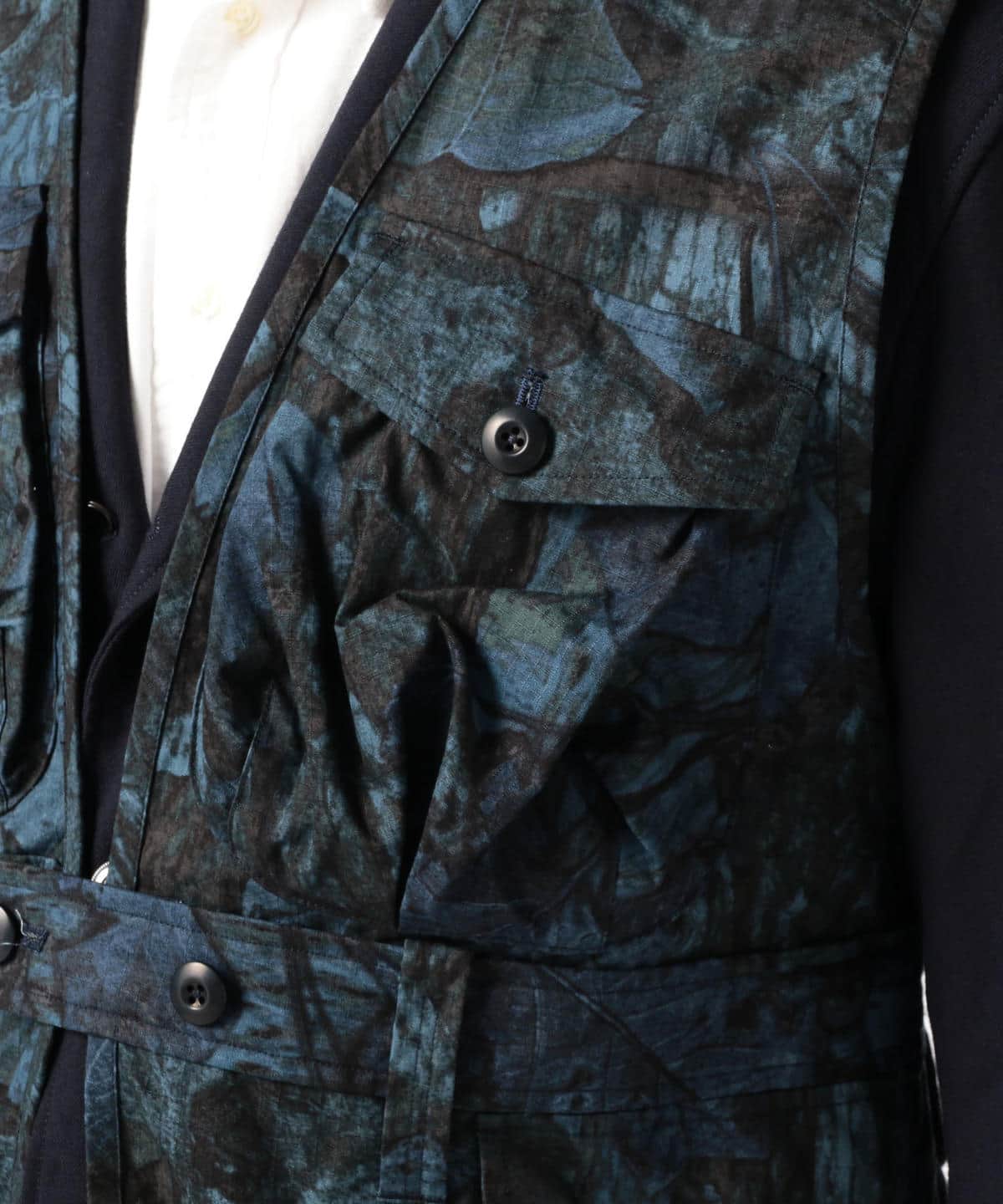 ブランドではお馴染みのアイテムであるフィールドベストを〈BEAMS PLUS〉で別注。軽くて丈夫なコットン100%のリップストップにリーフカモフラージュ柄をプリントして雰囲気抜群に仕上がりました。収納力のあるサイドポケットやフラップ付きの背面ポケット、サイズ調整が可能なベルトなど、こだわりのディテールにも注目。インナー、アウターどちらでもコーディネート可能なアイテムです。
