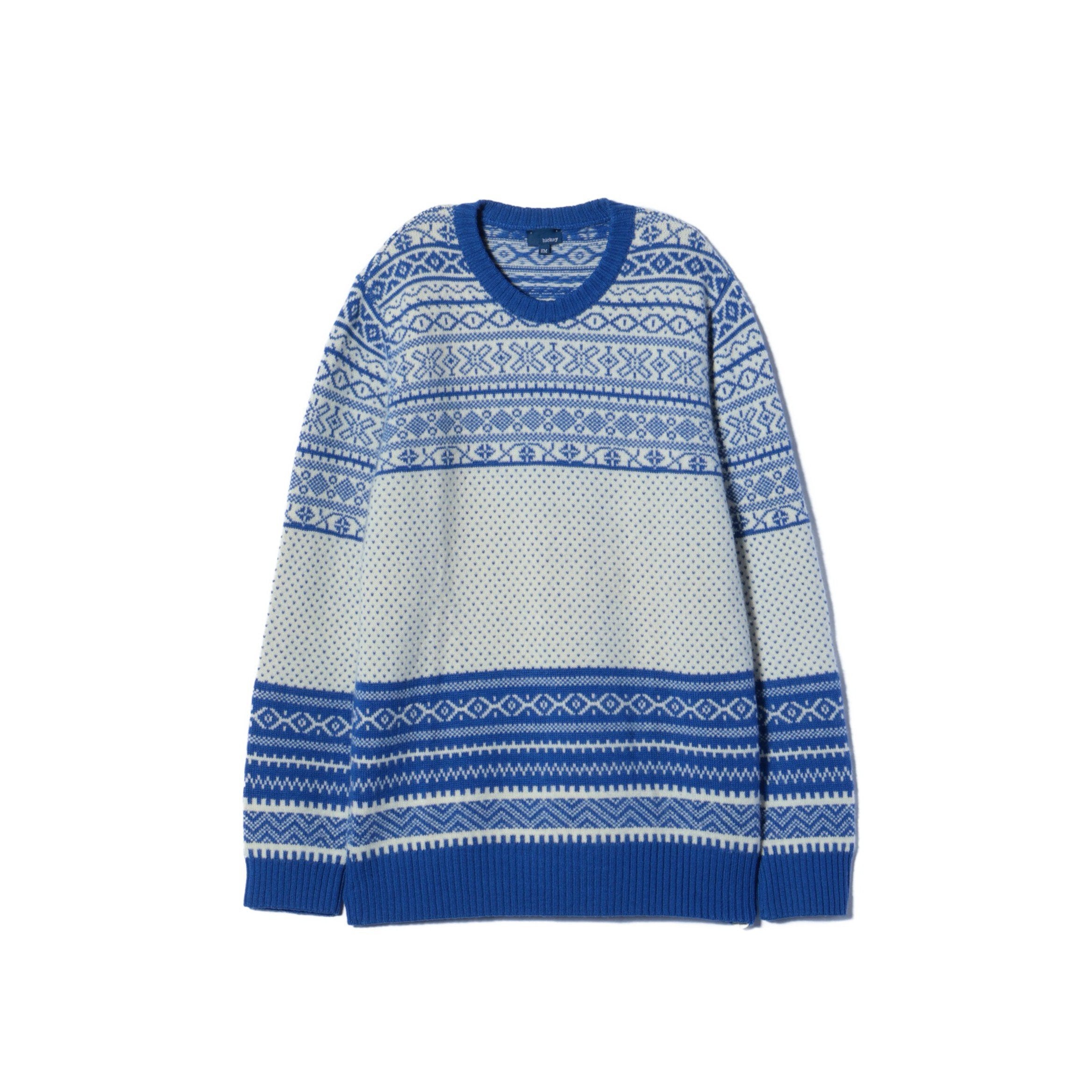 ブルーを基調にしたカラーリングが目を引くニット。インナー使いでも損なわない存在感が魅力です。
