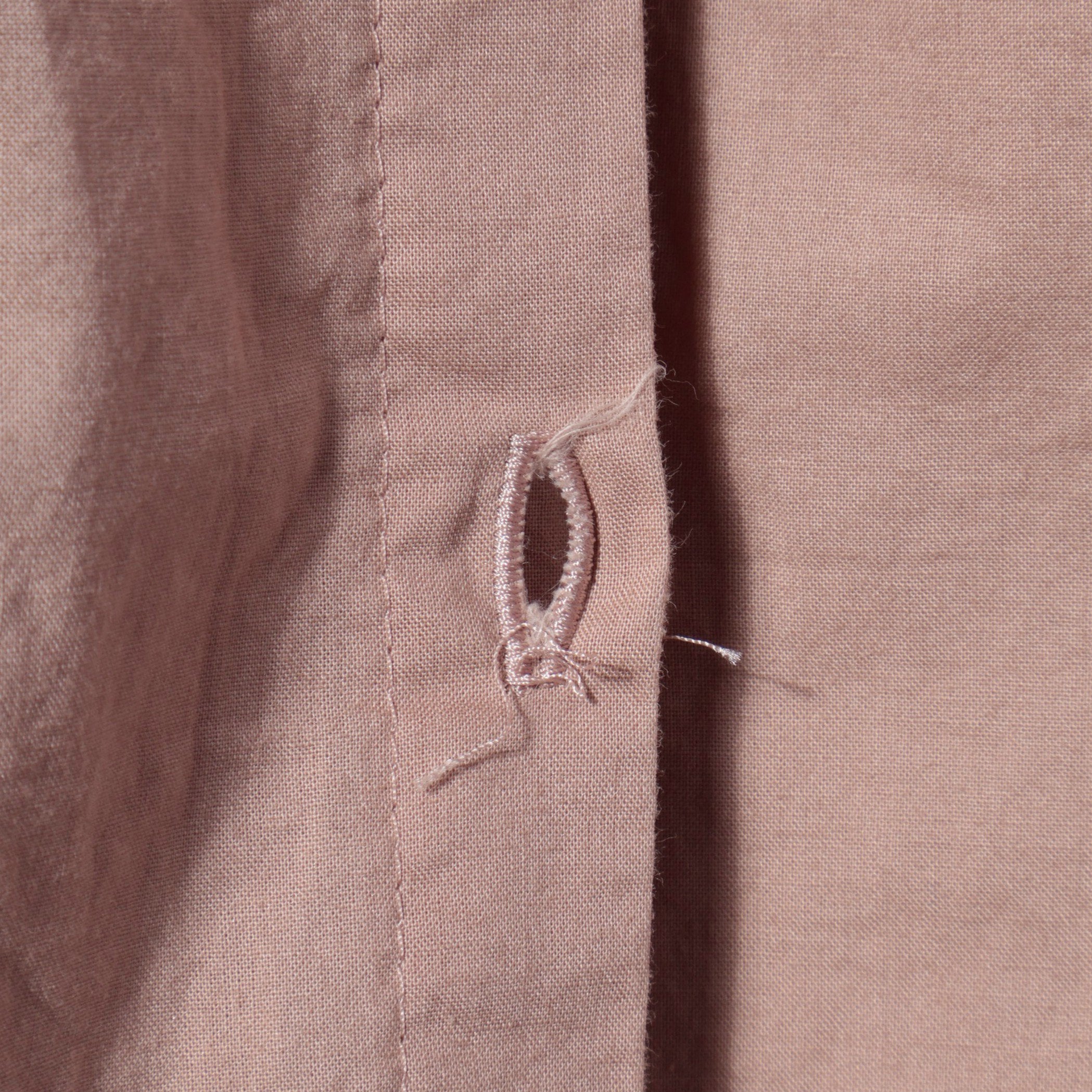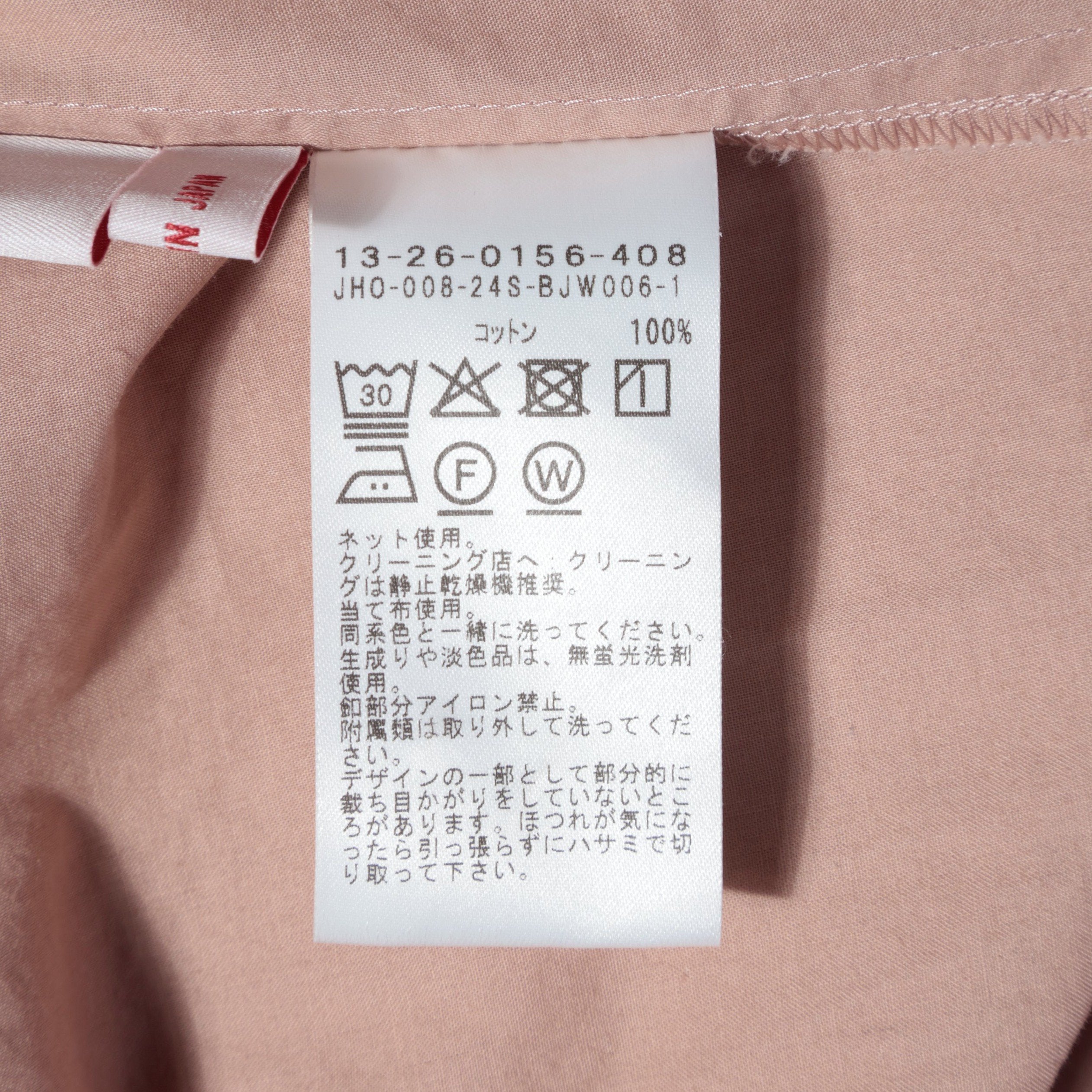 フリルブラウスをアレンジして、ワンピースを作製しました。深いVラインが特徴的で、紐のアレンジでネックまわりのボリュームに変化をつけることが可能。