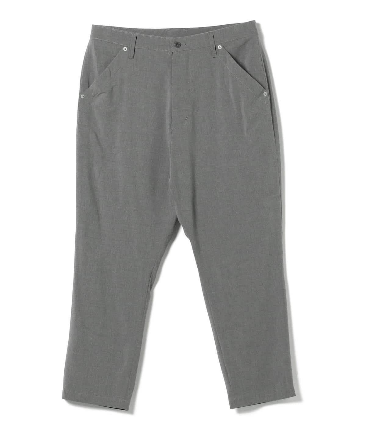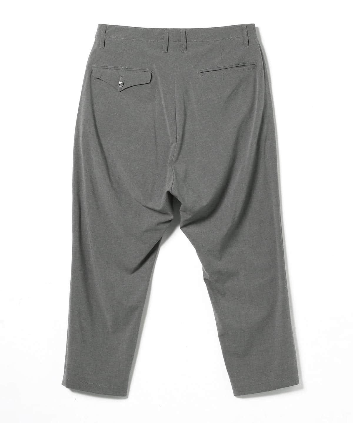 生地はポリエステル 46%、レーヨン 46%、ポリウレタン 8%の混紡糸で織り上げたサイロトロ素材を使用。ポリエステルの丈夫さと、レーヨンの柔らかさとドレープ性が融合した生地で、着用時の肌触りのよさは抜群でストレッチ性もあり履き心地も抜群です。シルエットは股上が極端に深く腰からもも周りの分量も多いサルエル風のシルエットです。