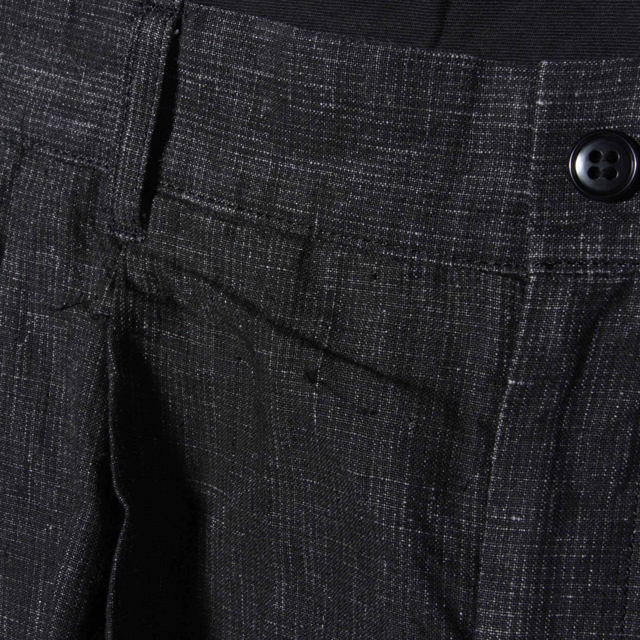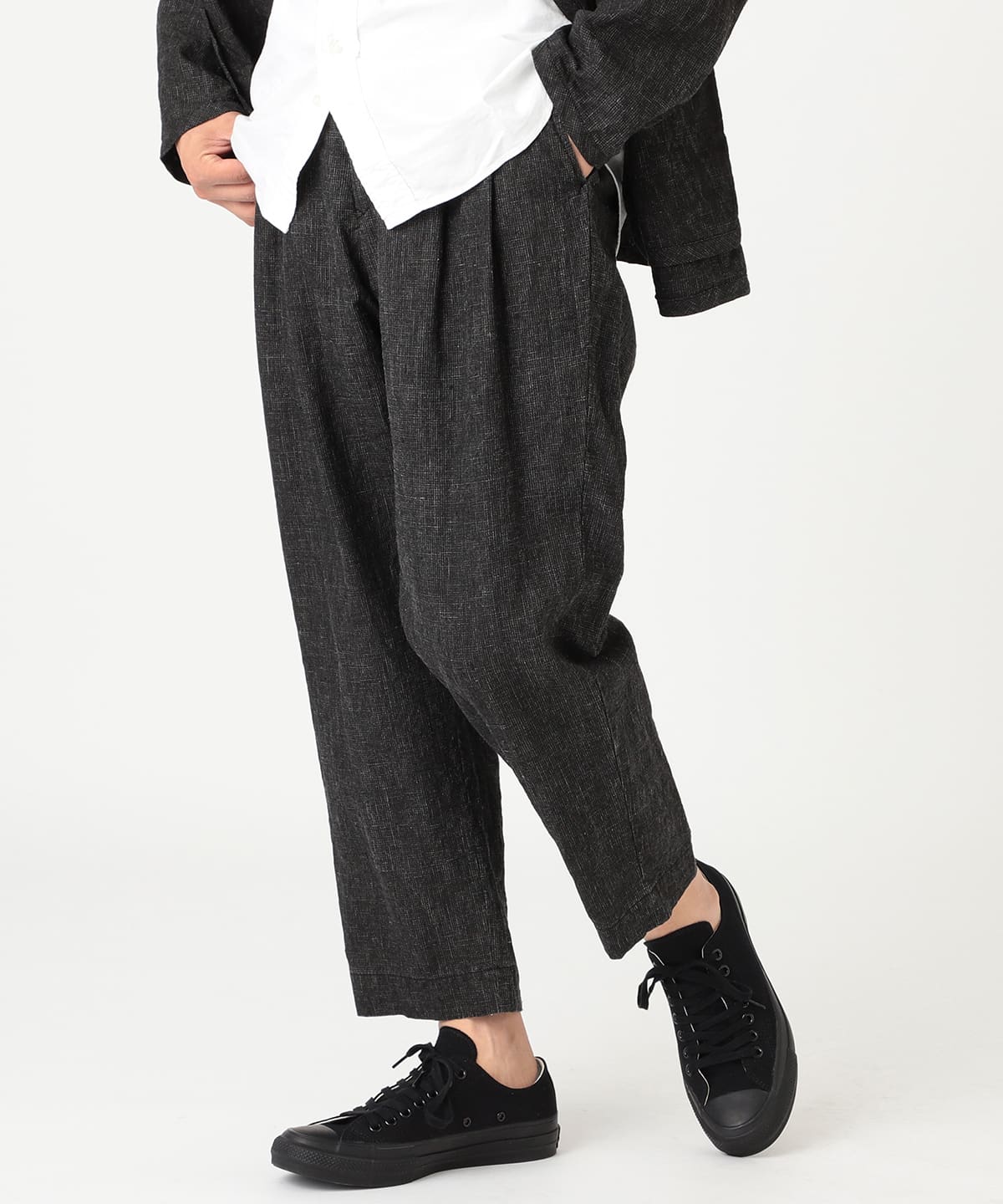 先染めピンヘッド柄に、染料顔料コーティングを施した麻100%パンツ。柔らかいリネン素材もコーテイングによりハリとコシのあるファブリックになります。また、製品洗いすると若干染料が落ち、細かなワッシャーが生じ、雰囲気のあるオールドテイストに変化します。型は、2タック9分丈で股上が深く、ウエストからもも周りはボリュームがあり、裾にかけて自然にテーパードさせたシルエットです。