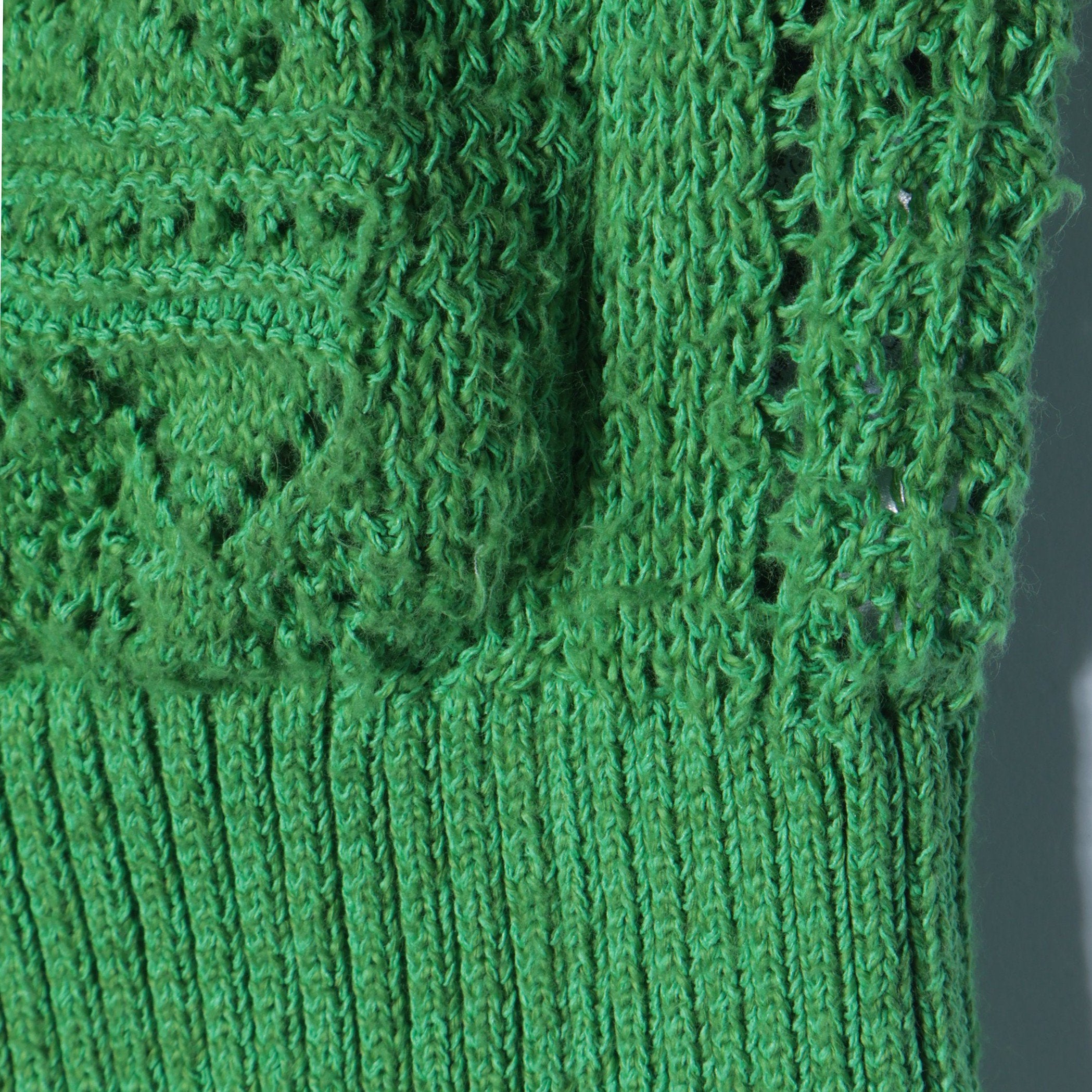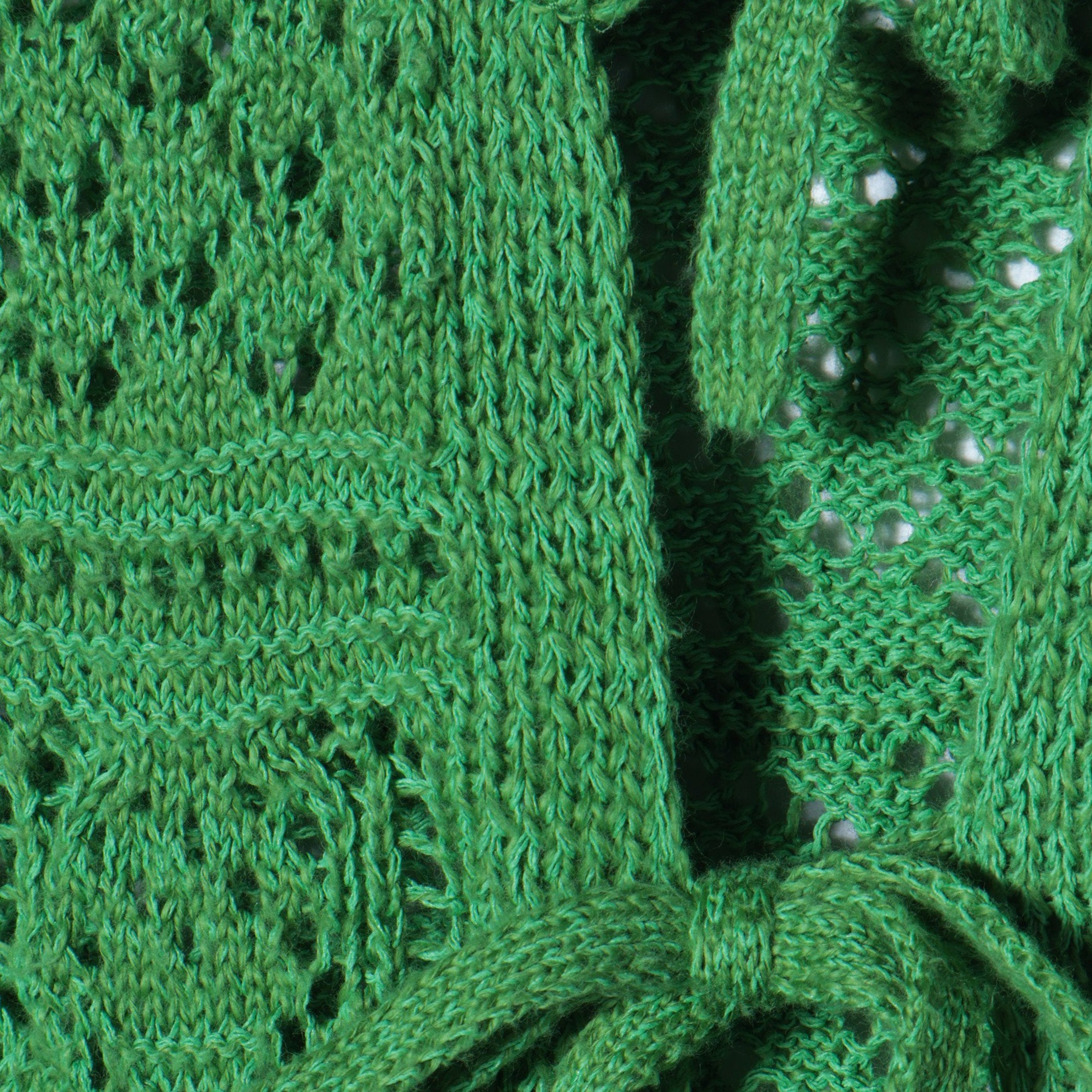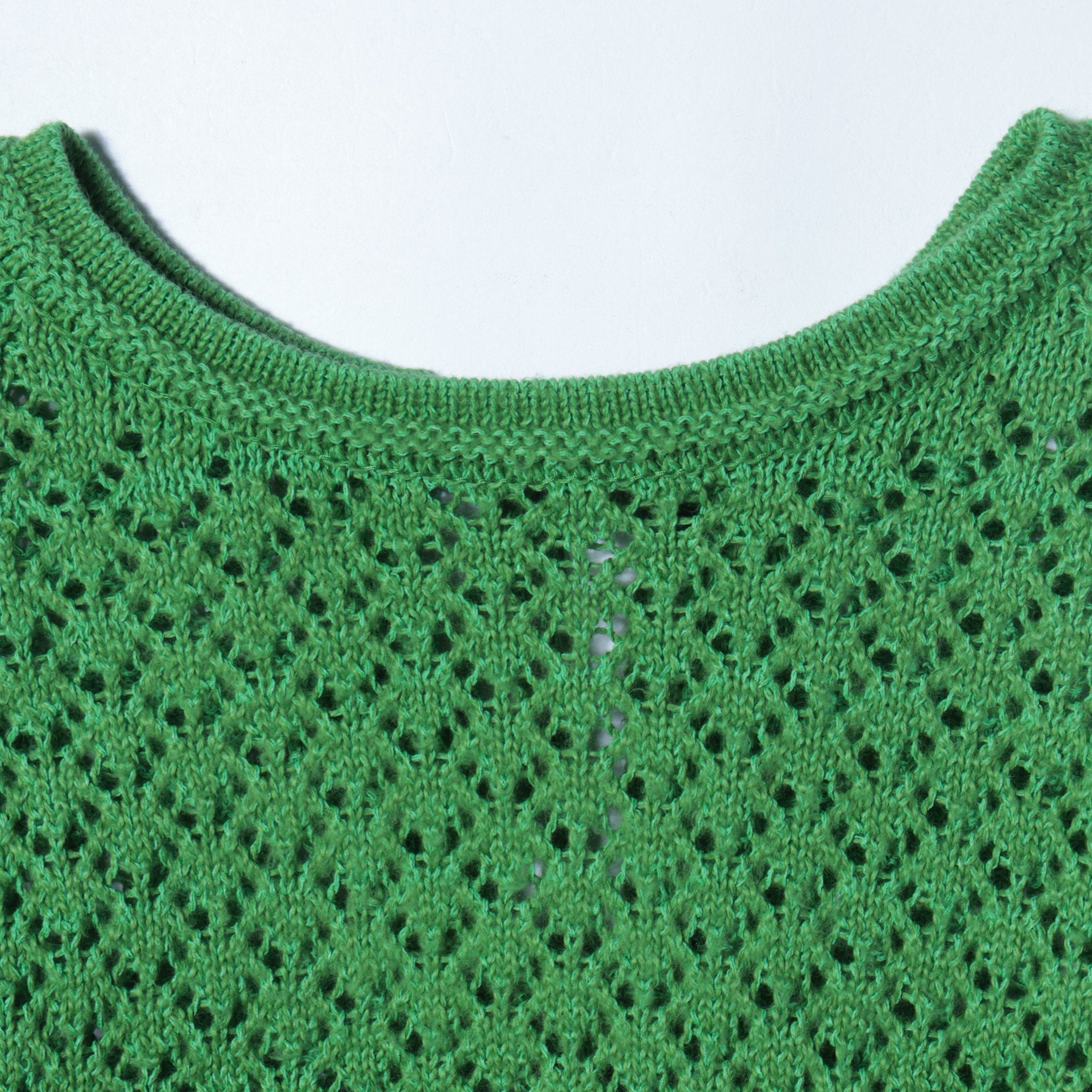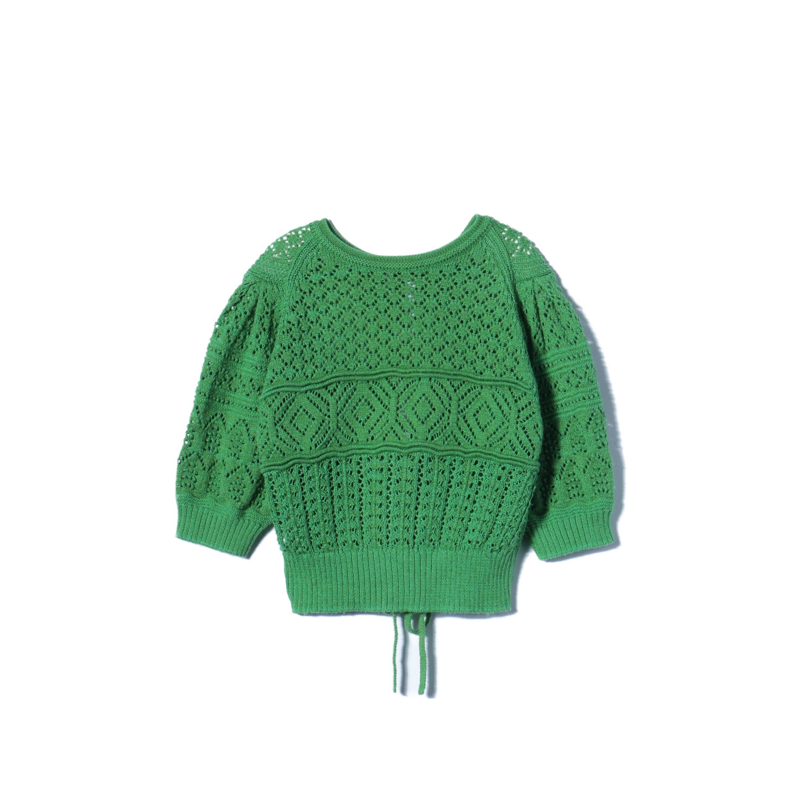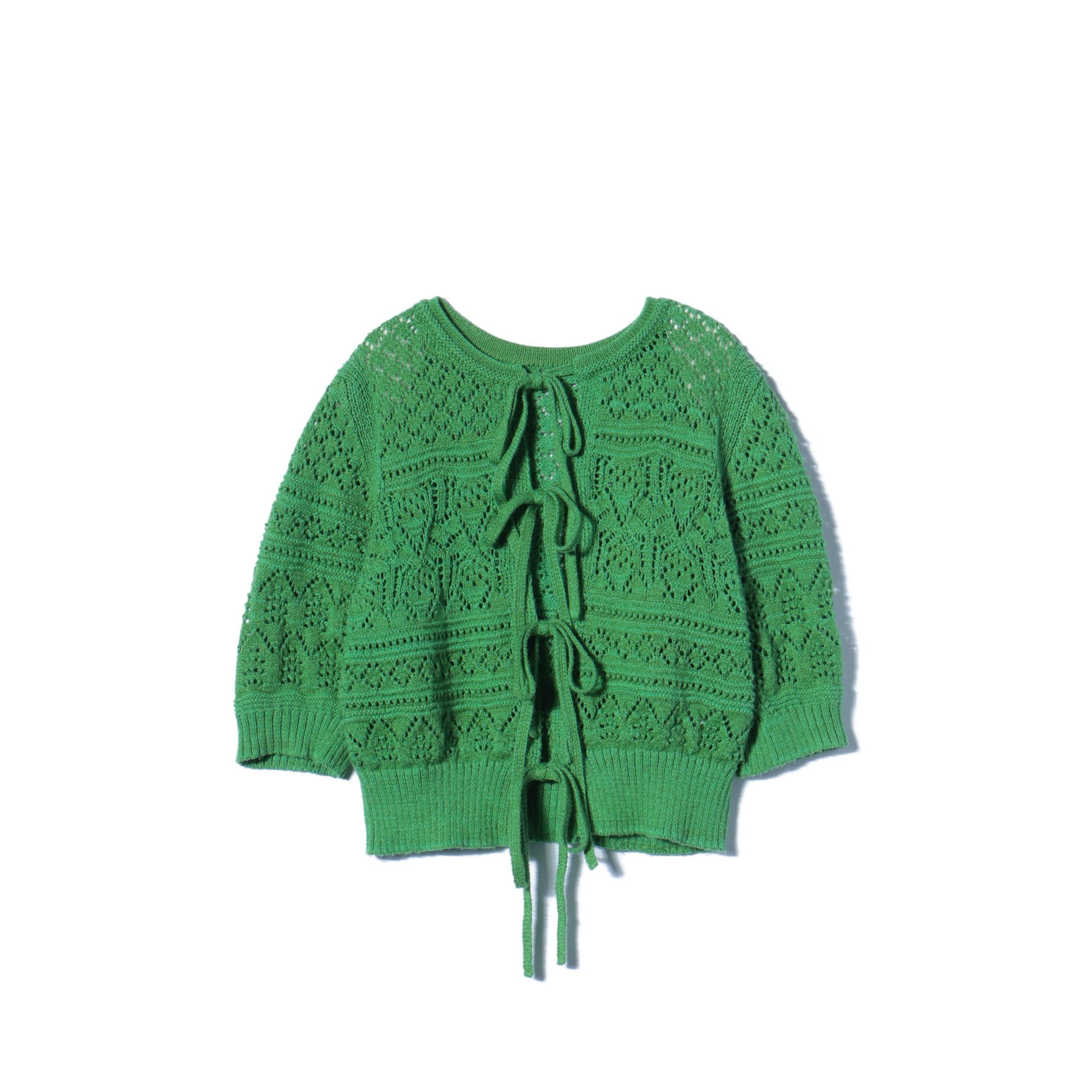 ヴィンテージのニットのような、コンパクトなサイズ感が魅力のカーディガン。前身頃にはツリー、ガーターハシゴ、いちご、プチダイヤ、透かしストライプ、タック袋、丸ダイヤと、パーツごとに異なる透かし柄を7つ織り交ぜ、デザイン別注したアイテムです。2way仕様なので、フロントバックどちらでも着用可能◎。前の紐は結んだり垂らしたり、クロスさせて結んだりアレンジすることで、ニュアンスのある着こなしをお楽しみいただけます。