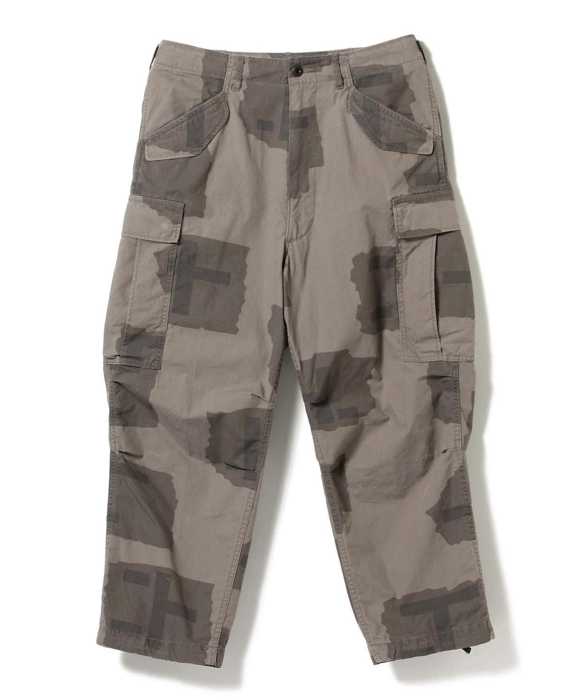 コットン100%のリップストップ素材を使用したワイドカーゴパンツ。強めの製品洗い加工によるアタリ感や自然なフェード感が、合わせるアイテムを選ばず程よいカジュアル感を演出します。ヴィンテージのUS ARMYフィールドカーゴパンツを踏襲しつつ、カーゴポケット内の隠しポケットや前ポケットの2段仕様など実用性の高いディテールを追加することで現代的にアップデート。腰回りにゆとり持たせ膝から裾にかけてストンと落ちるストレートシルエットは、ミリタリーアイテムらしい無骨な顔立ち。オリジナル同様に裾のドローコードでシルエットを調整可能なことに加え、ウエストにもドローコードを配しベルトレスで着用可能に。