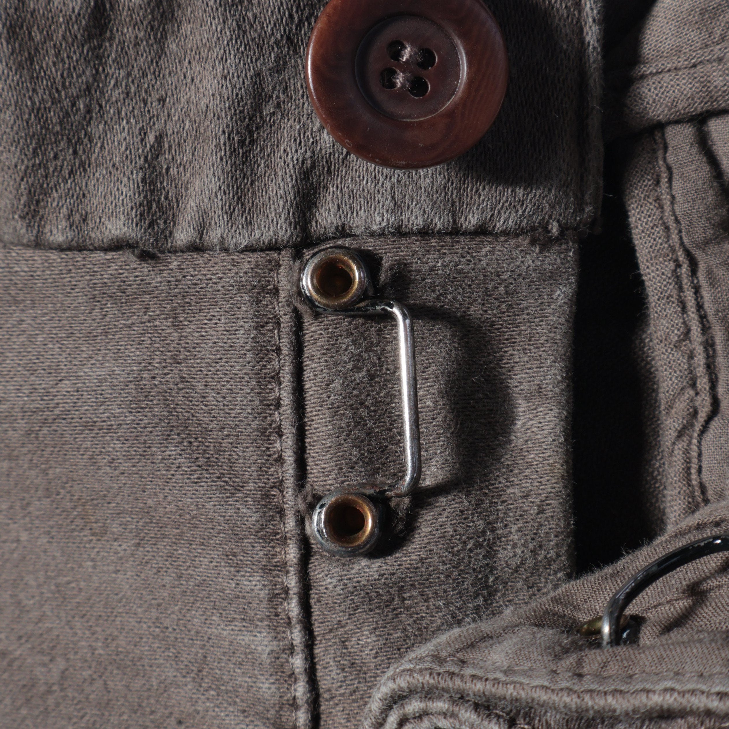 独特なカラーリングが魅力のパンツ。ウエストバンドの幅や、フロントジップ部分に配したフックなど、さりげない拘りが散りばめられています。