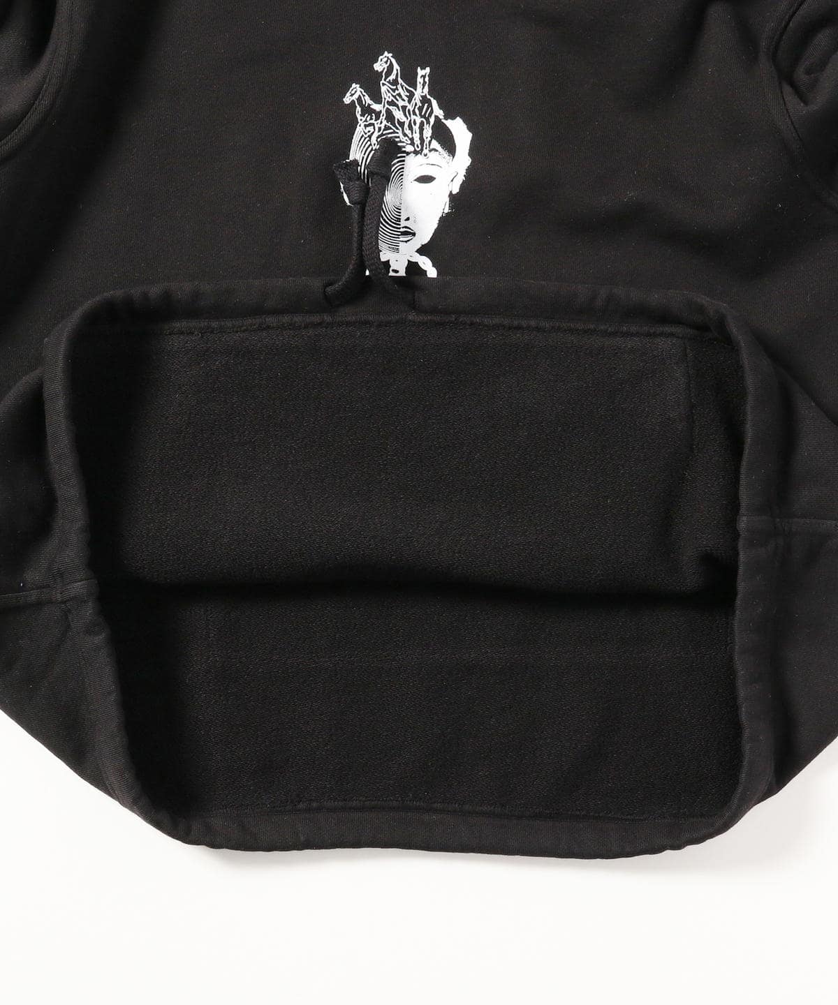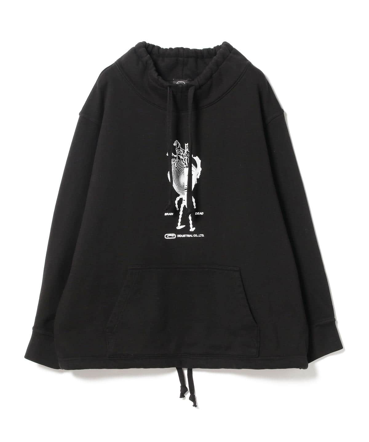 フロントにグラフィック、バックに別布のパッチが付いたスウェット。珍しいモックネック型でややオーバーサイズなサイズ感と裾のドローコードが特徴的。ドローコードを絞って丈感を調節したりとシルエットのバリエーションを楽しめます。しっかりした地厚な生地感ながら、裏はパイル状。季節を問わずにお楽しみいただけます。