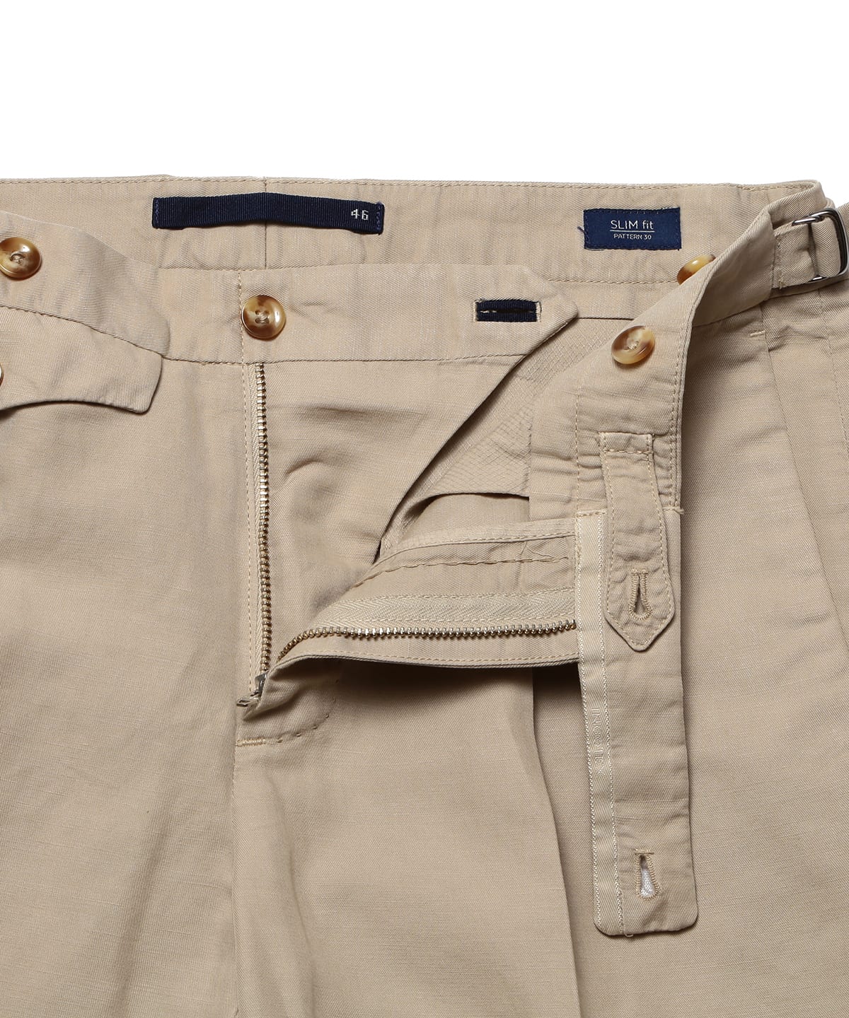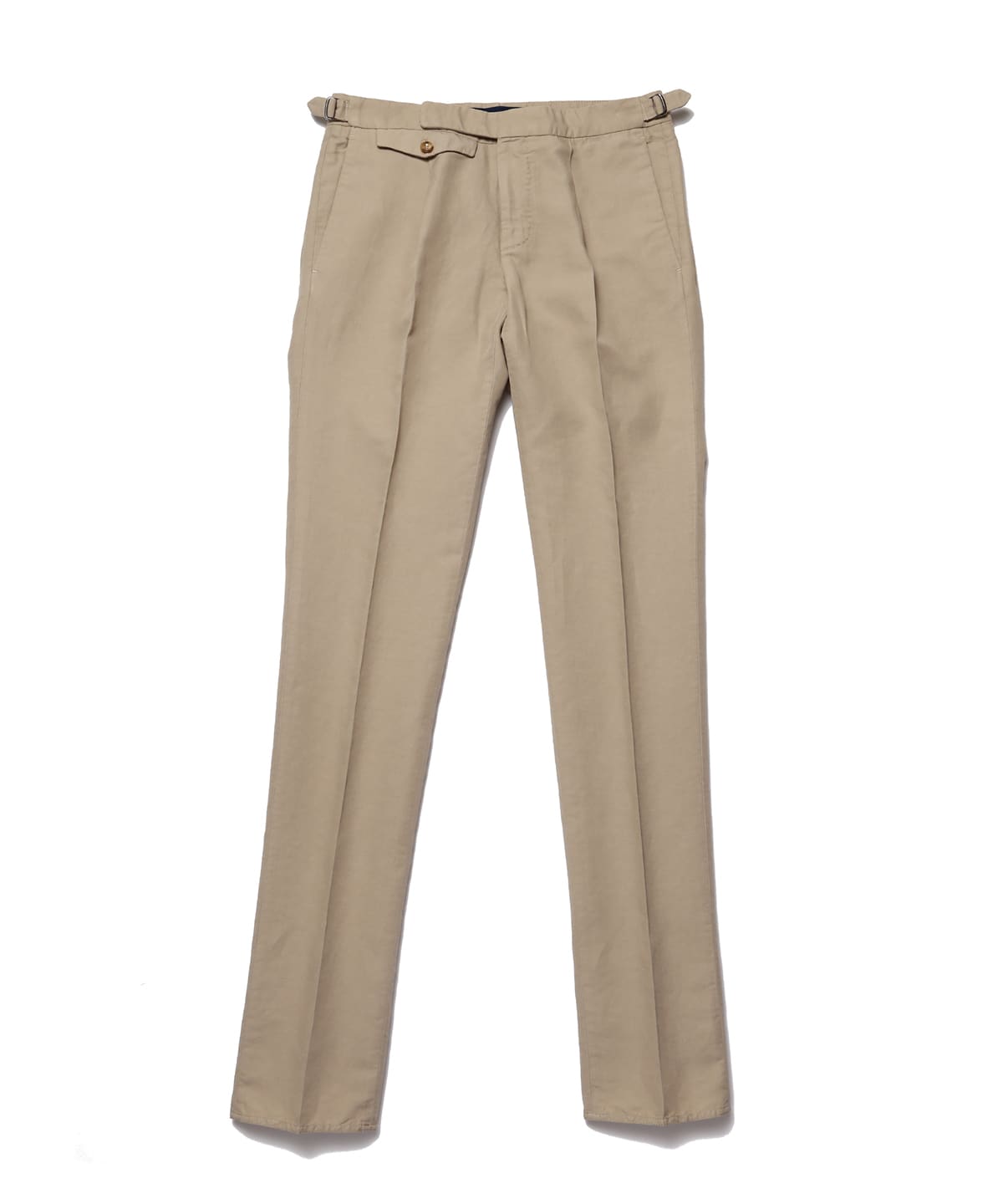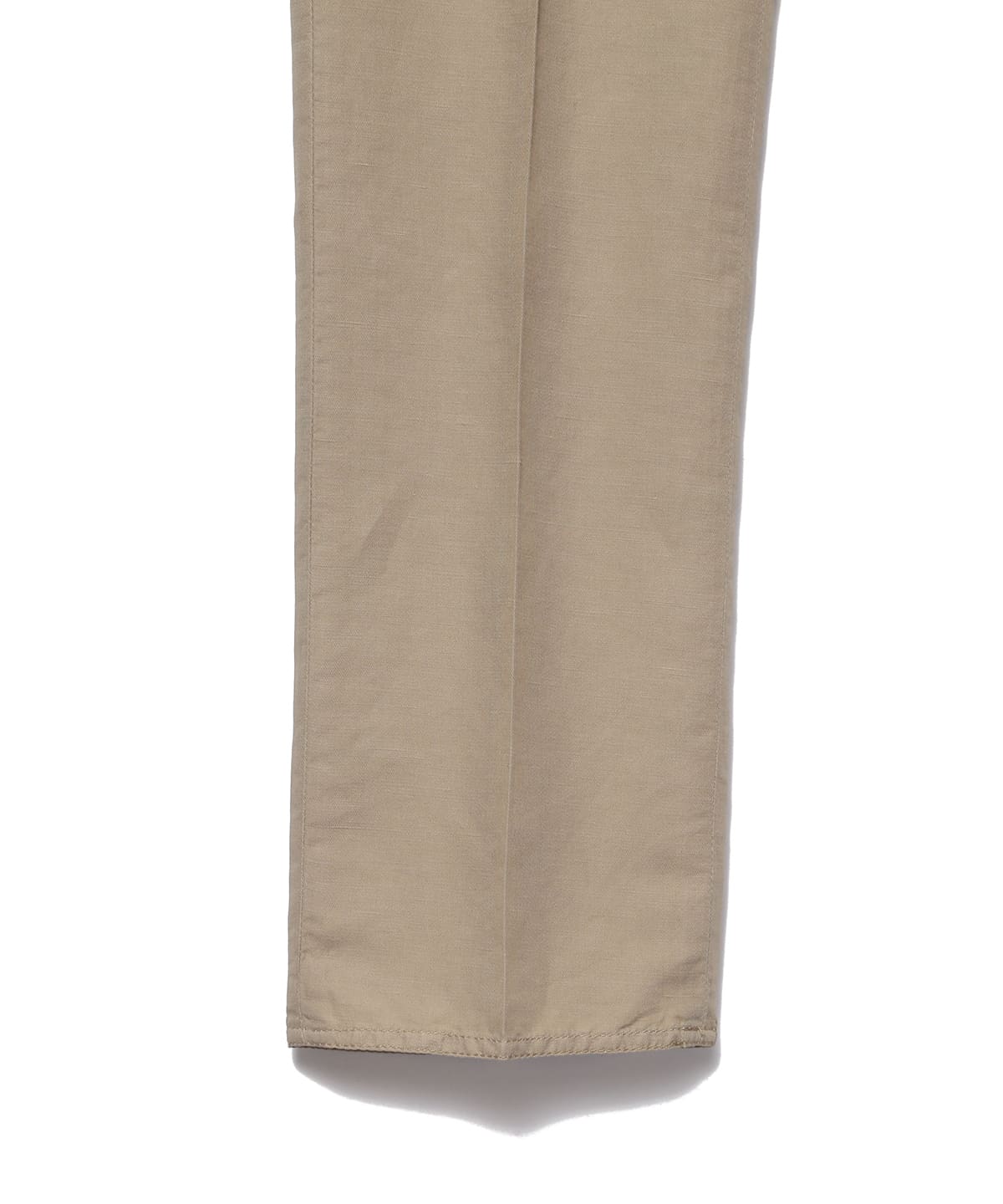 BEAMSエクスクルーシブ展開のリネンコットン素材の軽量化を図り、更に清涼感を向上させています。ブリティッシュティストを彷彿とさせるサイドアジャスターとベルトレス仕様がポイントです。同ブランドの定番モデル『N35』、『N30』に比べヒップとワタリに余裕を持たせる事でクラシックなデザインながらモダンな雰囲気に仕上げています。