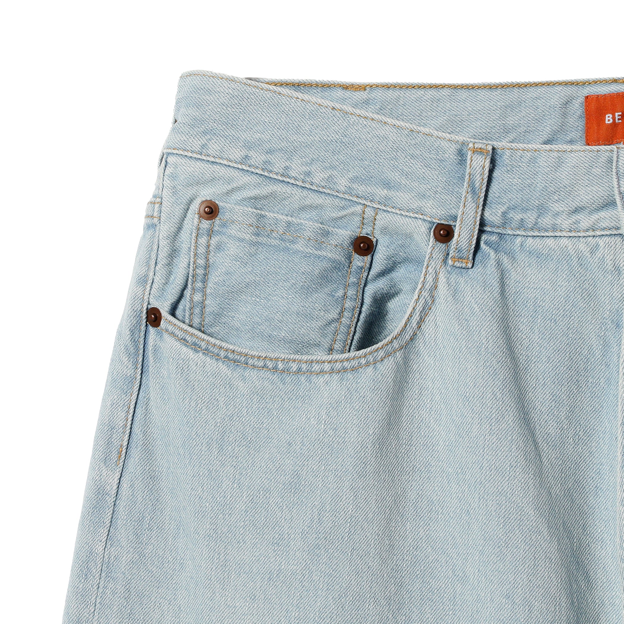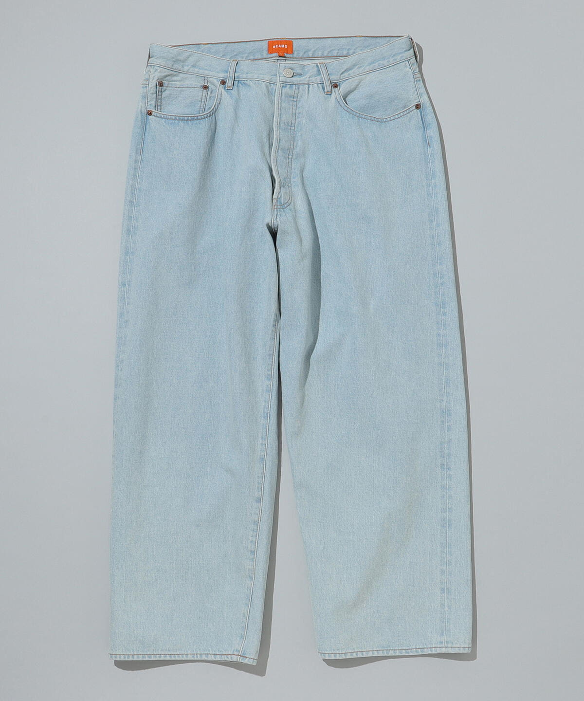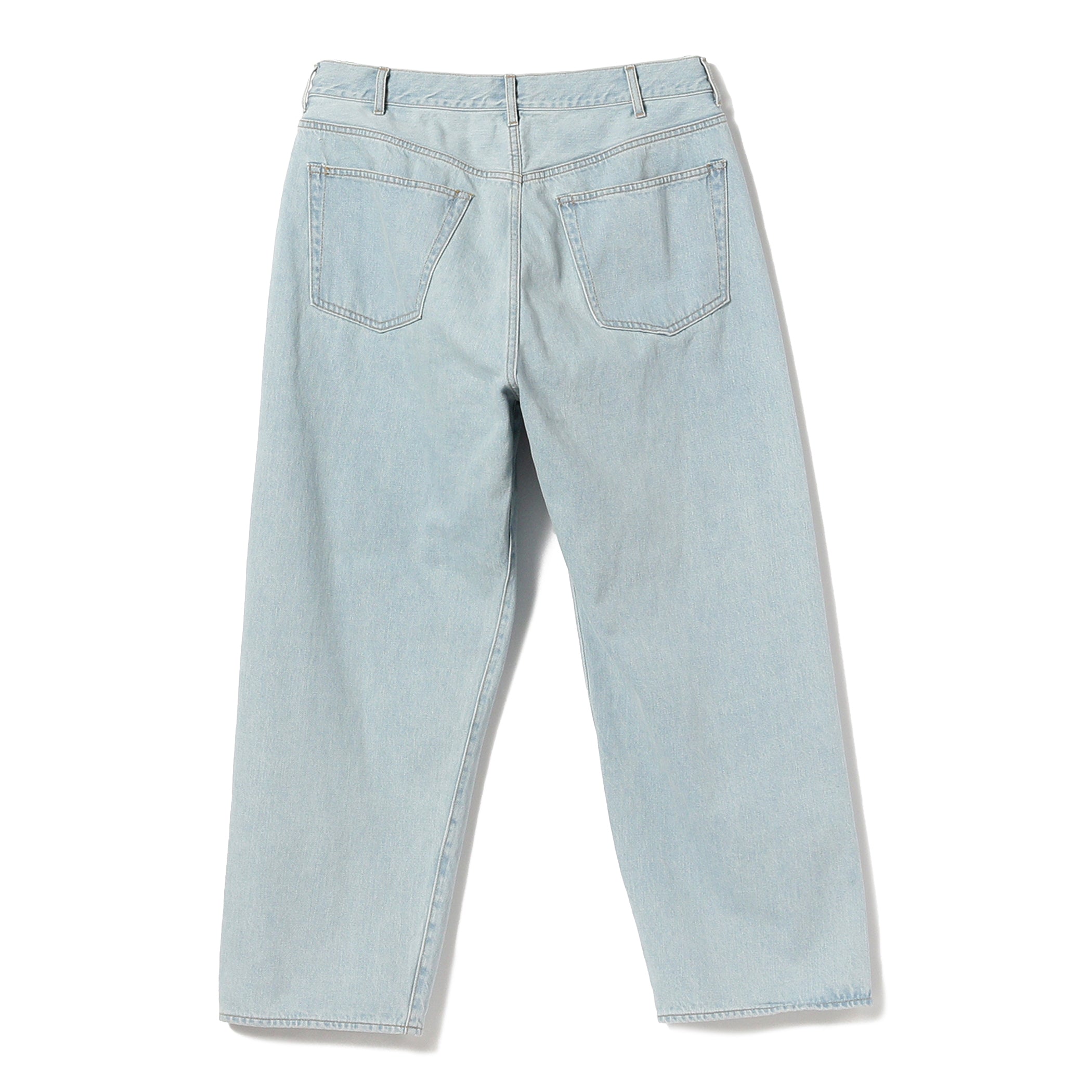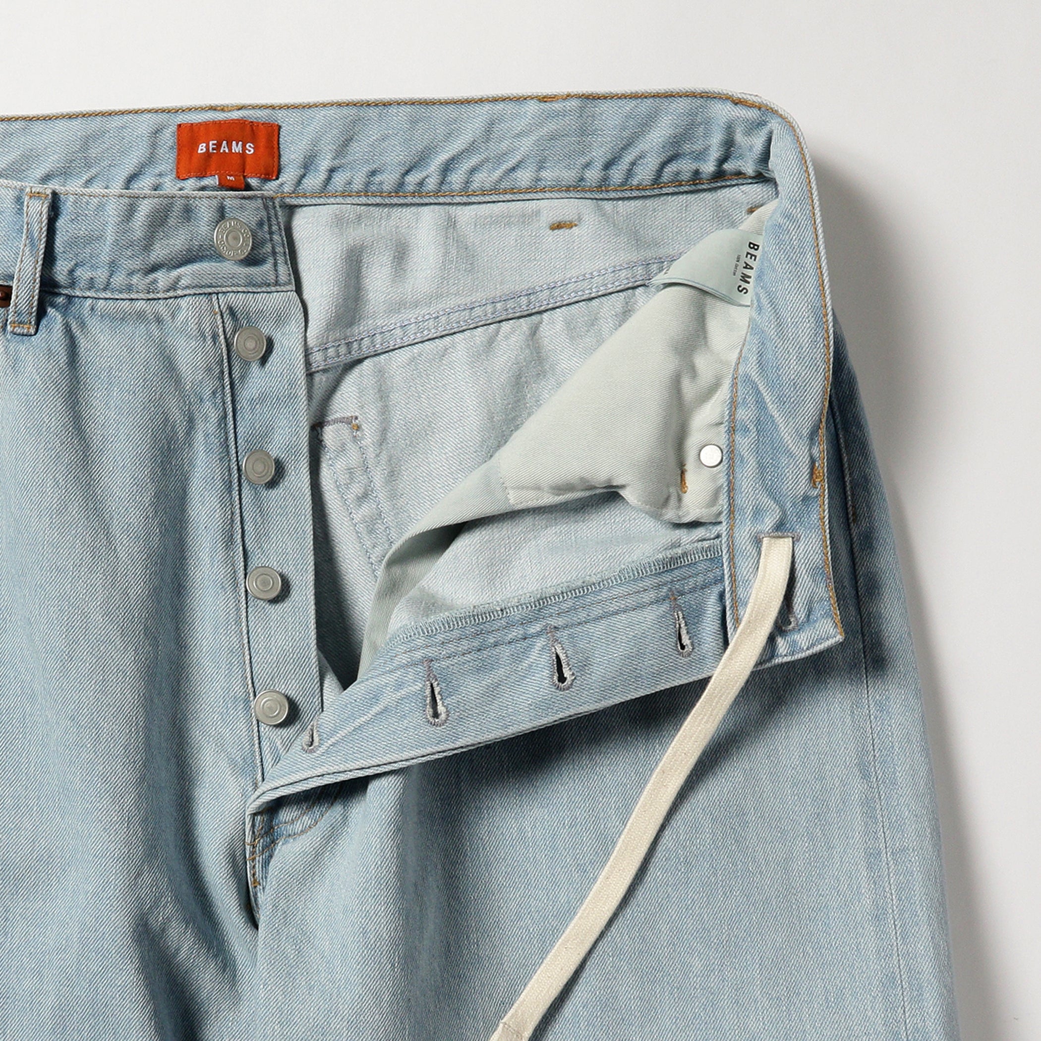 ヴィンテージデニムをベースに、随所にこだわりを詰めこんだデニムを製作。当時の生地を細部まで研究し、糸に綿花の一部をブレンドすることで独特の粗野感を再現。ウエスト全体にゆとりを分散させることで、タックパンツの様なリラックスした穿き心地に仕上げています。腰紐の絞ったときに表れるシワは、ヴィンテージデニム特有のベルトを締め上げた様子を表現。ただブリーチ加工をするだけではなく、履き古した雰囲気を出すためデニムが黄変した表情をトッピングしています。