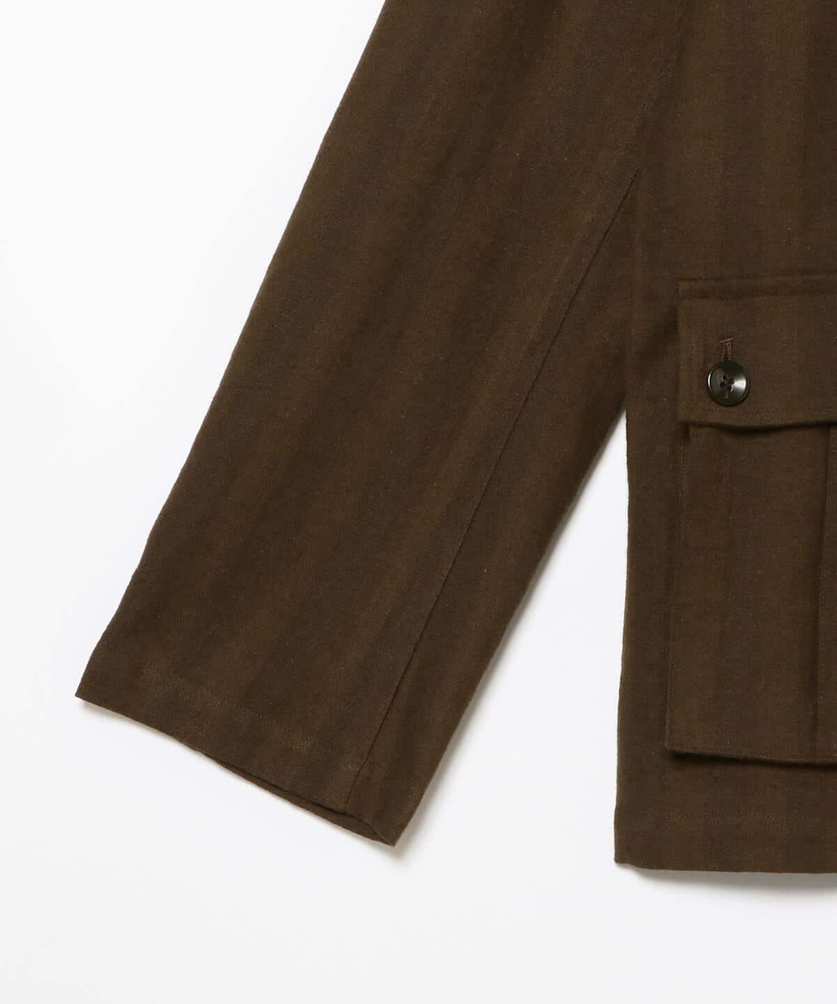 50'sチェコ軍のミリタリーアーカイブがモチーフとなるスタンドカラージャケット。中東、ミリタリーというキーワードに習い、ネック周りは東欧的かつどこかエスニックムード。トップボタンを外せばコンパクトなVゾーンが現れ、表情が一変します。マチ付きのフラップポケットはミリタリーデザインを踏襲。テキスタイルは、コットンリネンによる風合い豊かなヘリンボーンクロス。美しい折柄とシックな配色がコーディネートの主役を飾ります。
