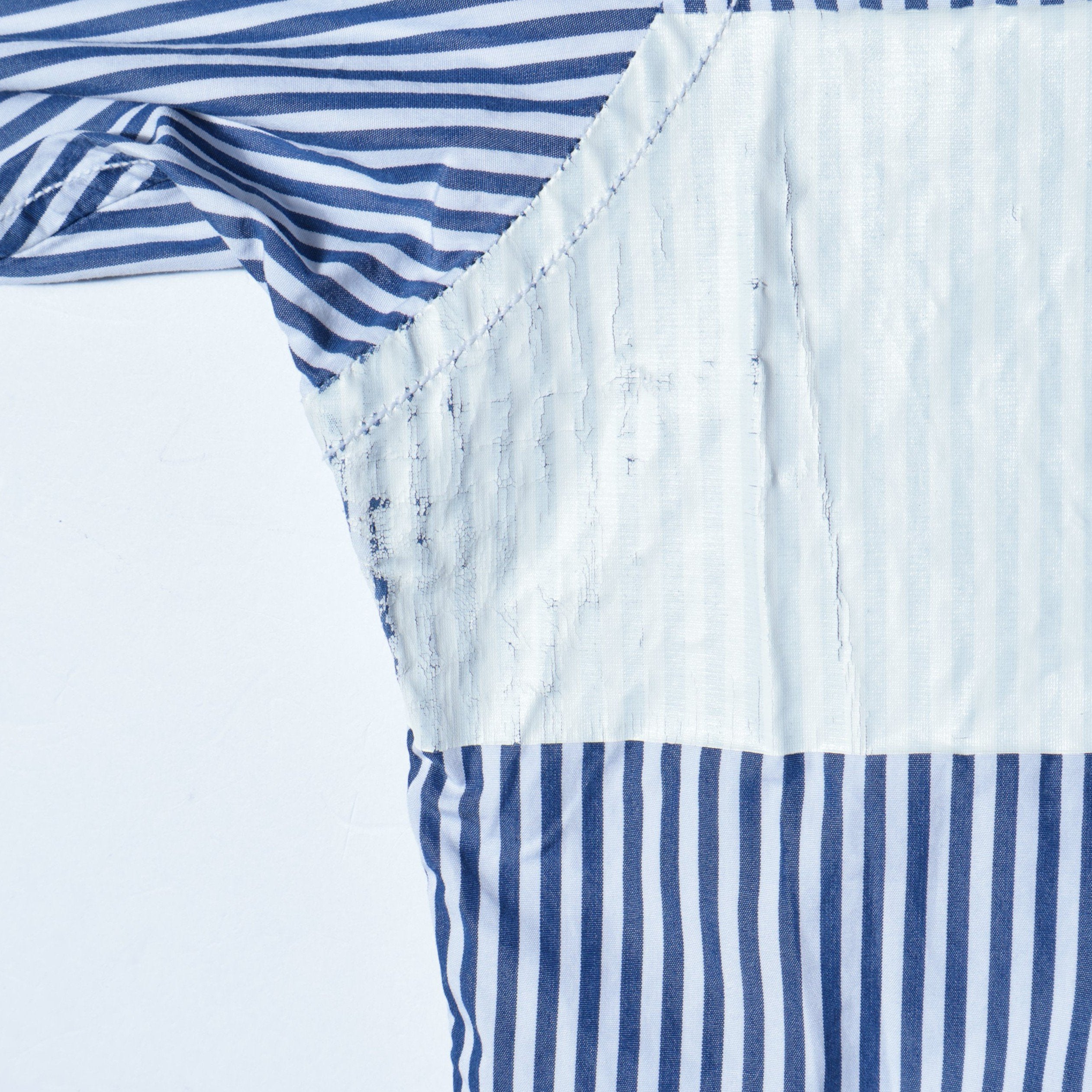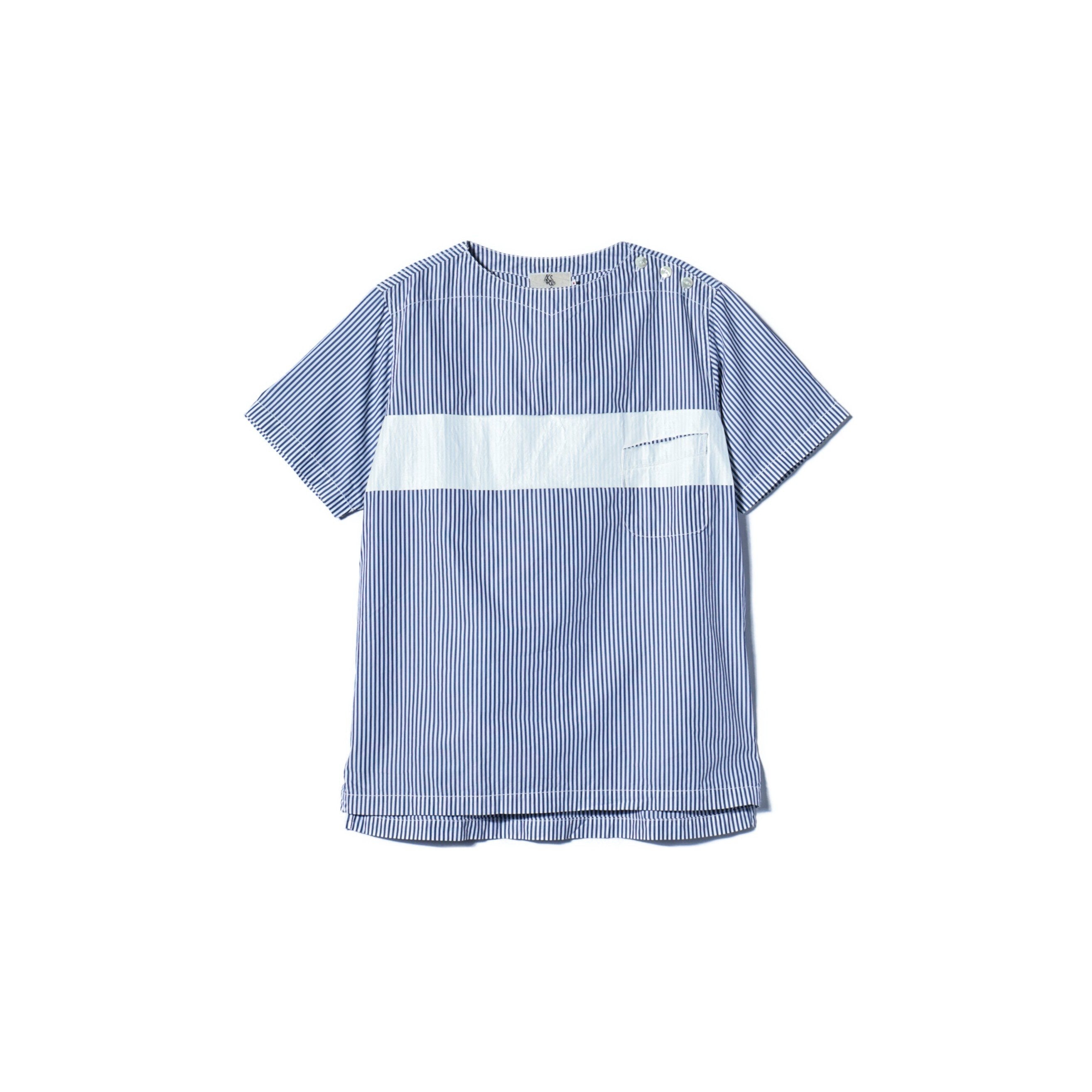 シャツ生地を使用したクルーネックのアイテム。胸元のラインがデザインのアクセントになっています。機能性を加味し、首もとのボタンを配しています。