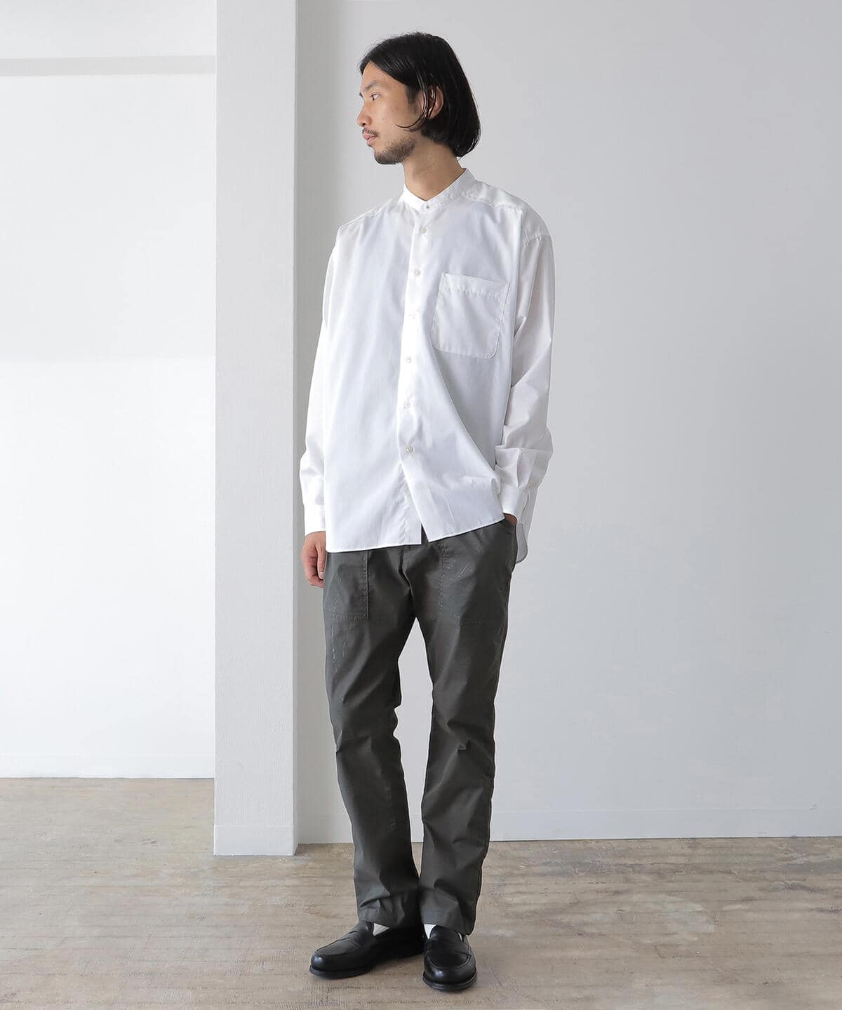 リラックスフィットのバンドカラーシャツ。トップボタンはゴールドのギボシ釦を採用してアクセントにしています。上品な印象に仕上げていますが肩と脇の切り替えをアウトロックにすることで斬新なデザインもプラス。フラット仕様の貝ボタンは高級感を感じさます。