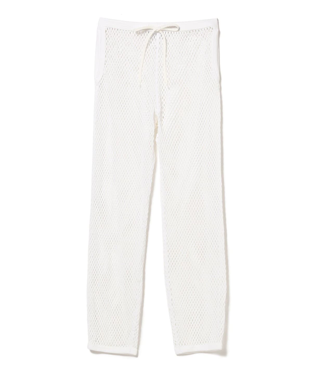 オリジナルのダイヤメッシュのパンツ。国内では希少な12ゲージの編機で編立しています。穿くと裾がきゅっとなり上に生地がたまるので、シルエットに変化をプラスします。