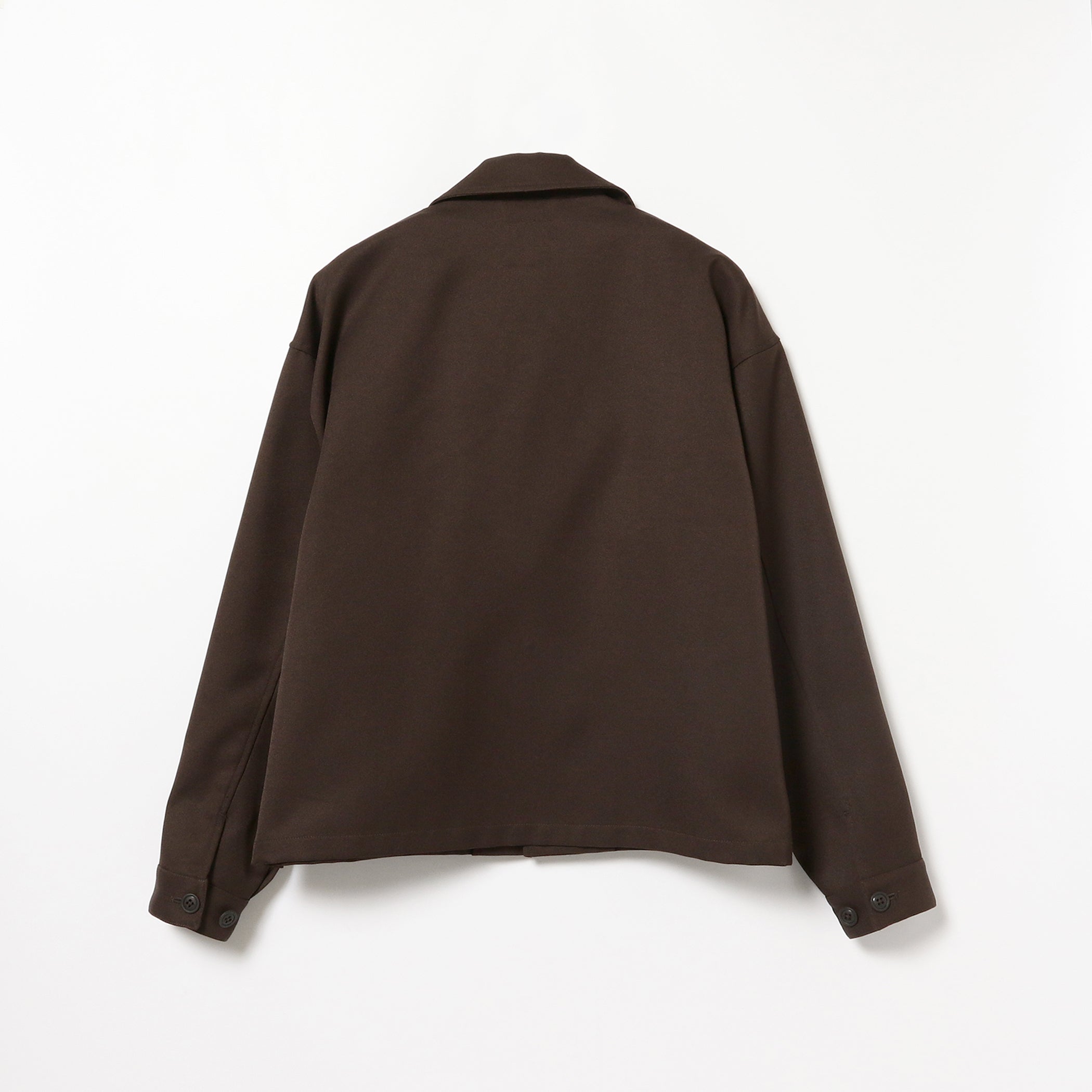 シャツ感覚で羽織ることのできるブルゾン。表がポリエステル、裏がコットンの2重織仕様。上品な光沢のある表情が特徴です。裏がコットンのため、汗ばむ時期にも着用いただけます。ワイドな身幅とドロップショルダーの反面、着丈を短く設定することで、トレンドの「ワイド & ショート」のシルエットを表現しました。