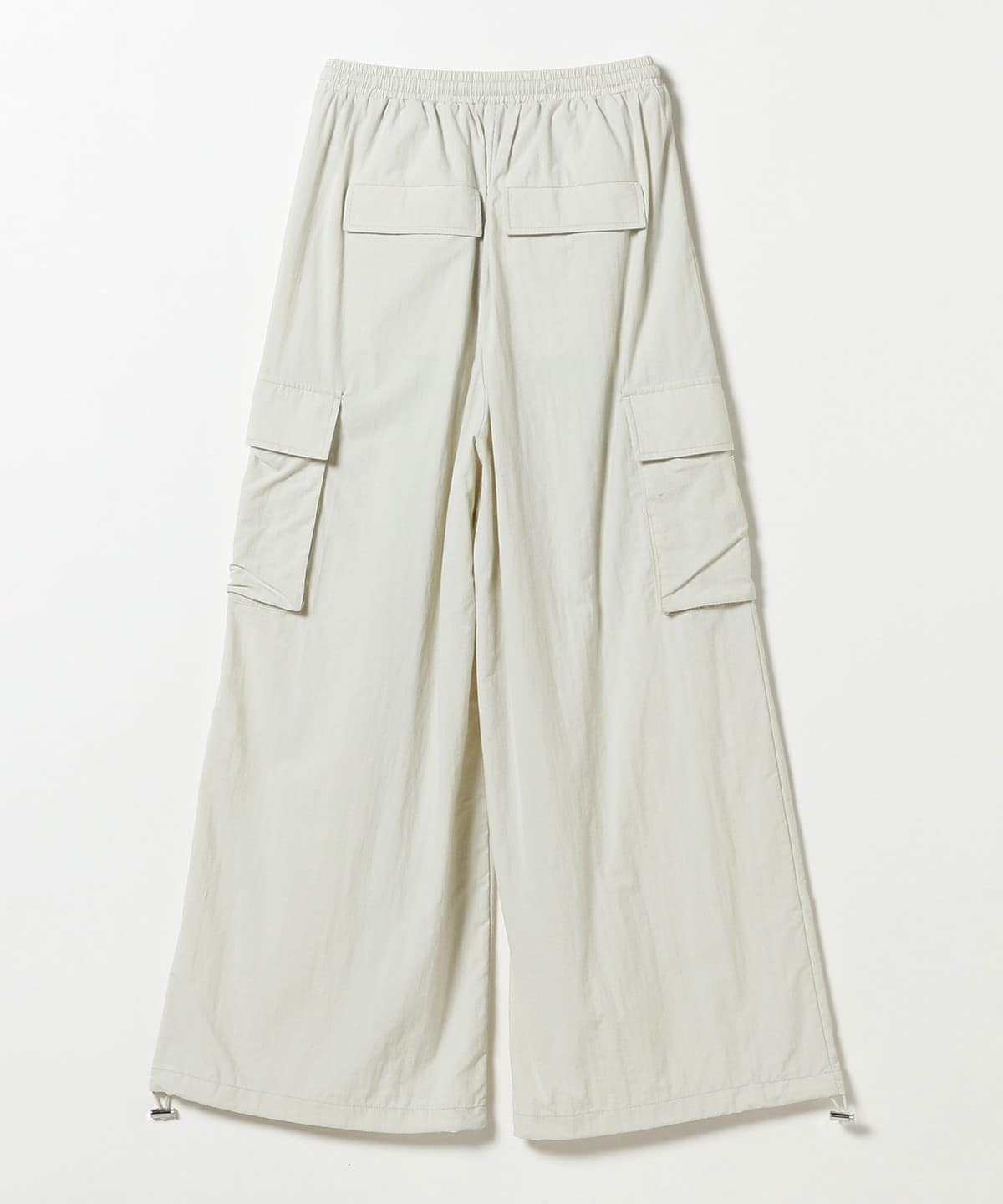 カジュアルすぎないすっきりとしたシルエットと、表面にシワ感のある素材がポイントです。ウエスト位置にギャザーを1周入れヒップ周りに分量を出し、メリハリを付けました。パッチポケットはあえて下めにし、アクセントに。裾は絞れるように内側に紐を入れ、ウエストもゴムが入ったデザインに仕上げました。