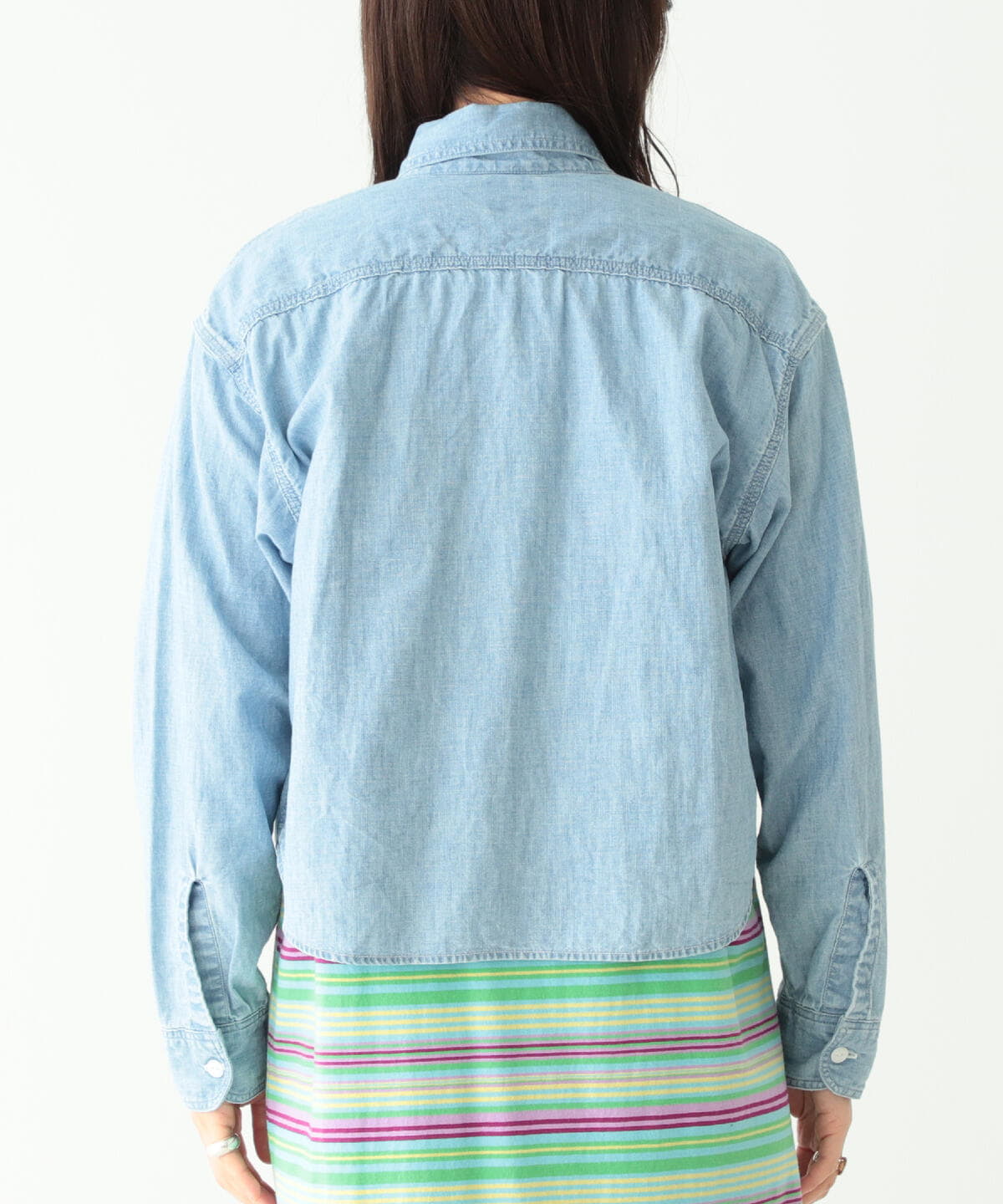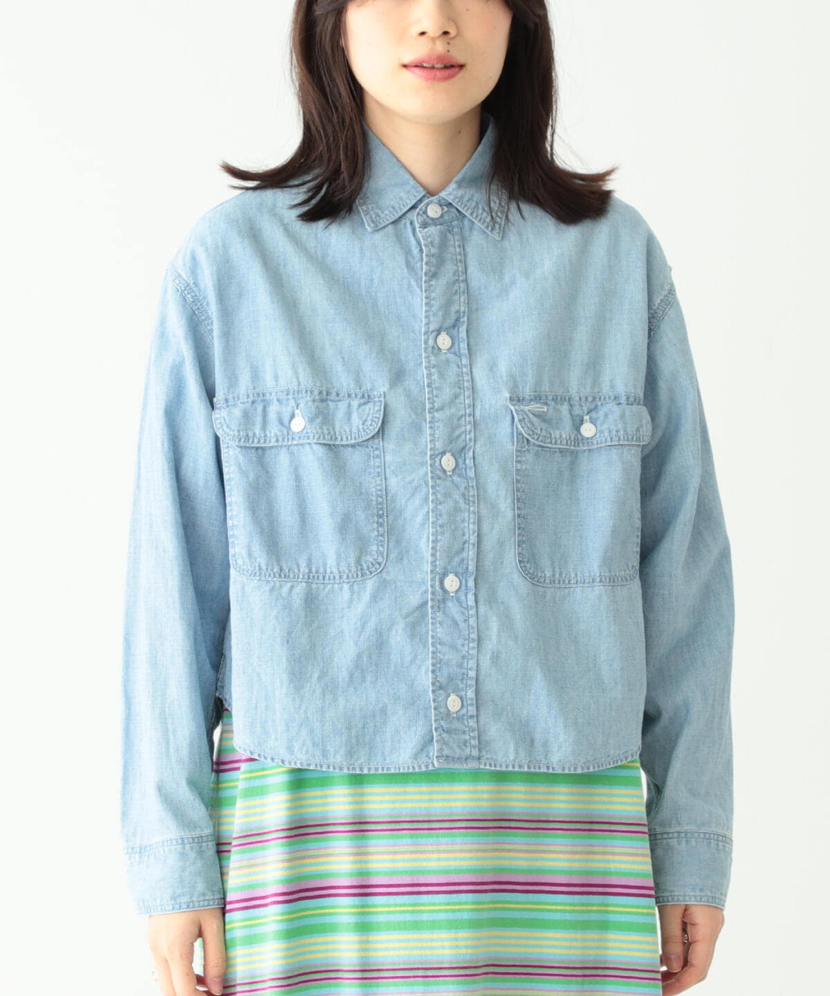 丈を短くCUTしたイメージで作製されたシャンブレーシャツです。柔らかな風合いの生地を使用し、ヴィンテージさながらの雰囲気に仕上げた1着。インナーを見せるレイヤードスタイルや、ボリュームのあるボトムスとの合わせなど、幅広くコーディネートをお楽しみいただけます。