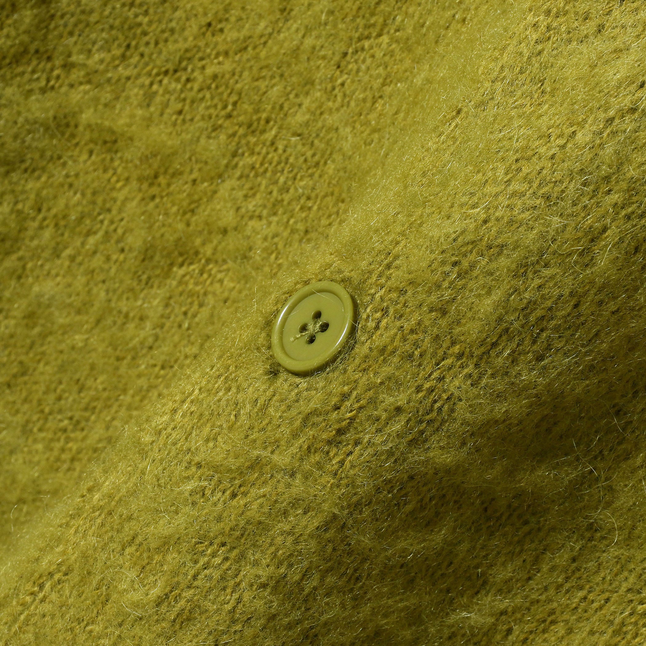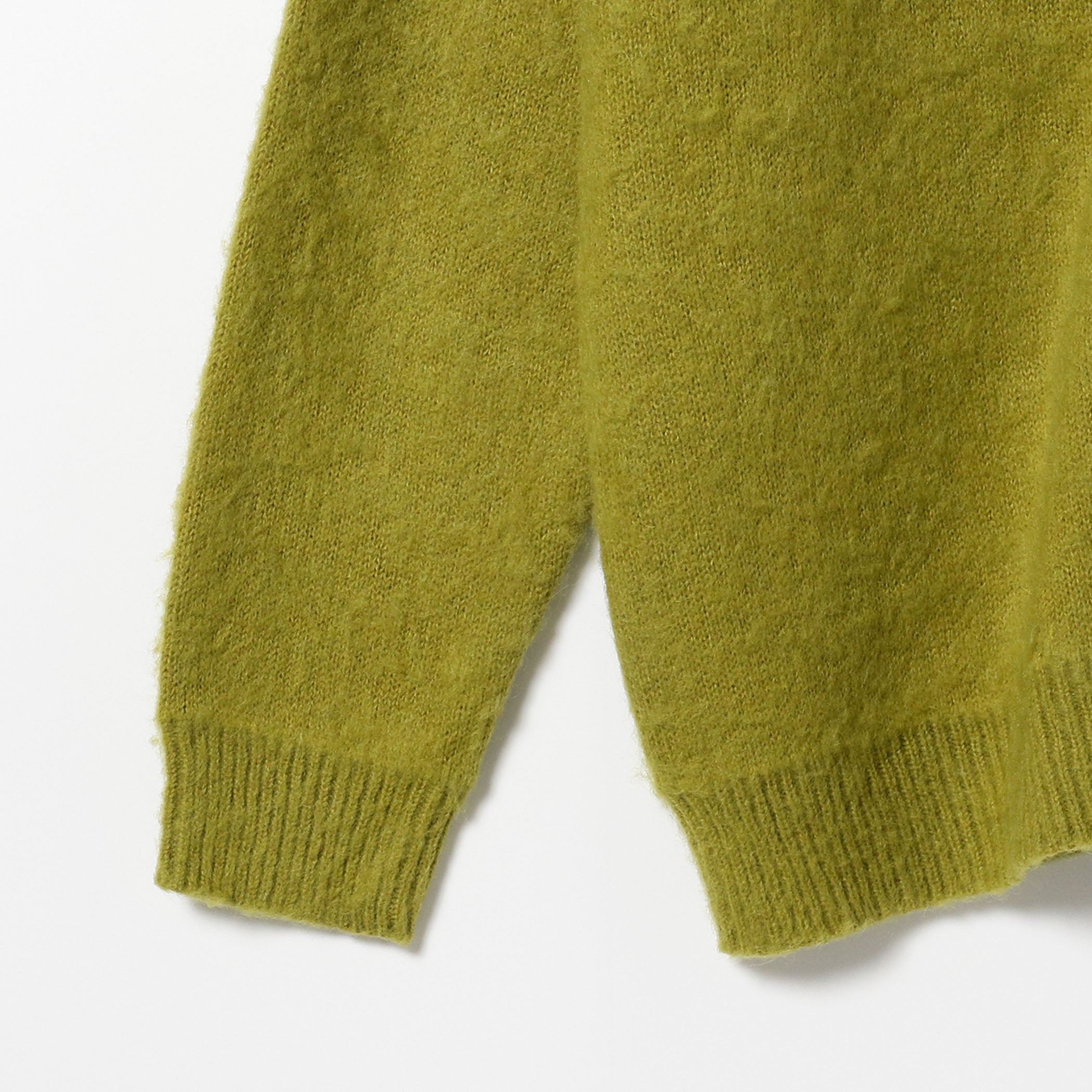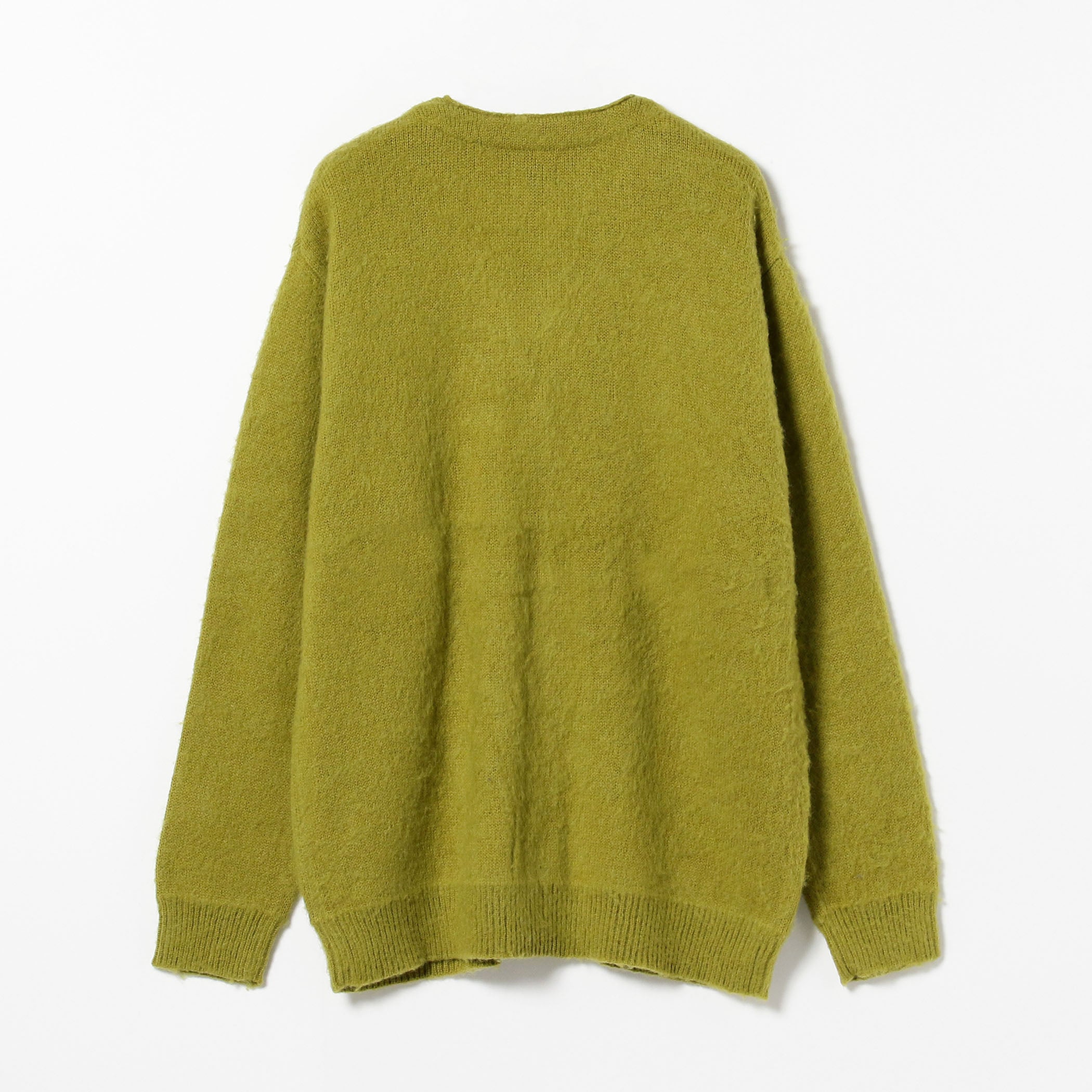 クラシックなシャギーカーディガンをルーズフィットにアレンジした一着。衿ぐりや袖口の各寸法のバランスをとりながらルーズシルエットに仕上げています。通常のシャギーニットにありがちな生地のたるみを、ダブルジャカードでしっかり編み上げることによりたるみが起きにくい仕様に。シンプルなデザインで使い勝手の良いアイテムです。