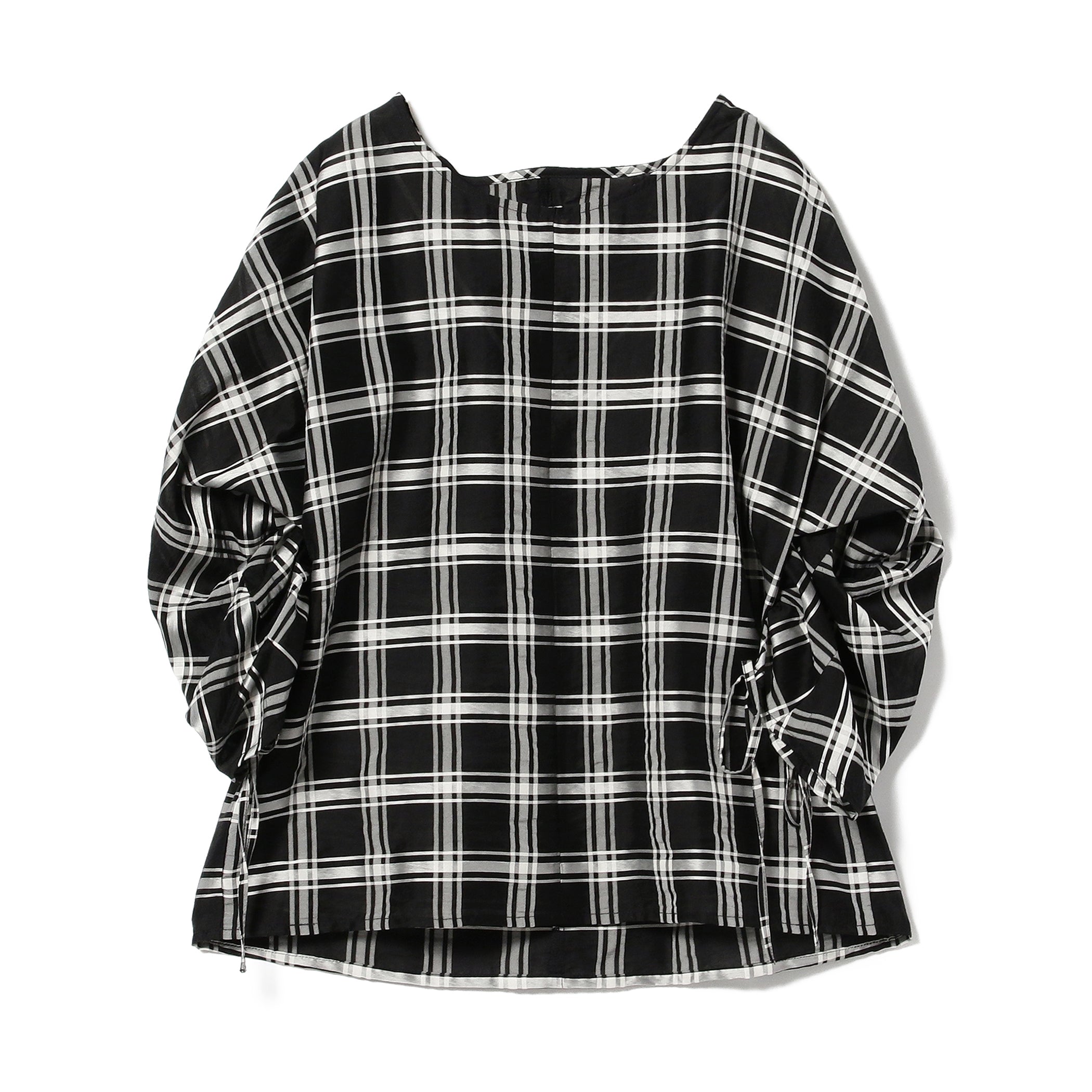 プルオーバータイプのデザインブラウス。背中から袖にかけてドローコードを絞るとたっぷりギャザーができ、後ろ姿が印象的。袖口はリボン結びで仕上げる大人可愛いひと品です。