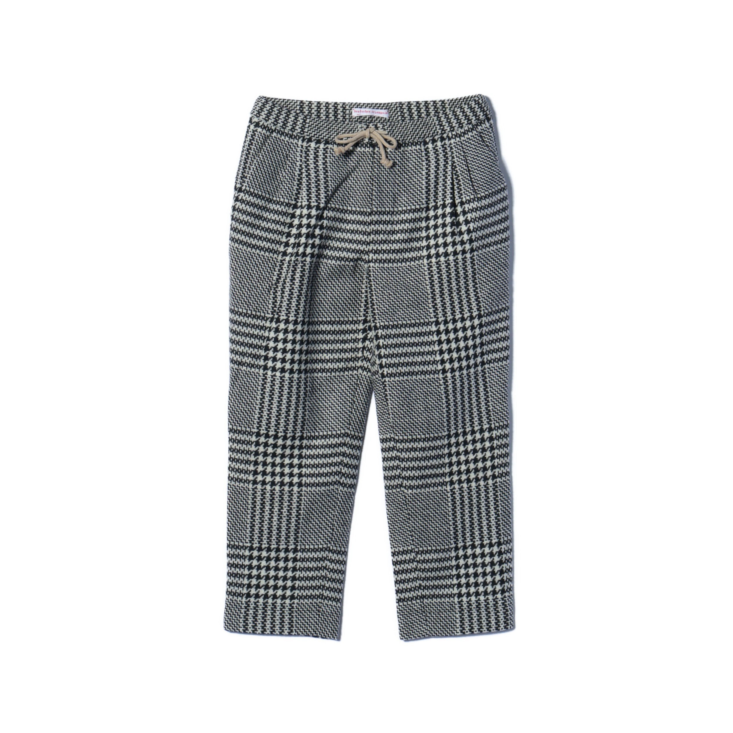 独特な表情のグレンチェック柄が魅力のパンツ。ウエスト部分に紐を配したイージーパンツ仕様になっています。