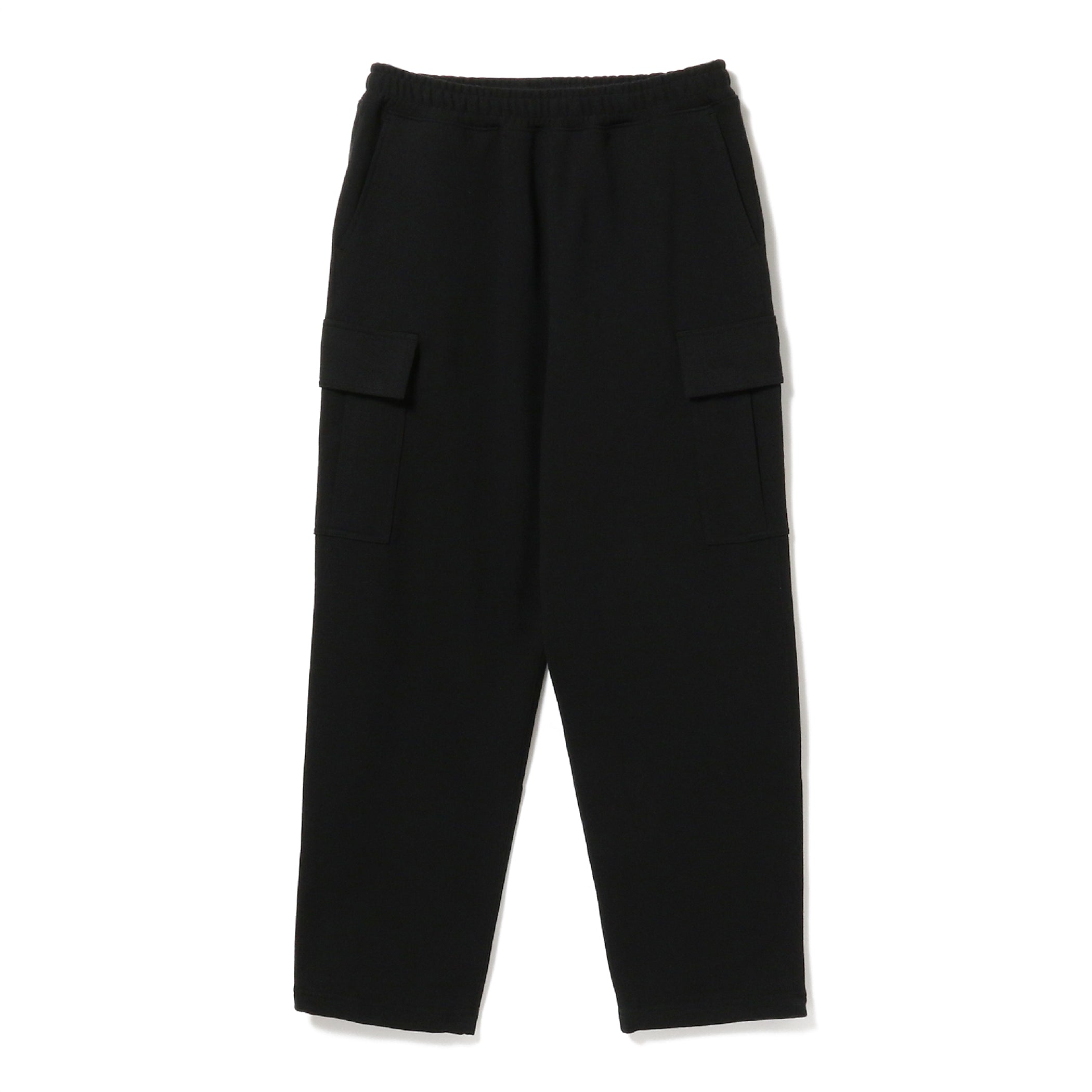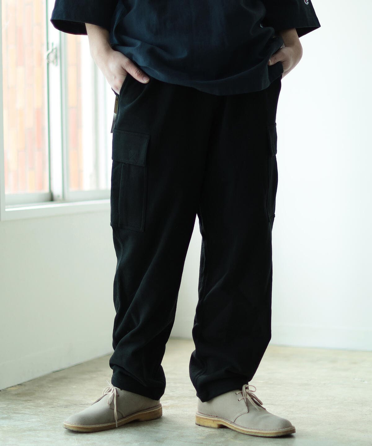 スウェット素材を使用したバギーテーパードシルエットの6ポケットカーゴパンツ。ウエスト・もも周りにゆとりを持たせ、ひざ下からテーパードをかける事で程よいボリュームに仕上げたシルエット。1990年代ストリートシーンを代表するアイテムのスウェットカーゴを現代的にアップデートした仕様です。適度なウェイトの裏毛を使用することでボリューム感もありながら長いシーズンで着用が可能です。ウェストゴム+スピンドル仕様に加え、裾はシャーリングでメリハリのあるシルエットをお楽しみいただけます。