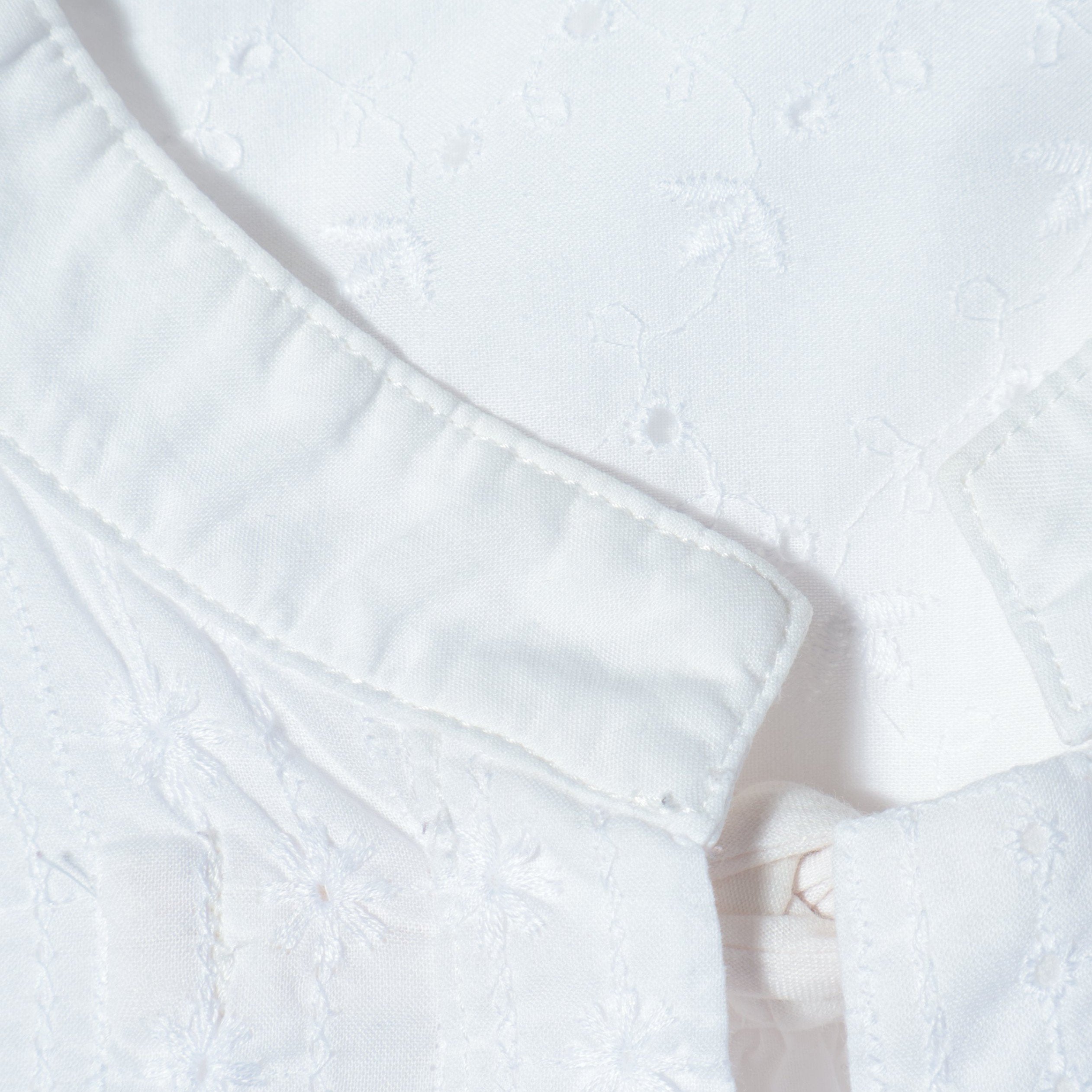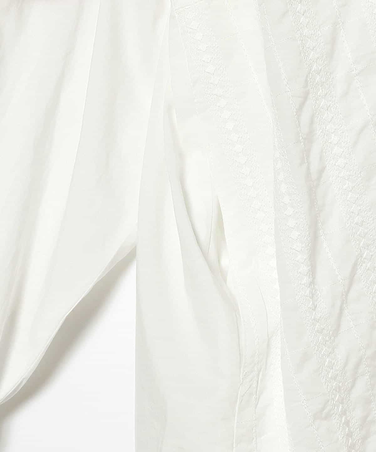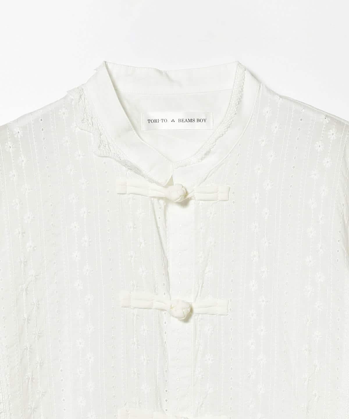 チャイナボタンがアクセントのシャツです。ホワイトはレース使いや透け感が繊細で軽やかなデザイン。他のシャツとはひと味違うひと品です。