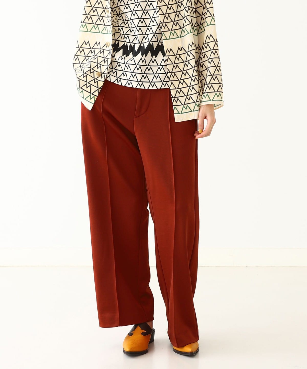 光沢があるジャージー素材を使用したスラックス。裏毛素材の特性を生かし、適度なハリ感とストレッチ性で、綺麗なシルエットとリラックス感を兼ね備えた一着。ワイドシルエットですが、センタープリーツが入ることで、縦のラインが強調され、足長効果も期待できます。ウエストベルトを太くしっかりとさせたり、生地がダレてしまわなように仕立て、ジャージ見えしないよう拘りました。後ろポケット位置を少し高めに設定したりと、どこから見ても綺麗なシルエットが叶うパンツを目指しました。ジャージー素材の着やすさと着た時のハンサムな佇まいが、〈maturely(マチュアリー)〉のイメージにぴったりなアイテム。
