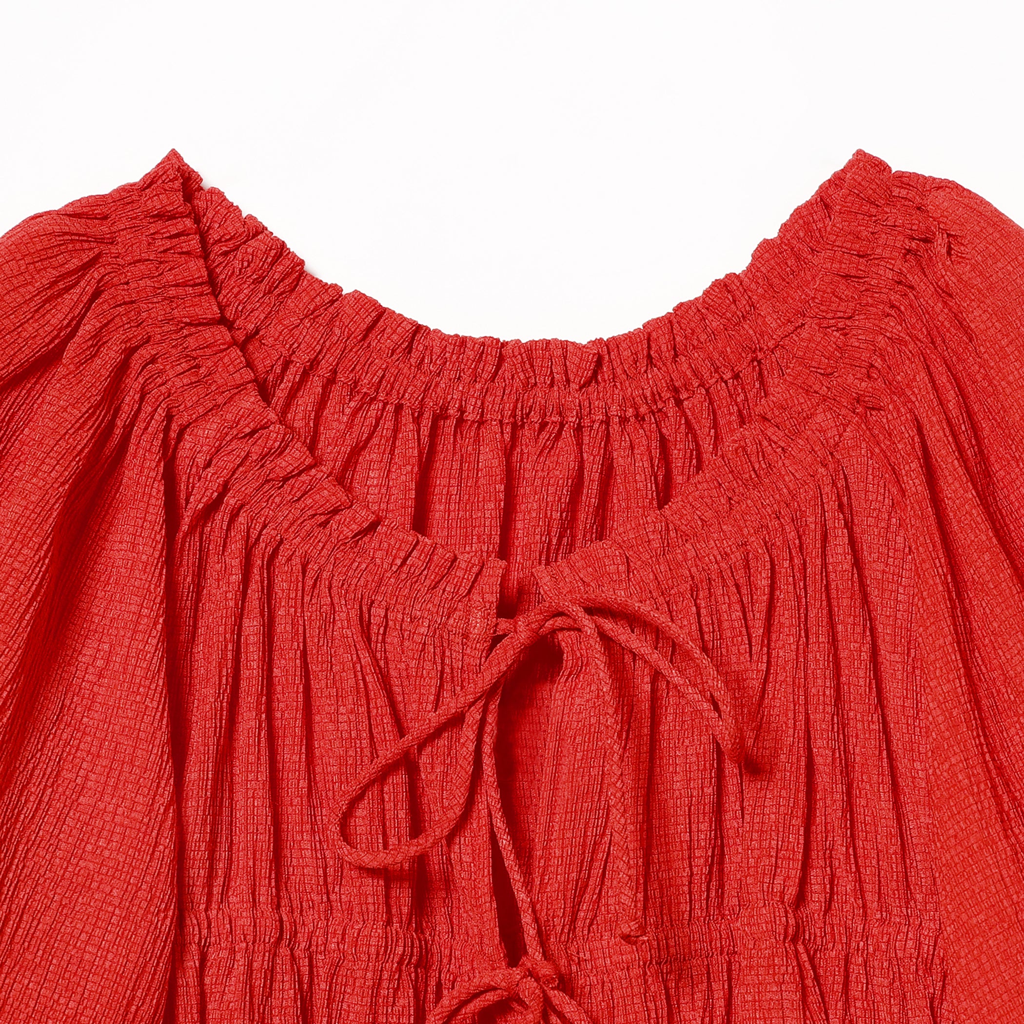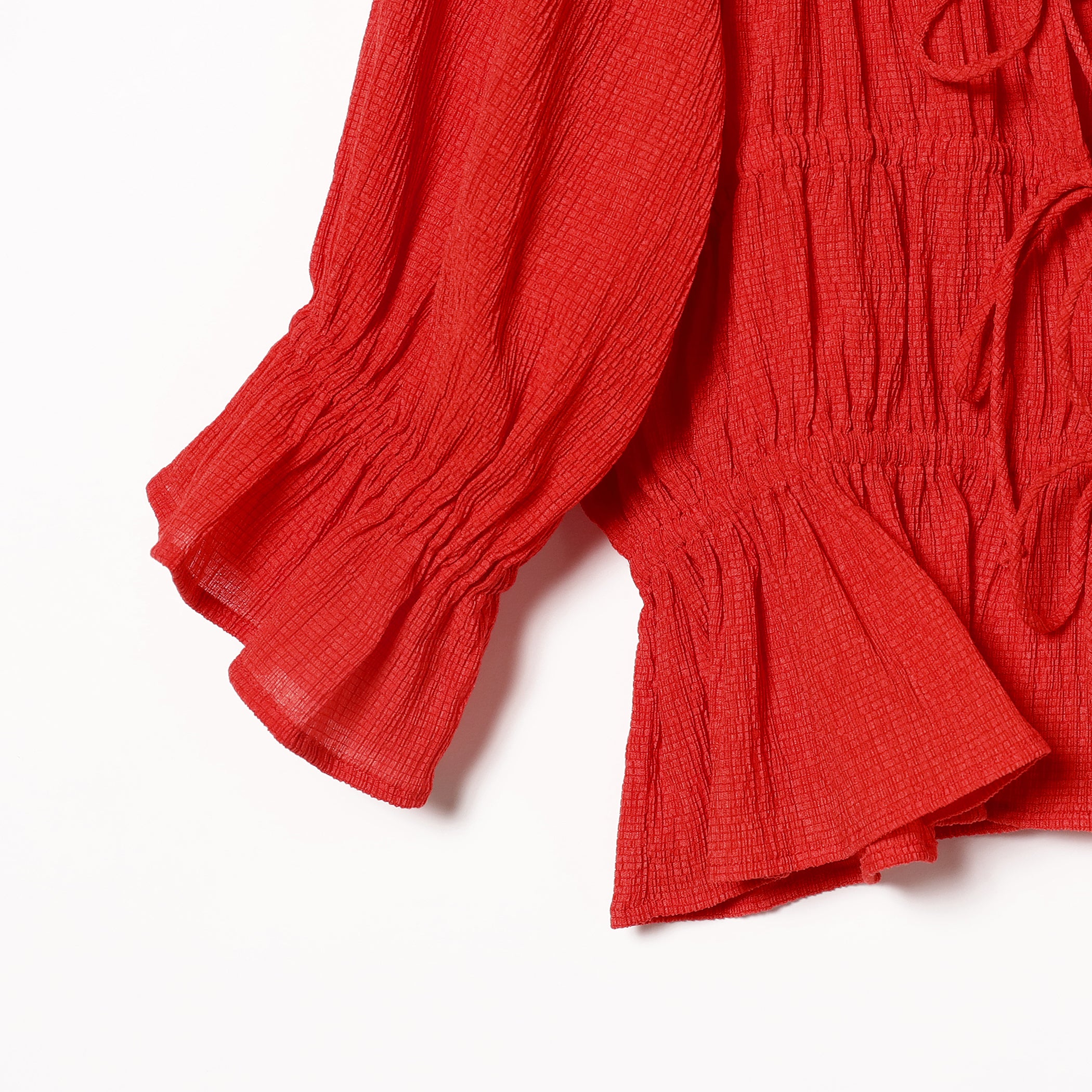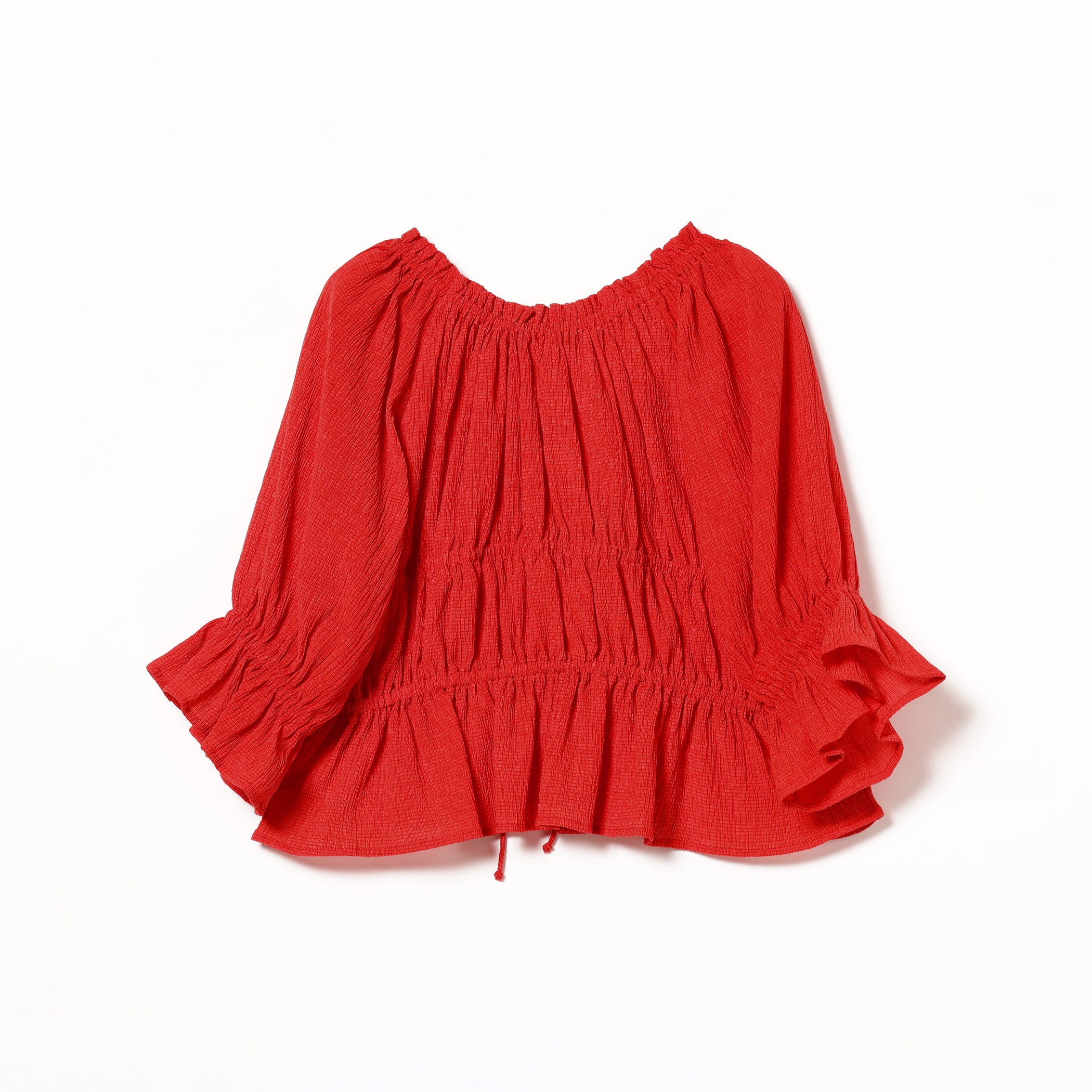 リボンディテールをフロントに取り入れたブラウス。ギャザーをゴムで寄せているので着用しやすいのがポイントです。襟ぐりもゴムが入っているのでオフショルダーとしても◎。前後でも着られ、様々な雰囲気を楽しめるひと品です。