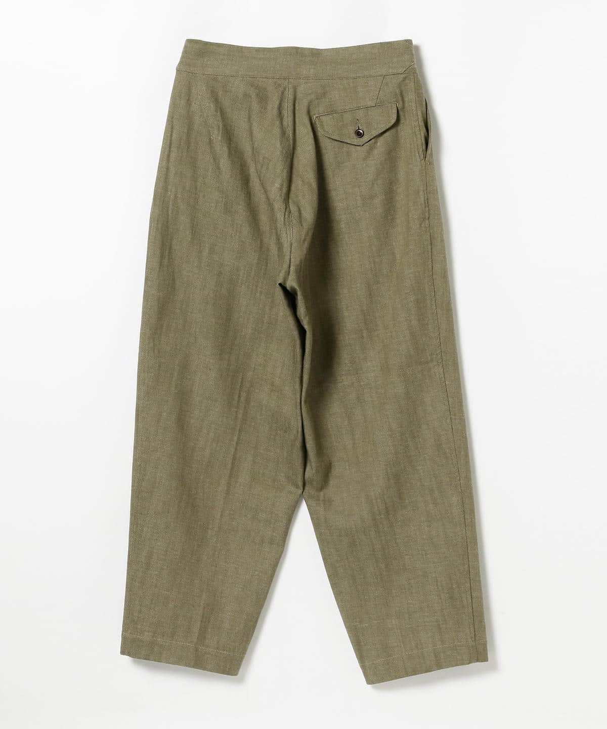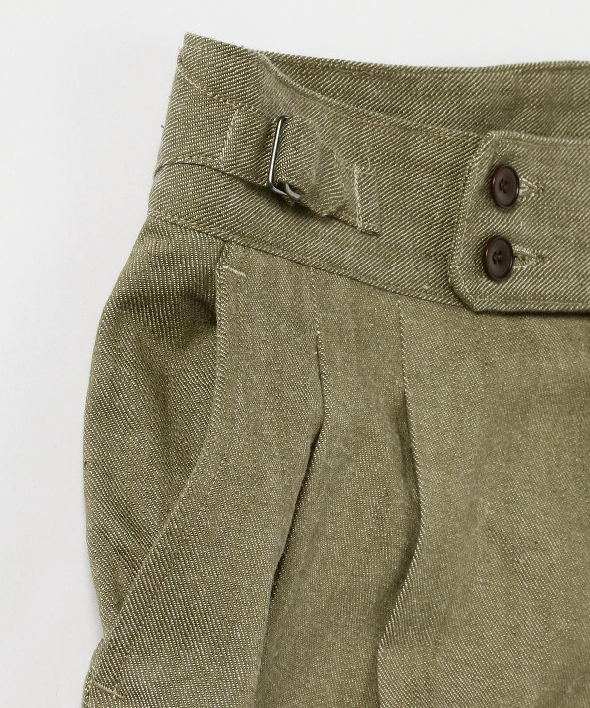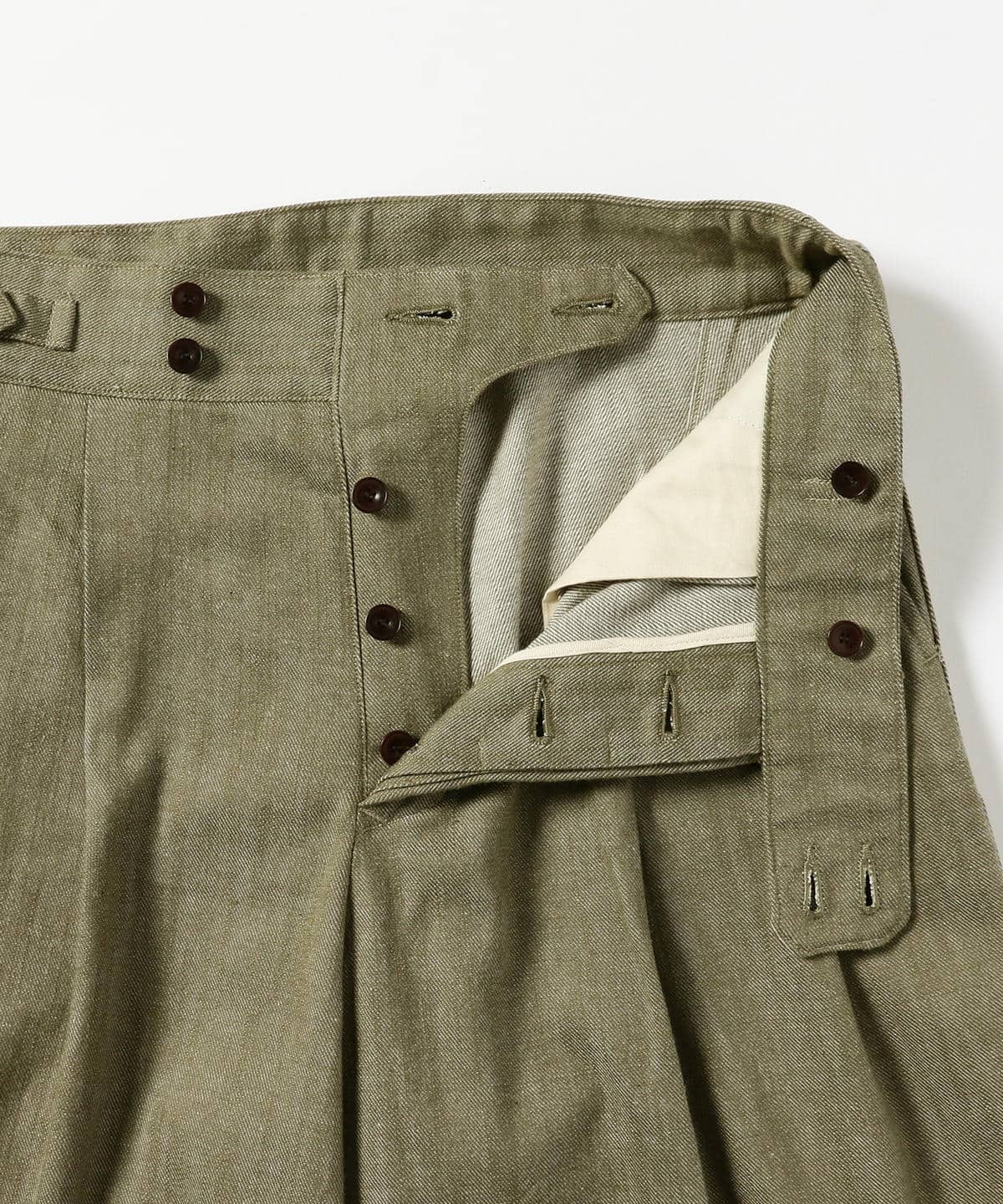 2プリーツの入ったワイドシルエットのグルカパンツ。股上が深く、ウエストの持ち出し、サイドアジャスターなどのクラシックな仕様。素材にはヴィンテージライクなグリーンデニム、ナット釦を使用しており、現代の服にはないノスタルジックな雰囲気に仕上がってます。
