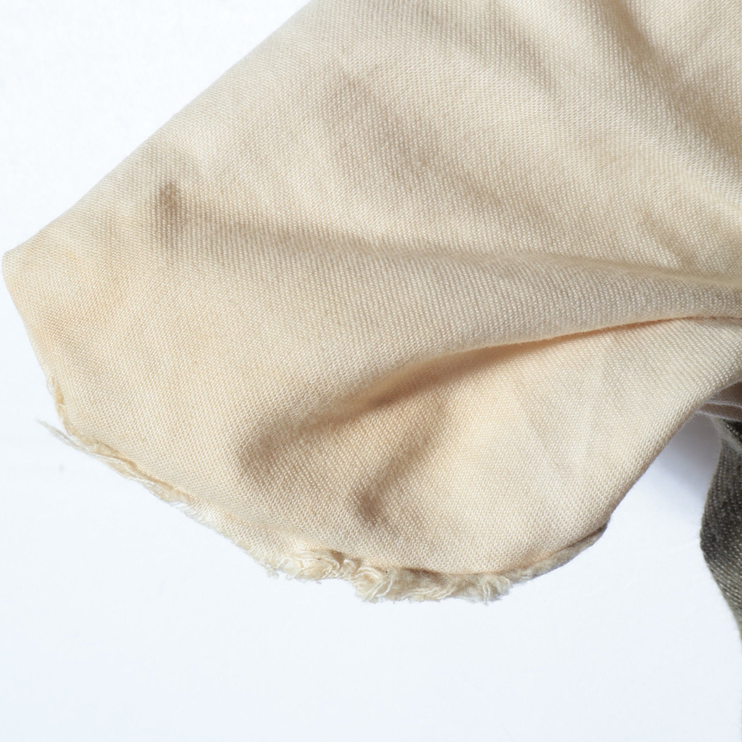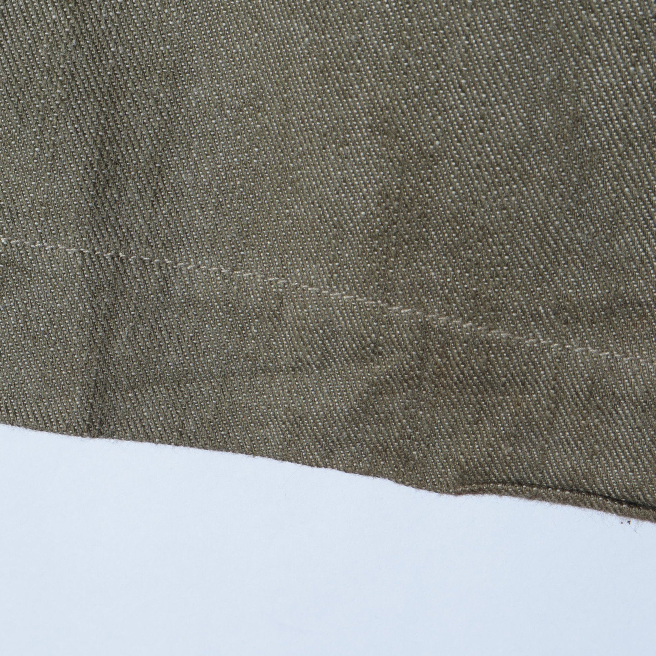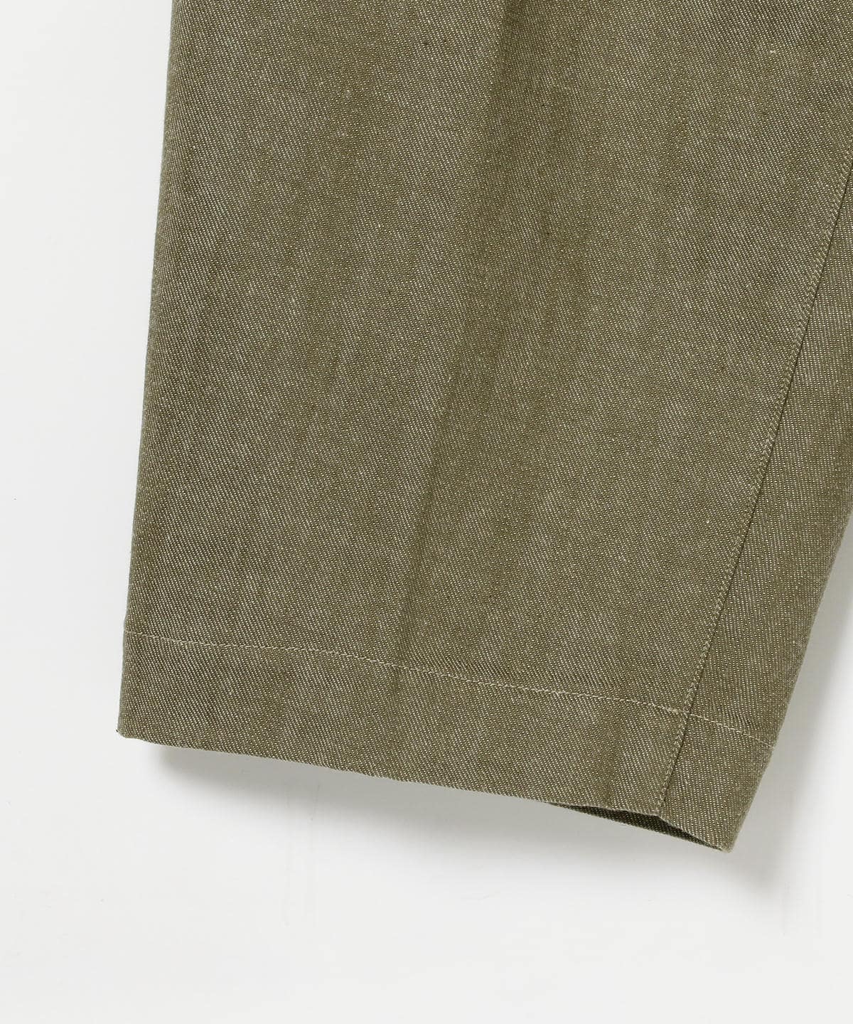 2プリーツの入ったワイドシルエットのグルカパンツ。股上が深く、ウエストの持ち出し、サイドアジャスターなどのクラシックな仕様。素材にはヴィンテージライクなグリーンデニム、ナット釦を使用しており、現代の服にはないノスタルジックな雰囲気に仕上がってます。