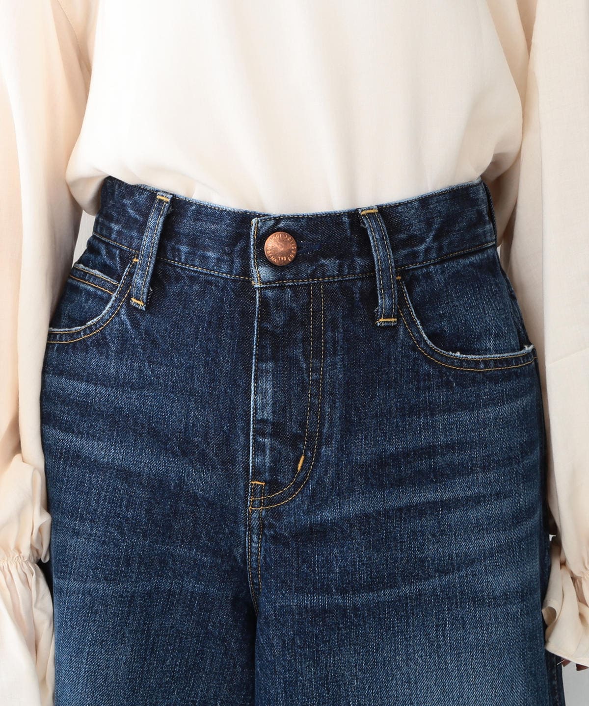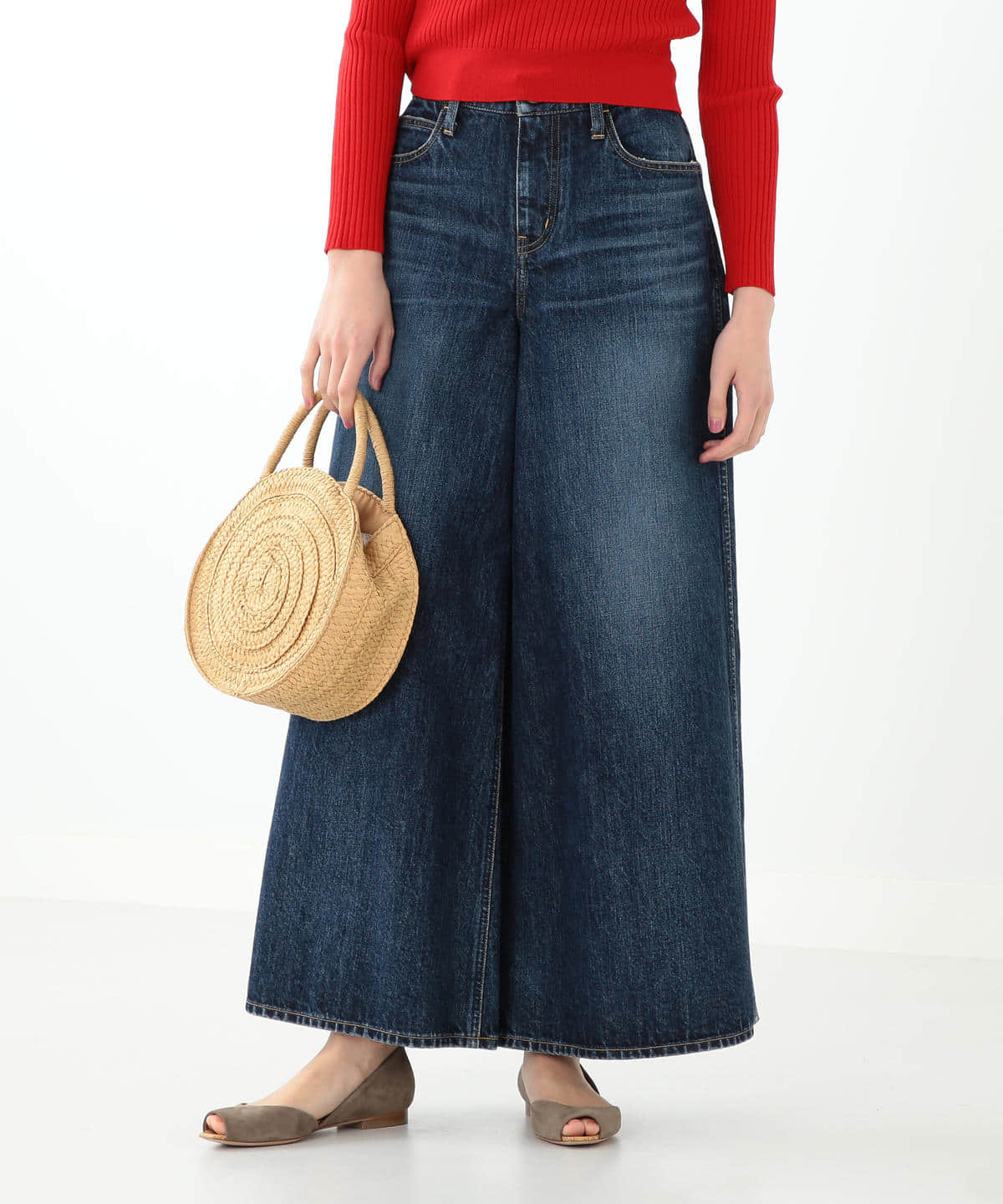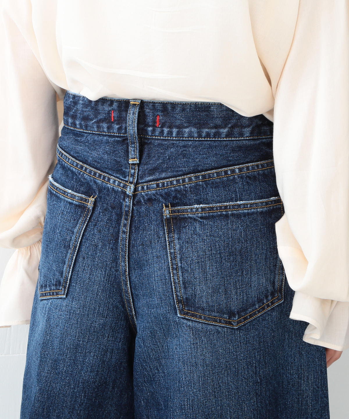 ミドルライズでウエストから裾に向かって緩やかに広がるシルエットなので、美脚効果も◎。日本人の体形に合わせた丈感で、バランス良くお召頂けます。シボ感のあるUSEDデニムのような風合いの生地を使用しています。