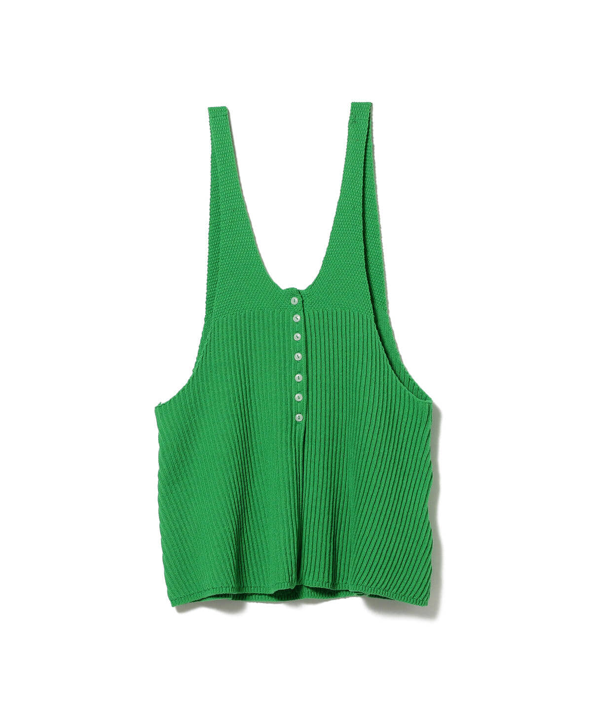 アメリカヴィンテージのウールの水着が元ネタとなった、華奢でレトロなタンクトップ型のニットベストです。ボタンもこだわりの猫目ボタンを採用しています。ワークアイテムのコーディネートのはずしとして活躍すること間違いなしの1着です。