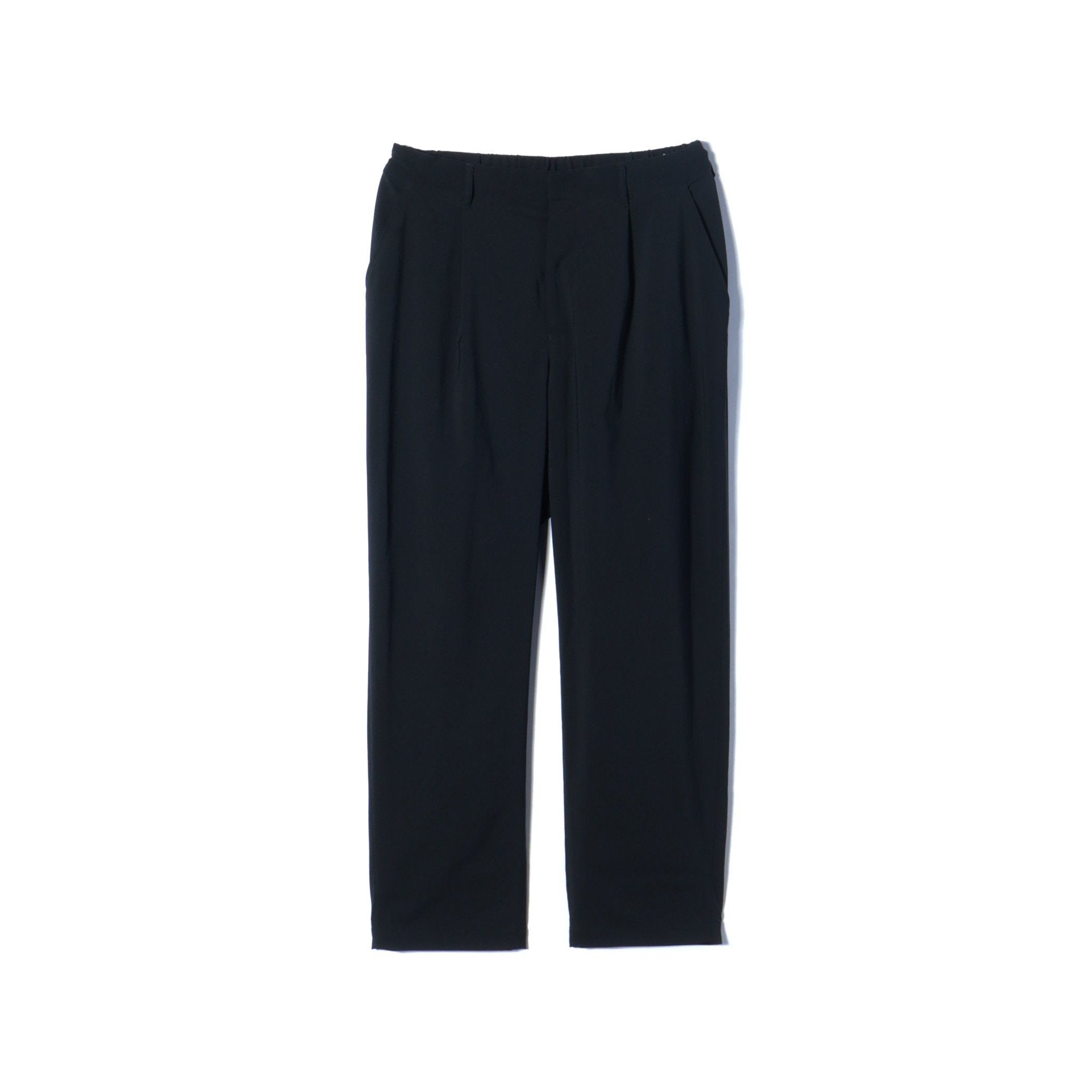 麻のようなドライな質感を実現したストレッチ素材『EVALET』を用いた、全てのジェットセッターに向けた1プリーツスラックス。ボタンはブリムスナップを使用しサイレントな表情に仕上げました。後ろ身ポケットの上部にはリフレクタープリントを配し、ポケットへパッキングが可能。内側にドローコードがあり、ベルトレスで着用していただけます。