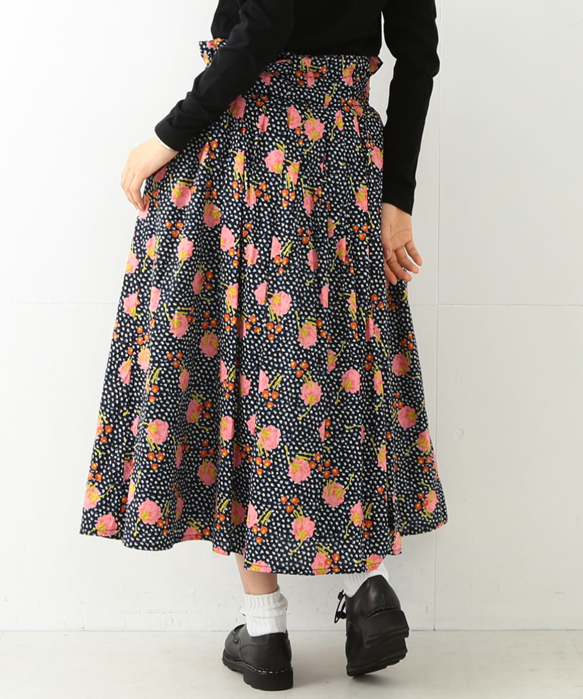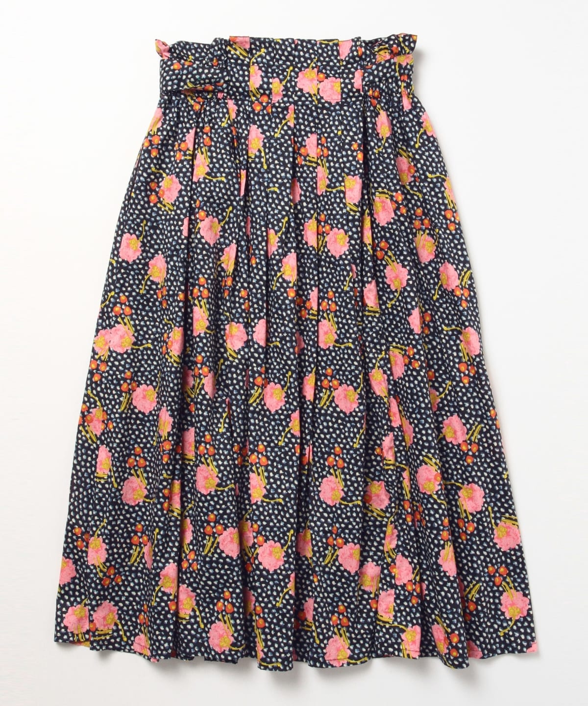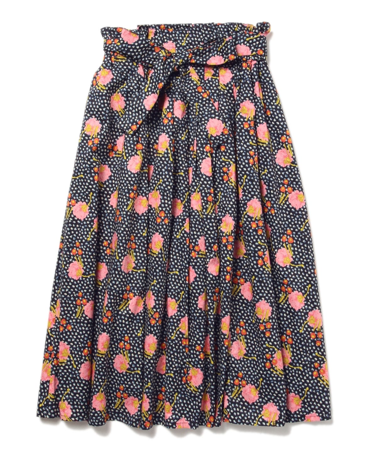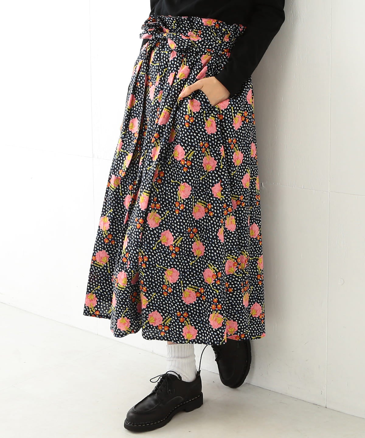 『Juniper(ジュニパー)』というパターンは、神秘的な動きの東洋のダンスからインスパイアされ、貴重なオニゲシの花が何にも縛られずダイナミックに描かれておりオリエンタルな印象です。キャンディの包み紙をギュッと絞るようなフォルムに見えることからキャンディウエストとネーミングしたスカート。前身、後身どちらの面をフロントにしてもアレンジできるリボン留めも搭載しています。