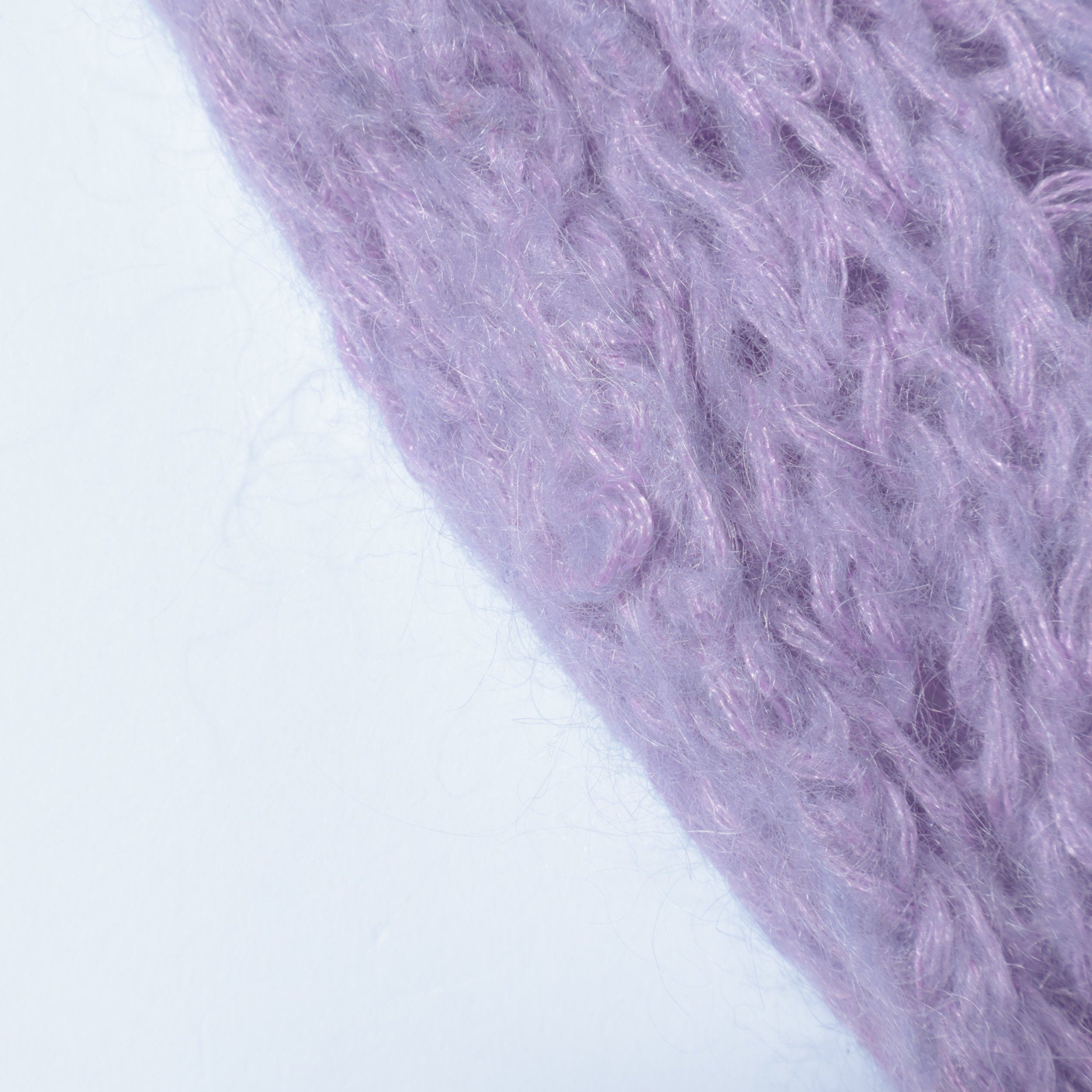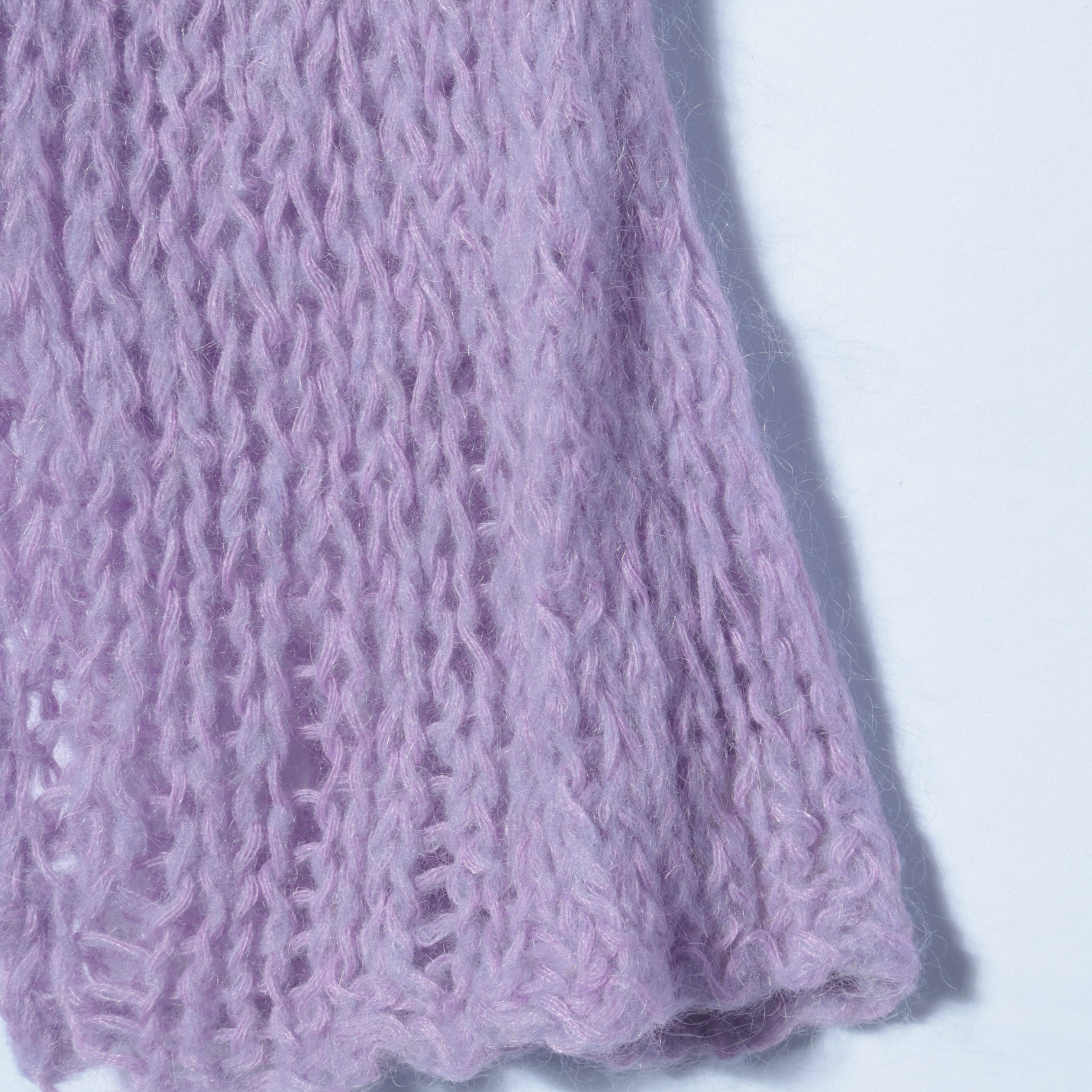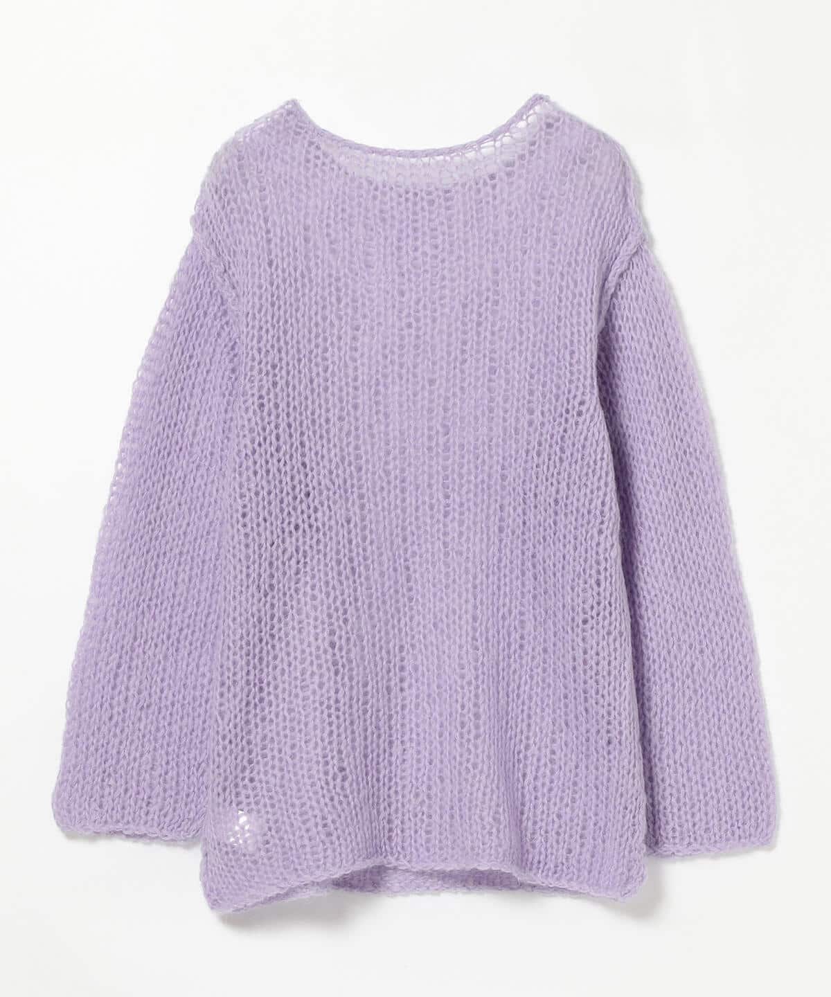ロゴTシャツや柄のインナーと合わせたりと、レイヤードが楽しいニットです。毛足が長いモヘヤを使用しているため、軽い質感ながらも高級感のあるひと品。手編みならではのラフな雰囲気が、どこか古着のニットのような温かみも与えてくれます。