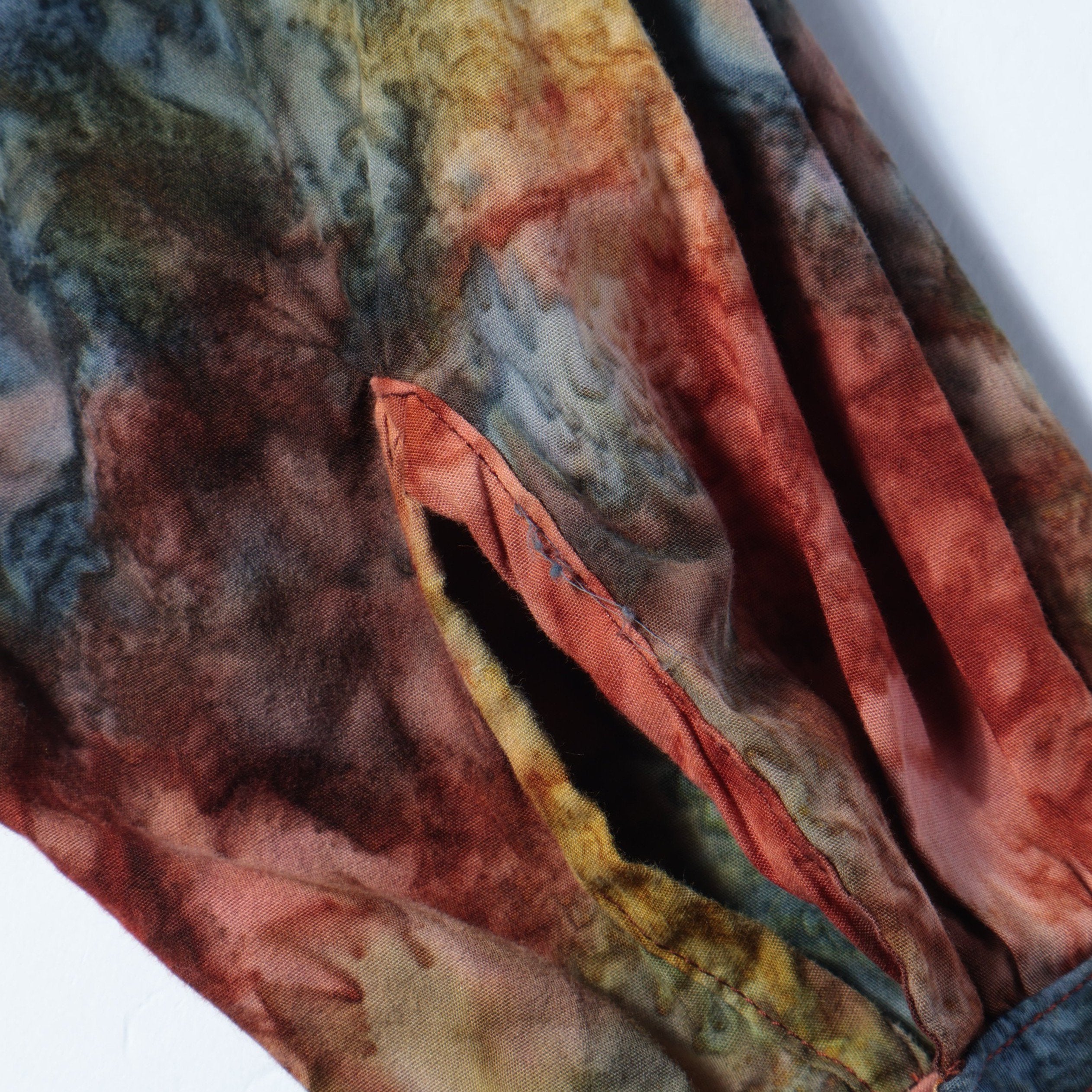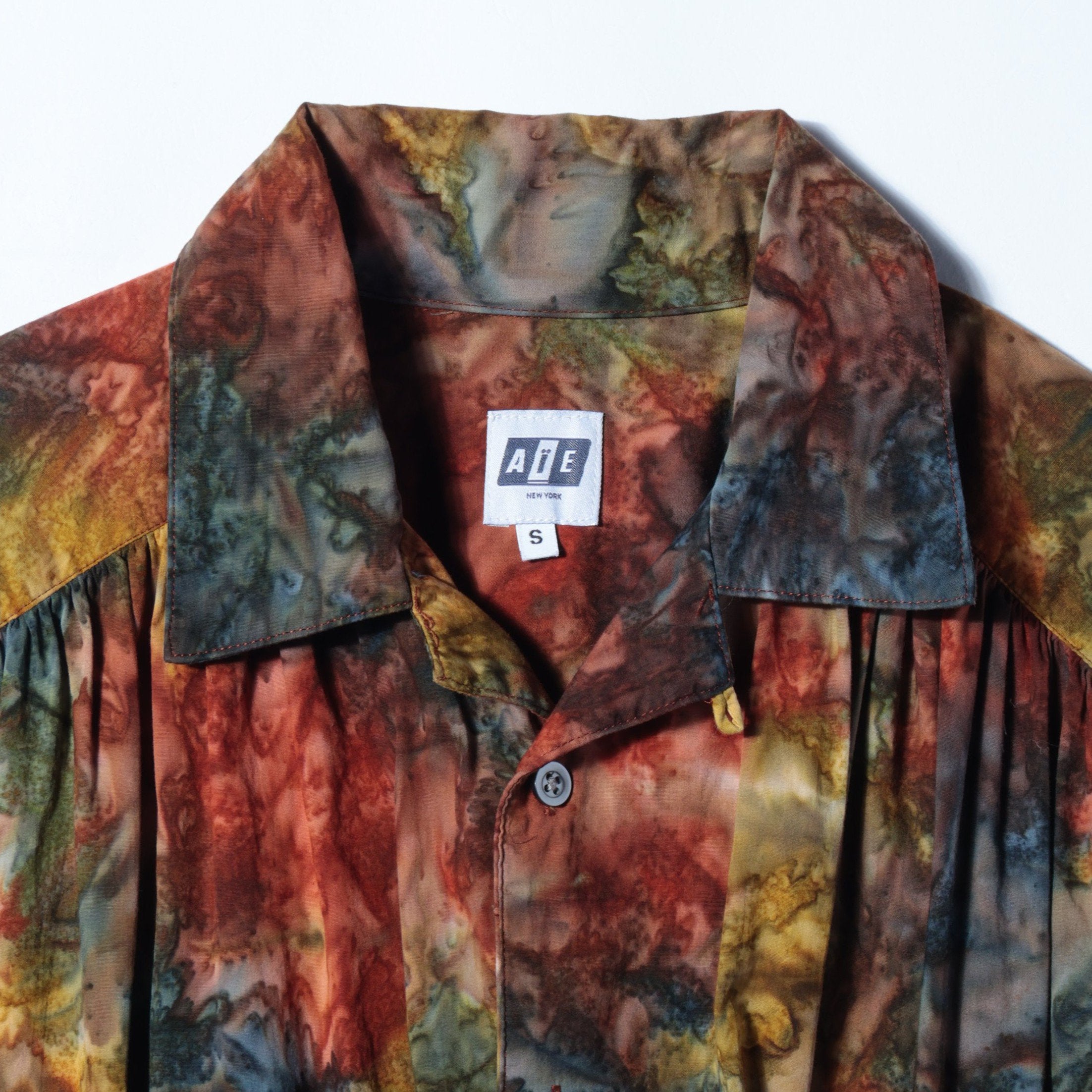 〈AiE〉ならではの複雑な配色が魅力のシャツ。フロントとバックに大胆にほどこされたギャザーが独特なシルエットを演出します。