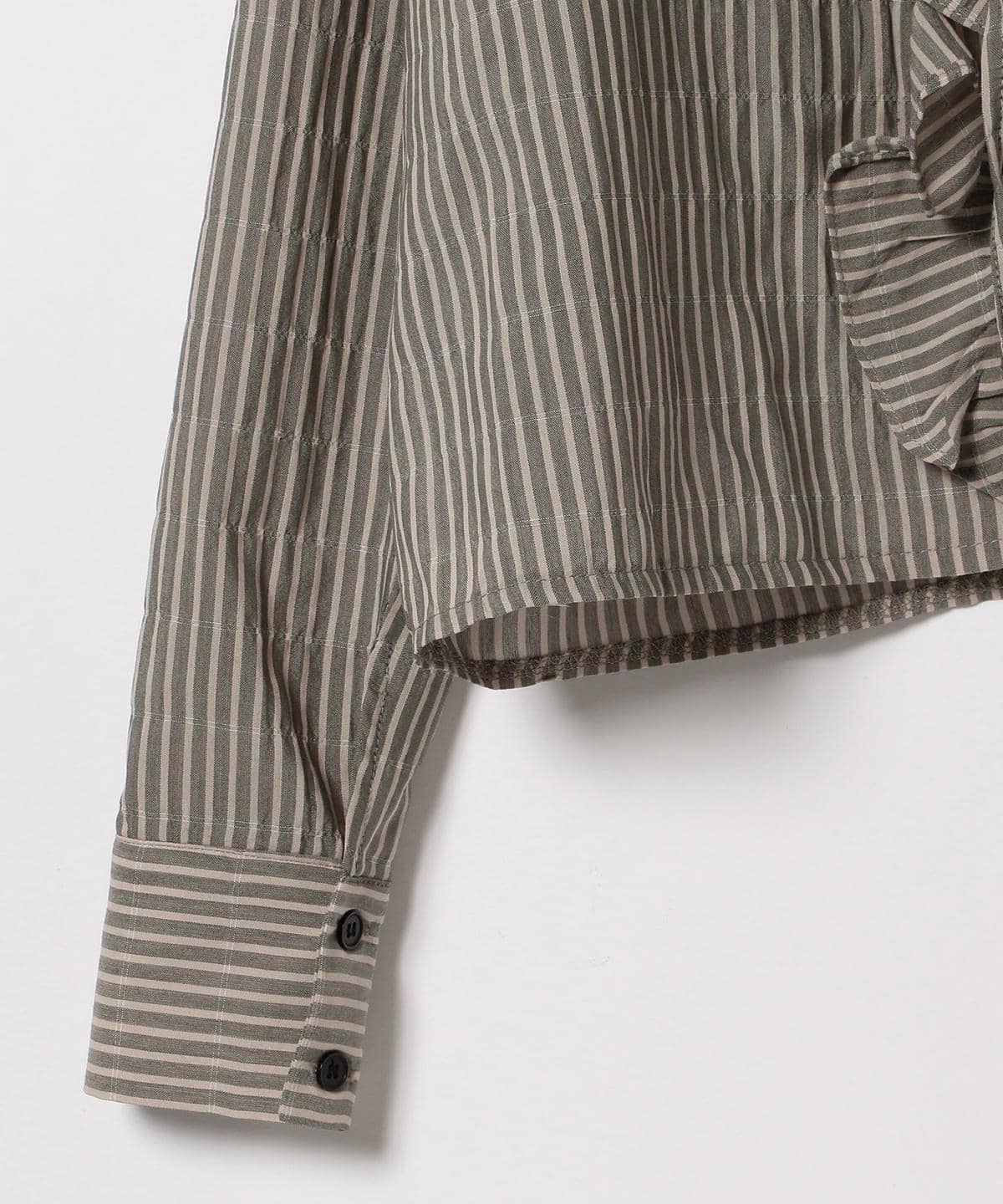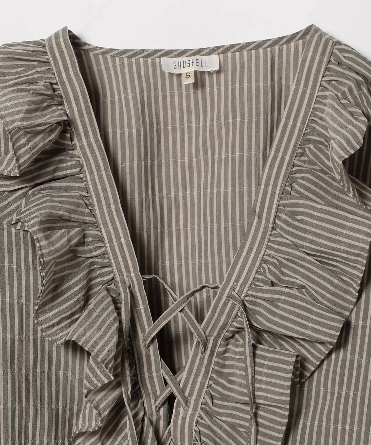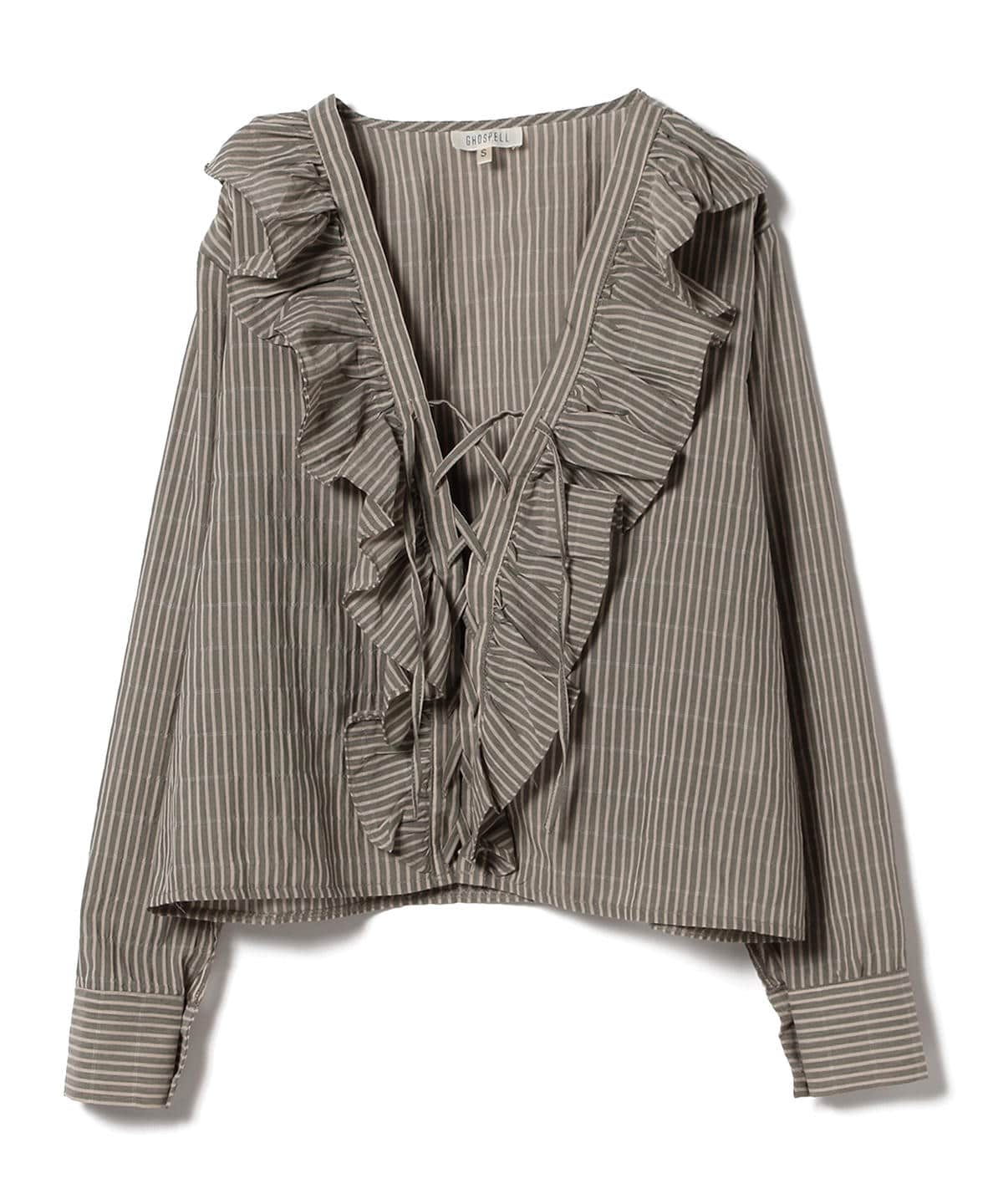 レースアップや大きめのフリルなど、〈GHOSPELL(ゴスペル)〉らしい甘めのテイストに、深めのVネックとストライプで大人っぽい印象をプラスしたフェミニンなブラウス。