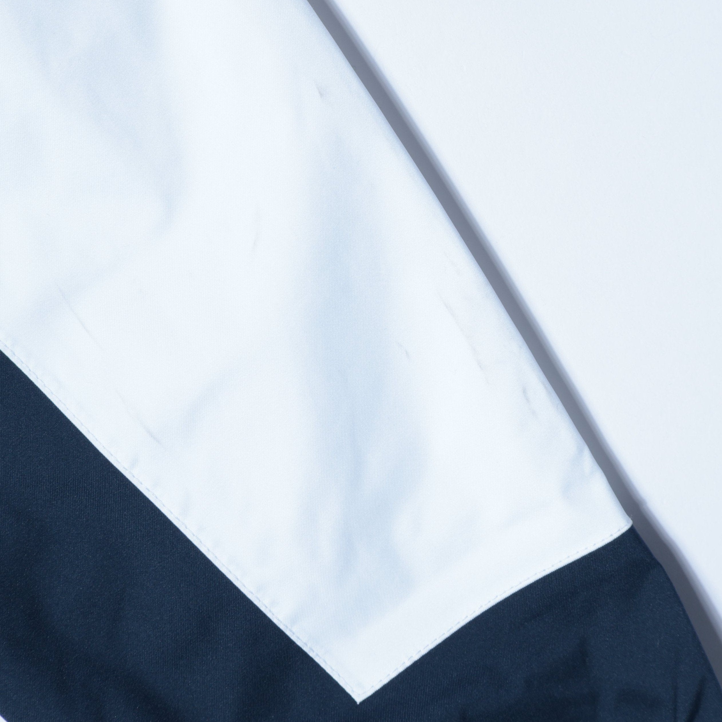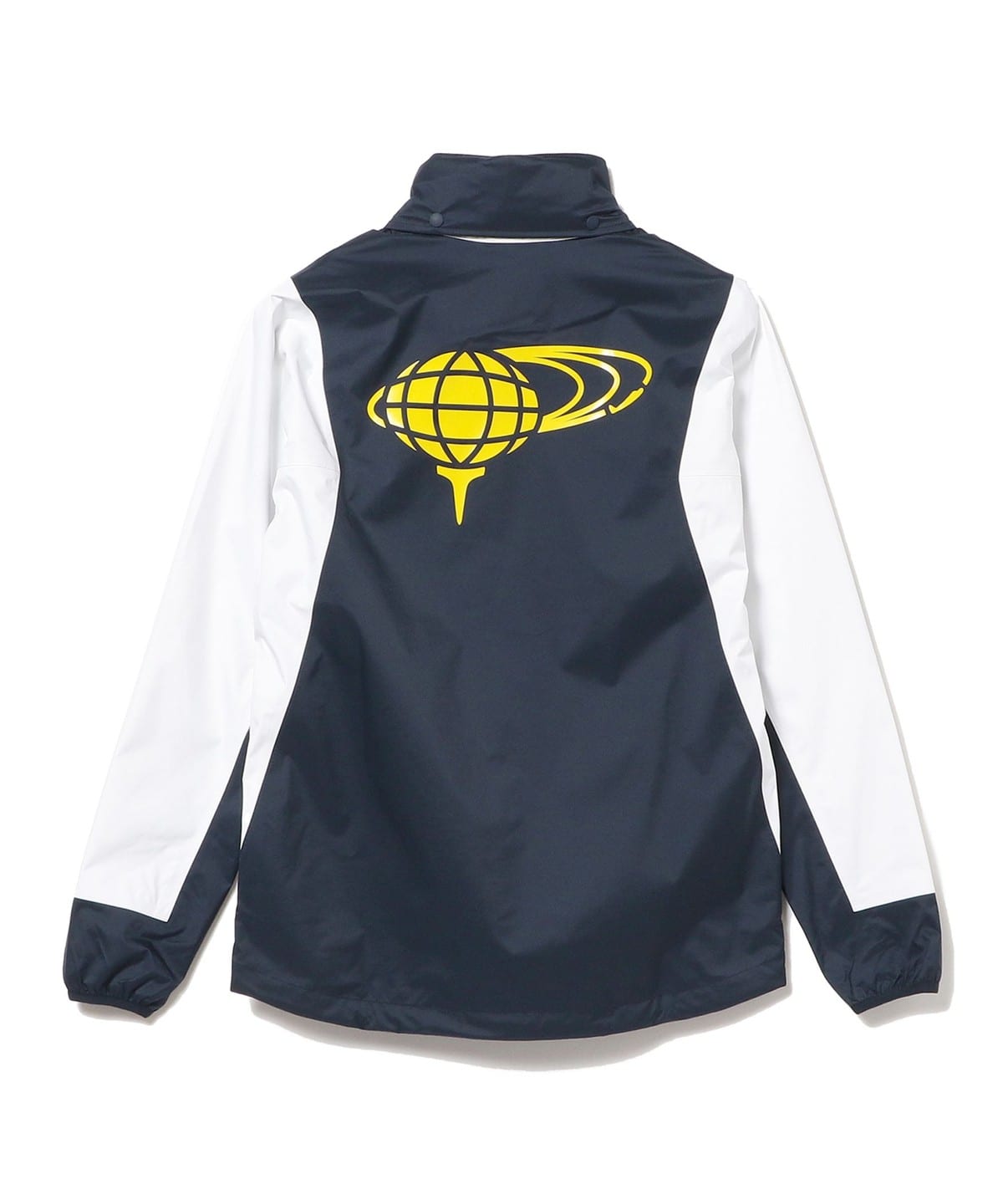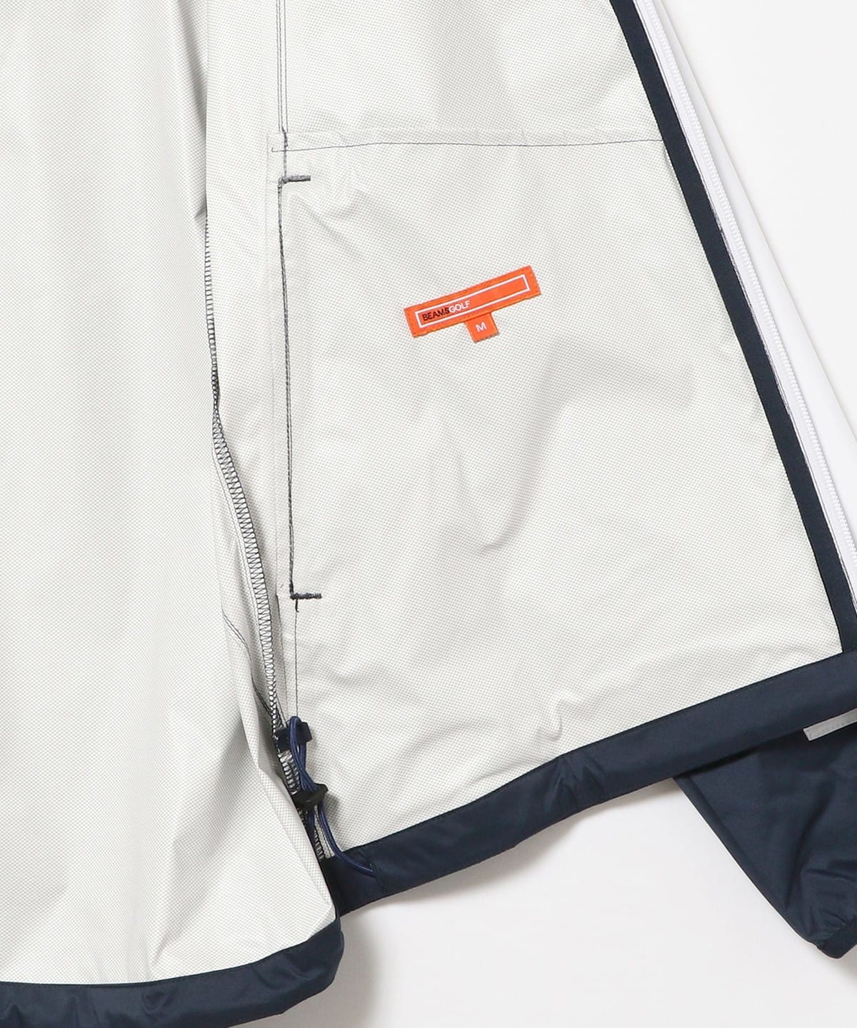 透湿防水生地を使用した新しいデザインの撥水ウェア。1色のシンプルなウェアが多い中、2トーンカラーの配色と大きく〈BEAMS GOLF〉のロゴを入れたデザインにこだわって製作した1着です。襟中にフードを収納でき、肩回りや首回りの雨の当たる部分にはシームテープを使用していることで、雨の日に対応できる重宝アイテム。