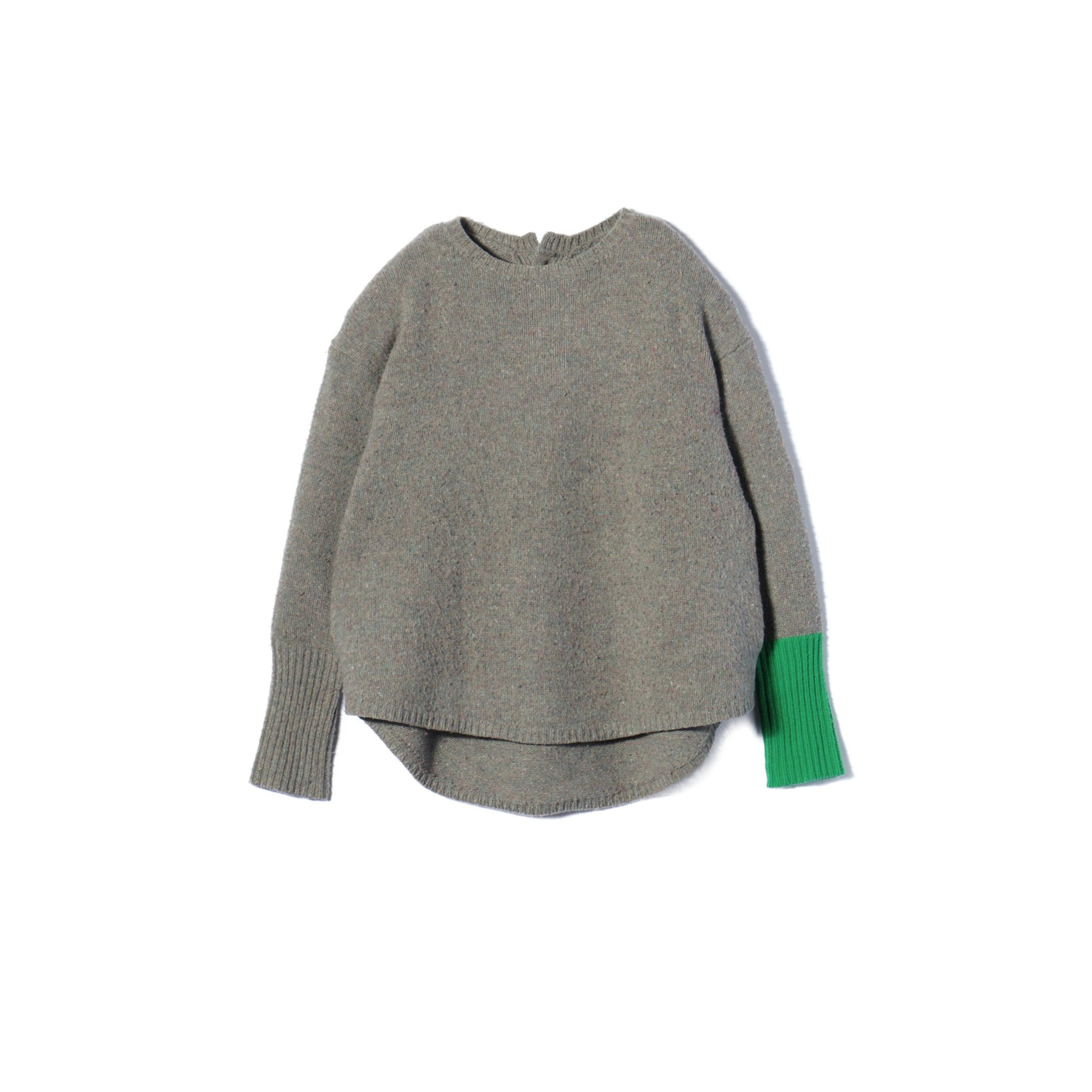 袖の配色が目を引くアイテム。後ろ身頃が長い仕様になっています。背中に配したボタンもデザインアクセントになっています。