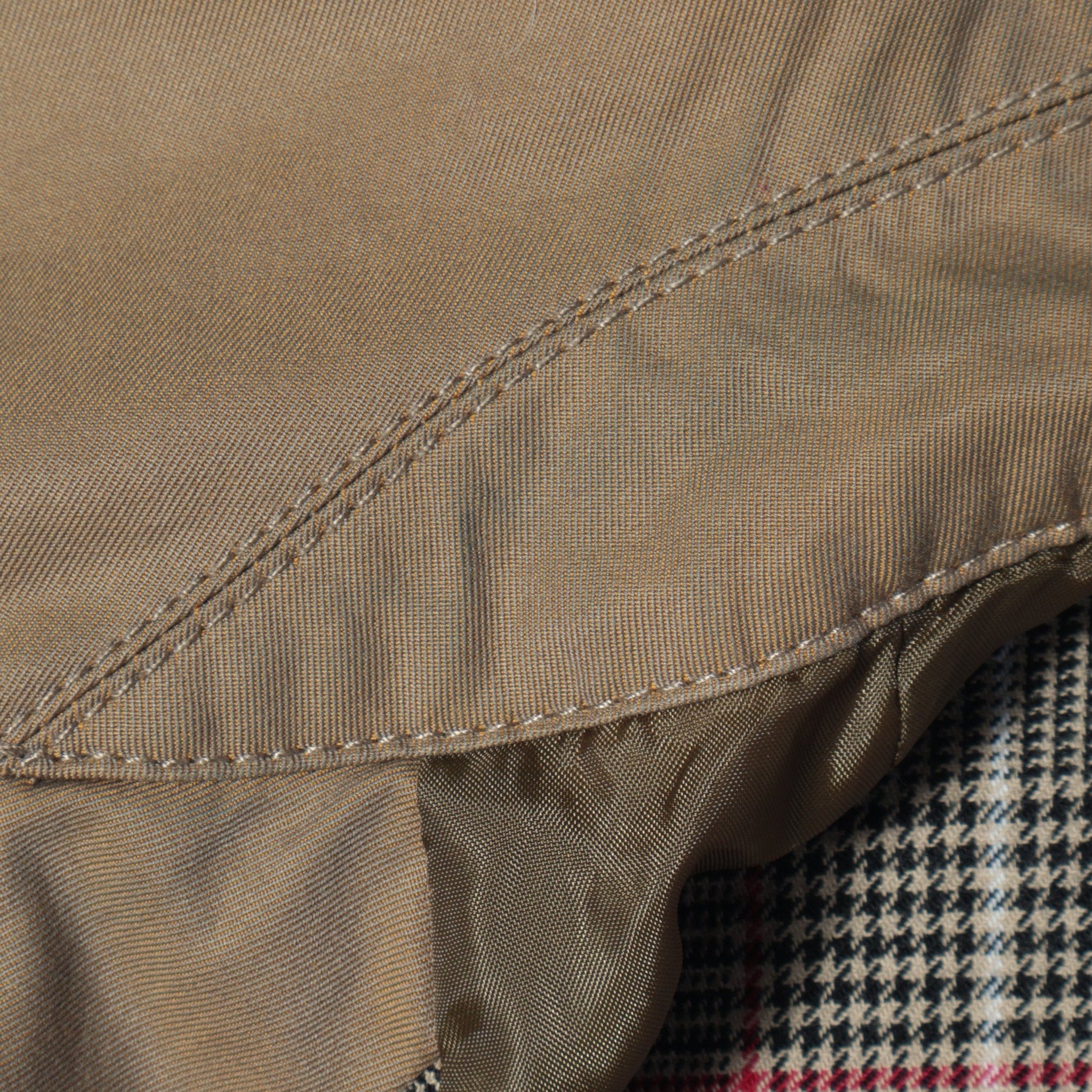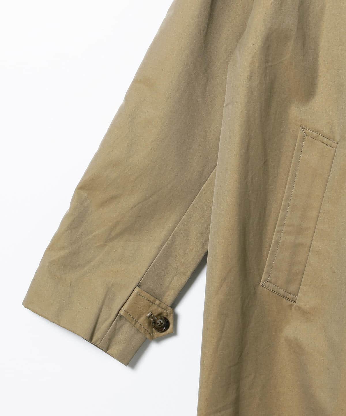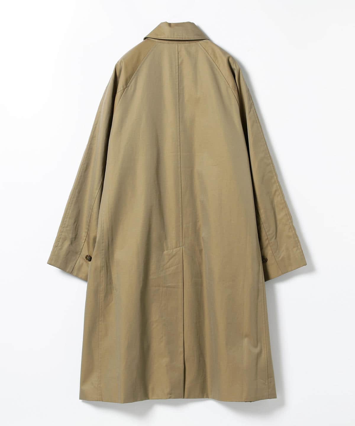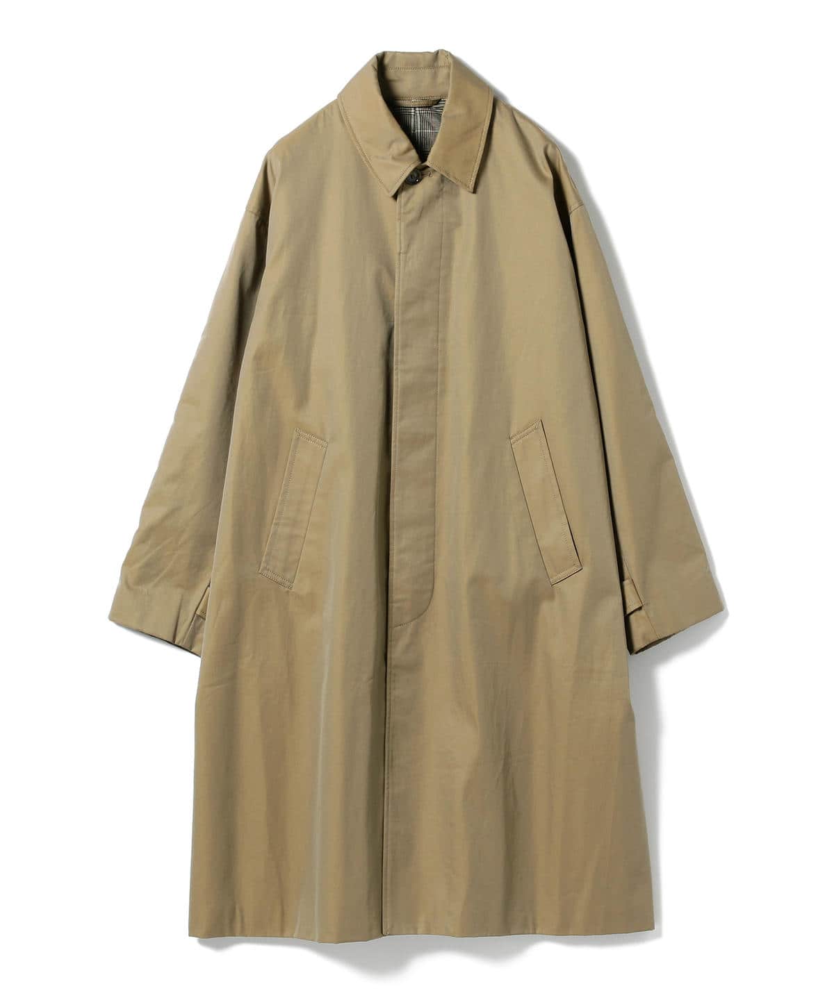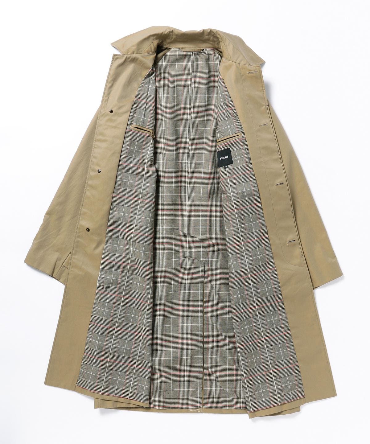 ビッグシルエットのステンカラーコート。裏地には〈BEAMS(ビームス)〉オリジナルのグレンチェック柄を採用してシックな雰囲気も醸しつつ、現代的なフィッティングにアップデートしています。生地には撥水性をもたせ、デイリーユースにもぴったりです。
