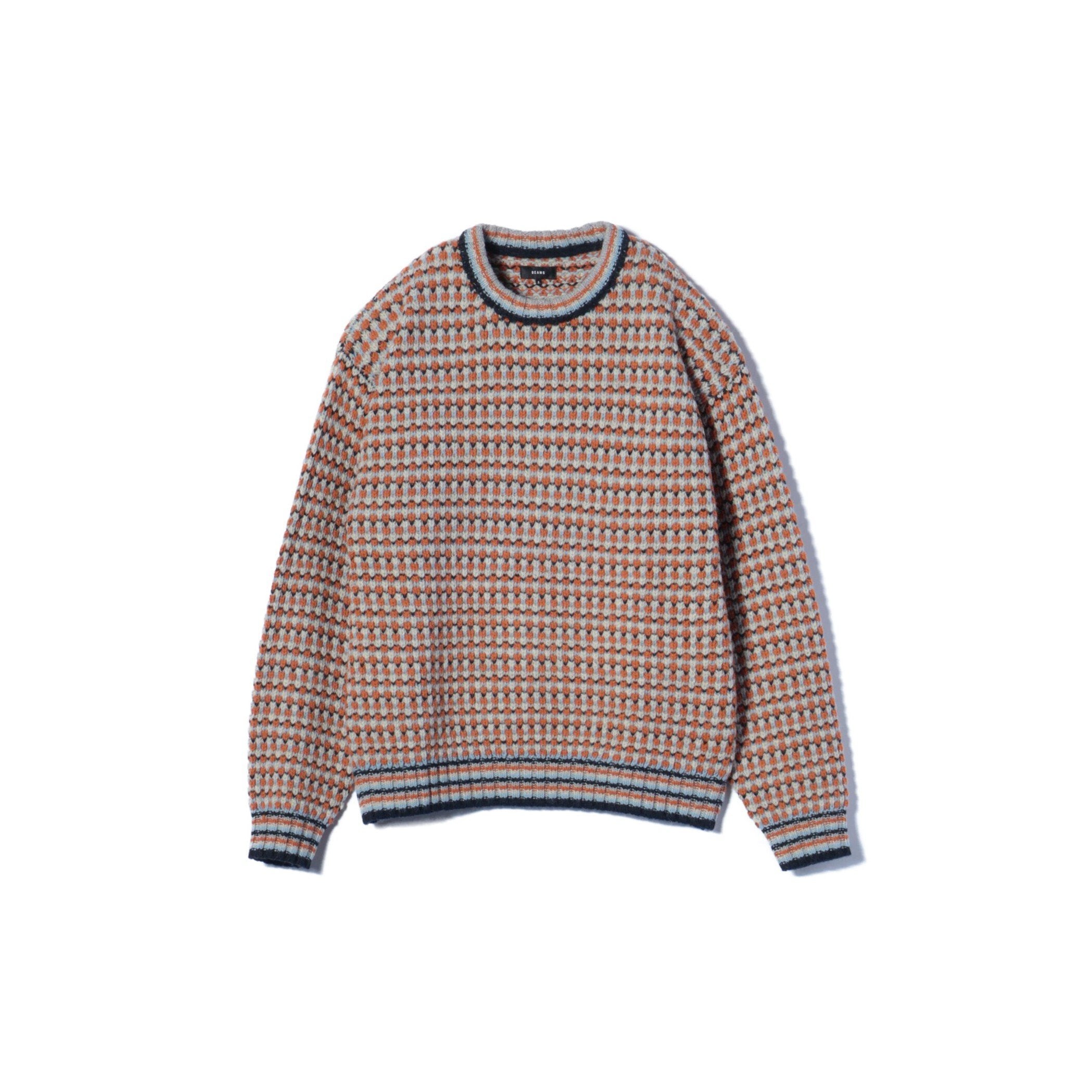 シングルジャカード織りを用いて独特の柄に仕上げたクルーネックニット。ヴィンテージライクな風合いを持つ一枚で、スタイリングの主役になれるアイテムです。