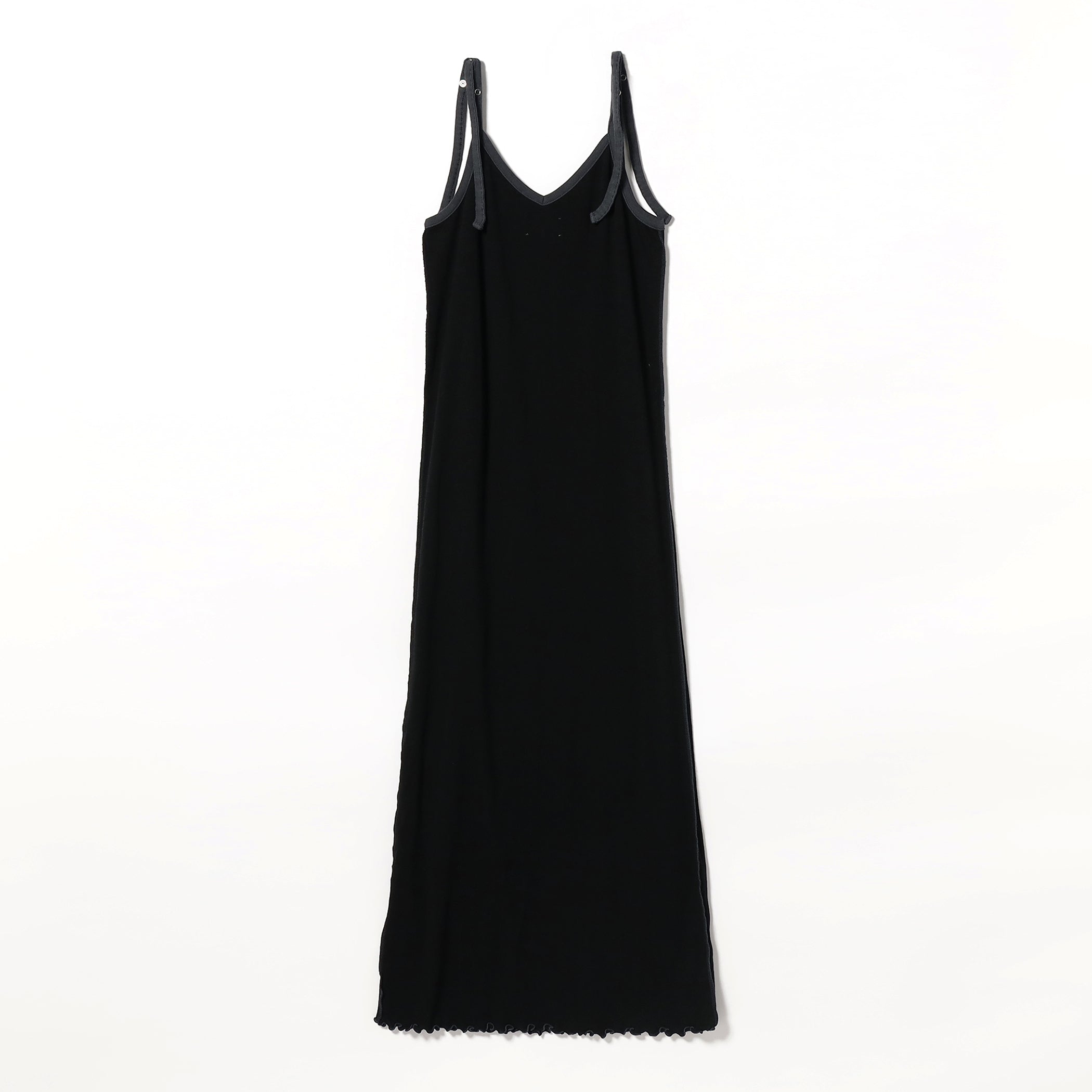 タテを強調したIラインが美しいワンピース。バインダー部分や糸色などはボディカラーと少し異なる配色でポイントを作りました。バインダーを長くしたストラップ部分は留め、結びなどのアレンジが効きます。