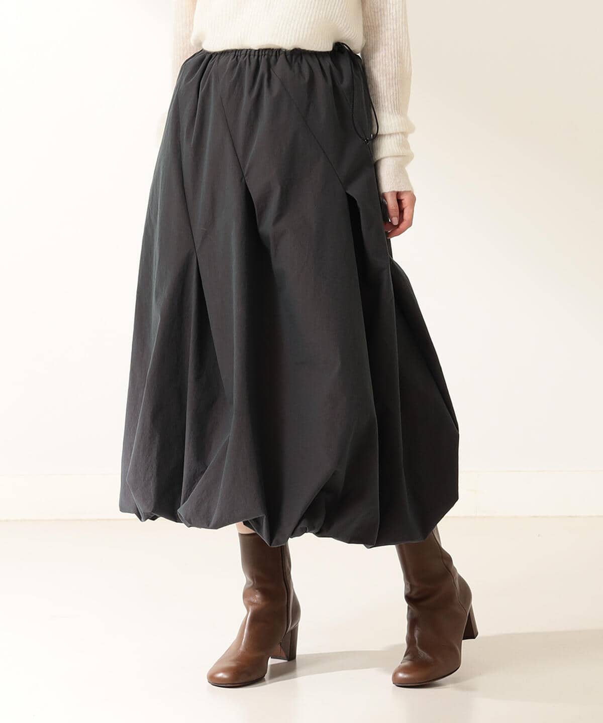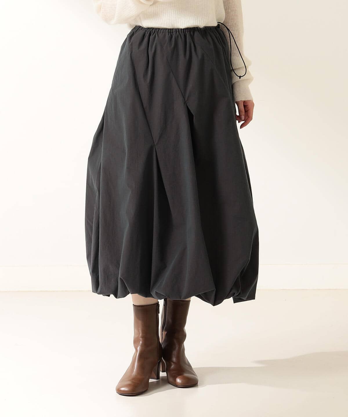 エレガントな中にひとさじのスポーティーさが加わったバルーンスカート。ウエストはゴム仕様でドローコードで調整可能です。