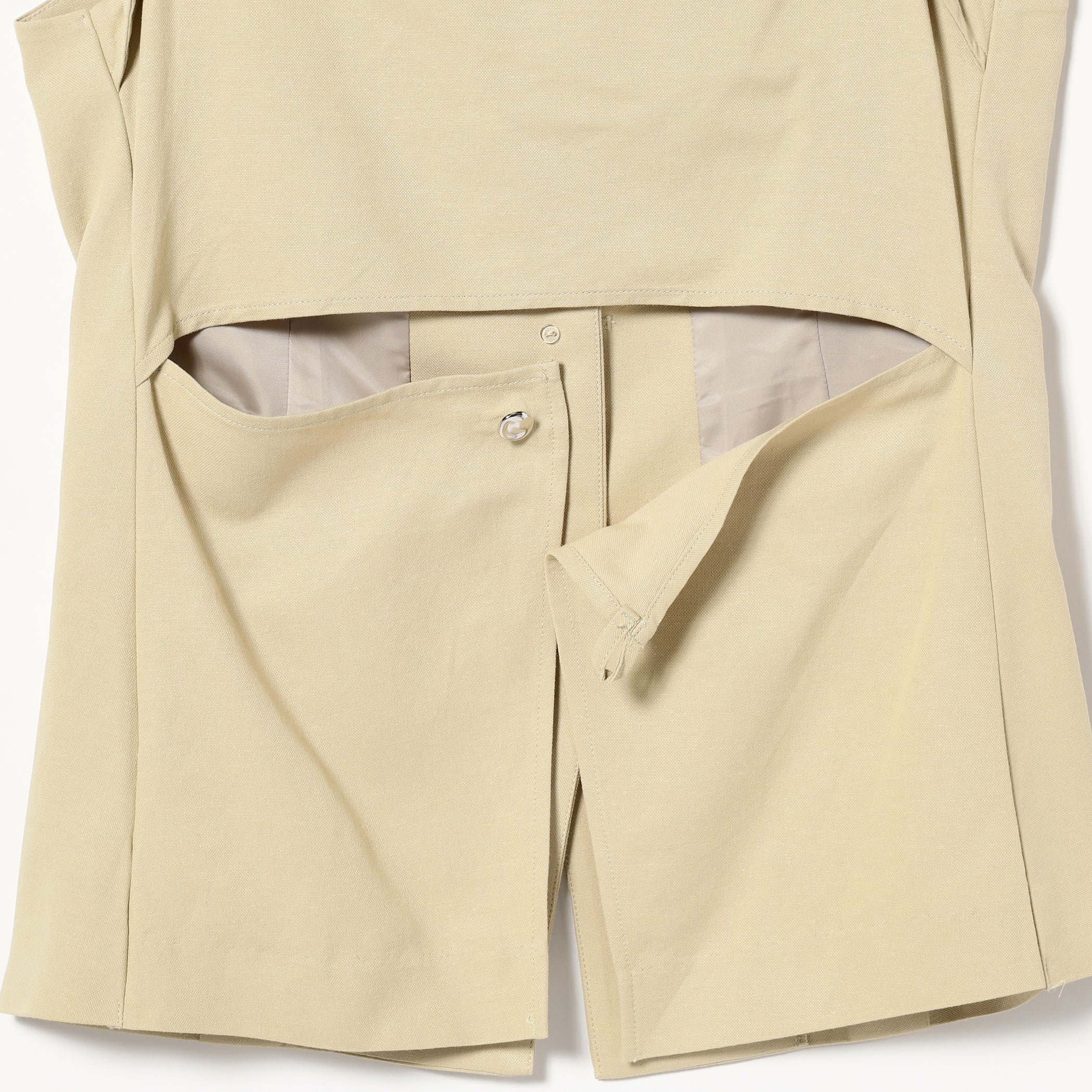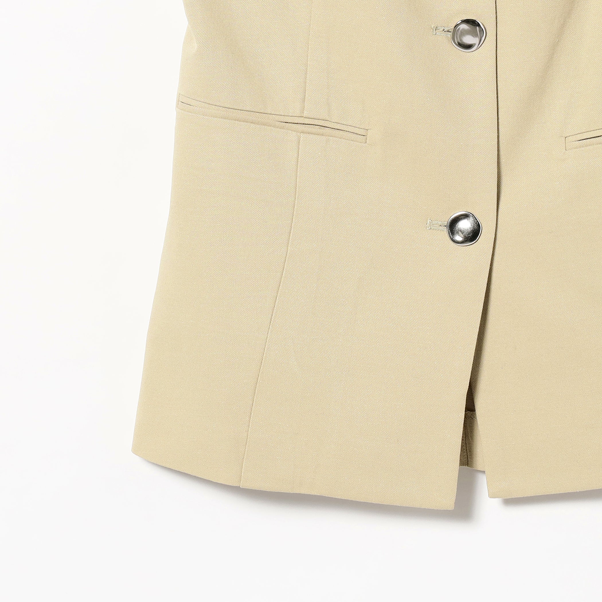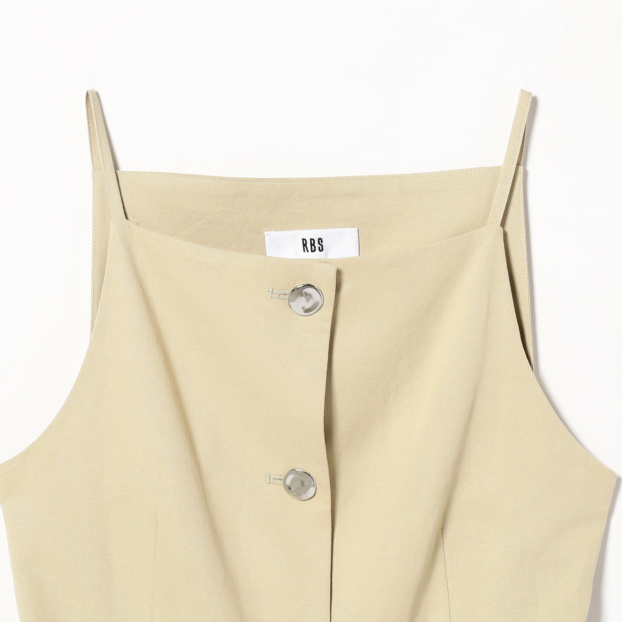前後でデザインに変化をつけたアシンメトリーデザインのキャミソールベスト。ナチュラルなリネンに相反する大胆な肌見せデザインと、アクセサリーのように輝くメタルボタンを組み合わせ、コントラストを際立たせています。大人の肌見せスタイルを楽しめるひと品。