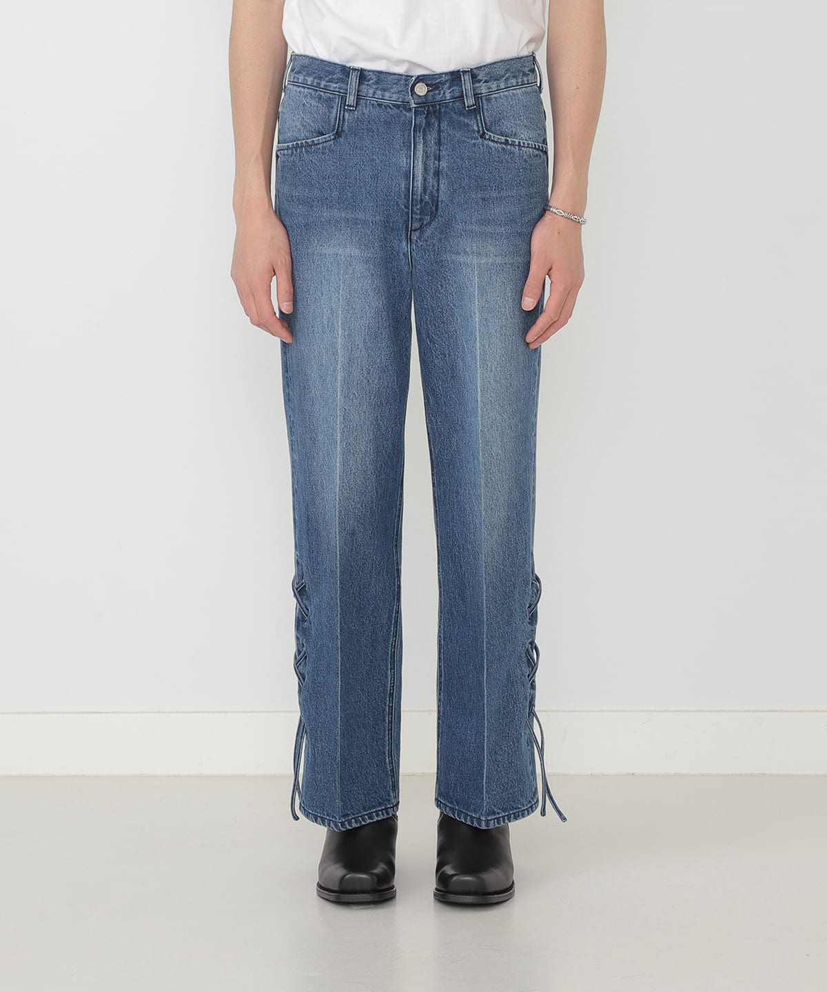 ユーズド加工を施したストレートデニム。サイドの裾に施されたレースが、他にはない個性的な印象をプラス。センタークリースの入ったスラックス型です。